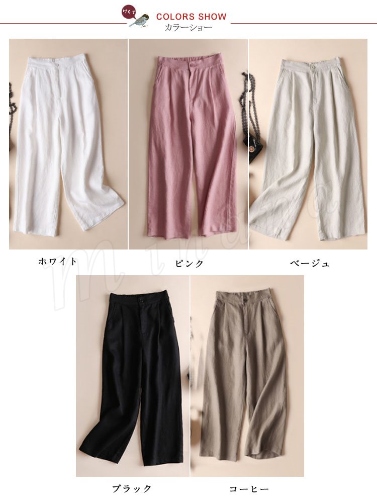 パンツ ガウチョパンツ ワイドパンツ レディース ホトムス 亜麻 体型カバ ロング丈 長め ウエストゴム ブルー 無地 シンプル ゆったり フリンジ