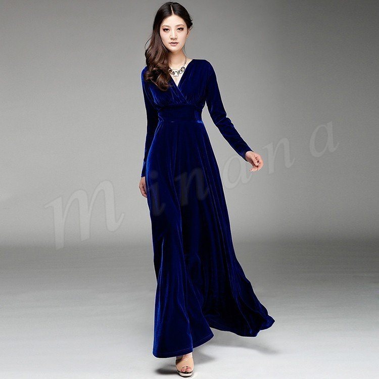 マキシ丈 ワンピース フォーマル パーティードレス Vネック ロングドレス 長袖 ロングワンピース ハイウェスト スリム Vネック