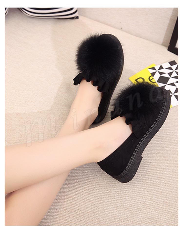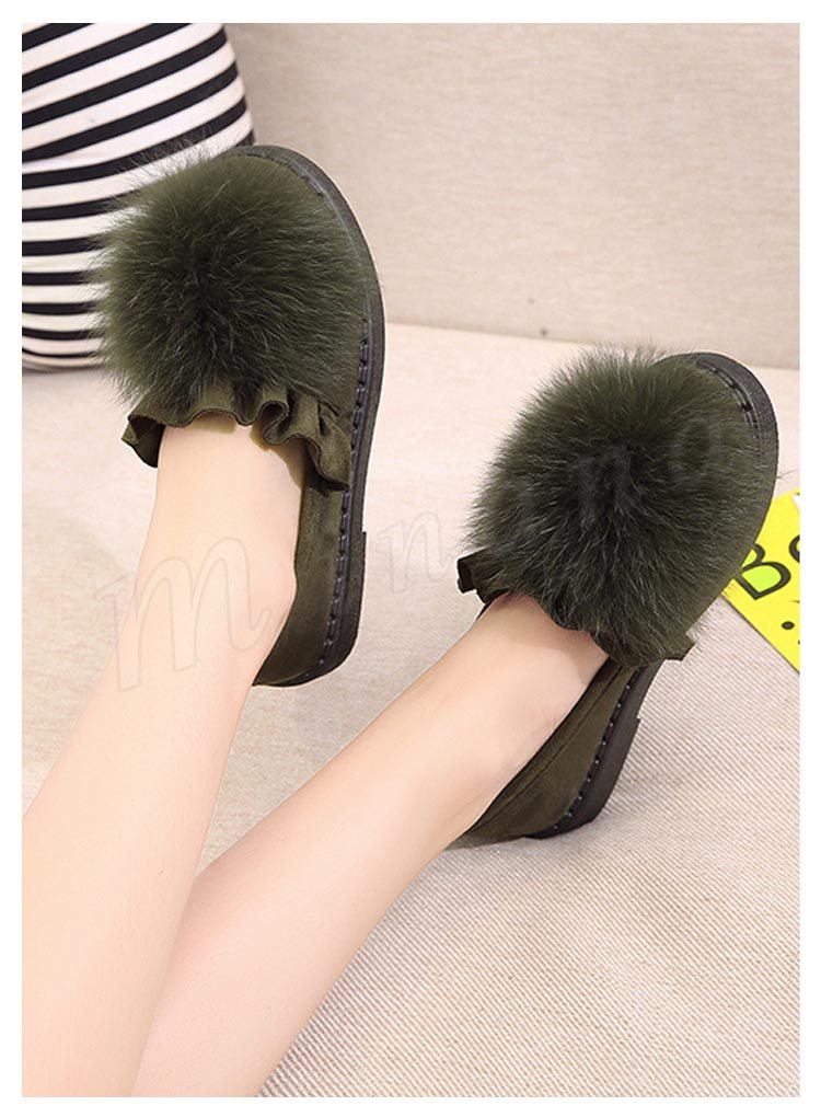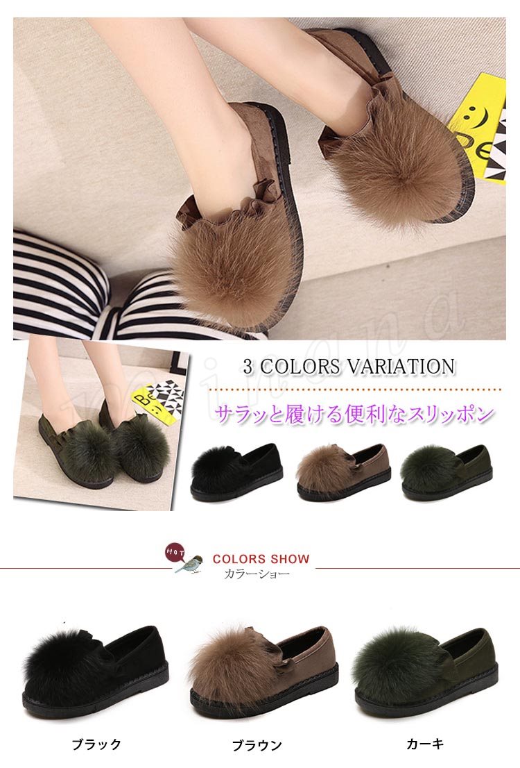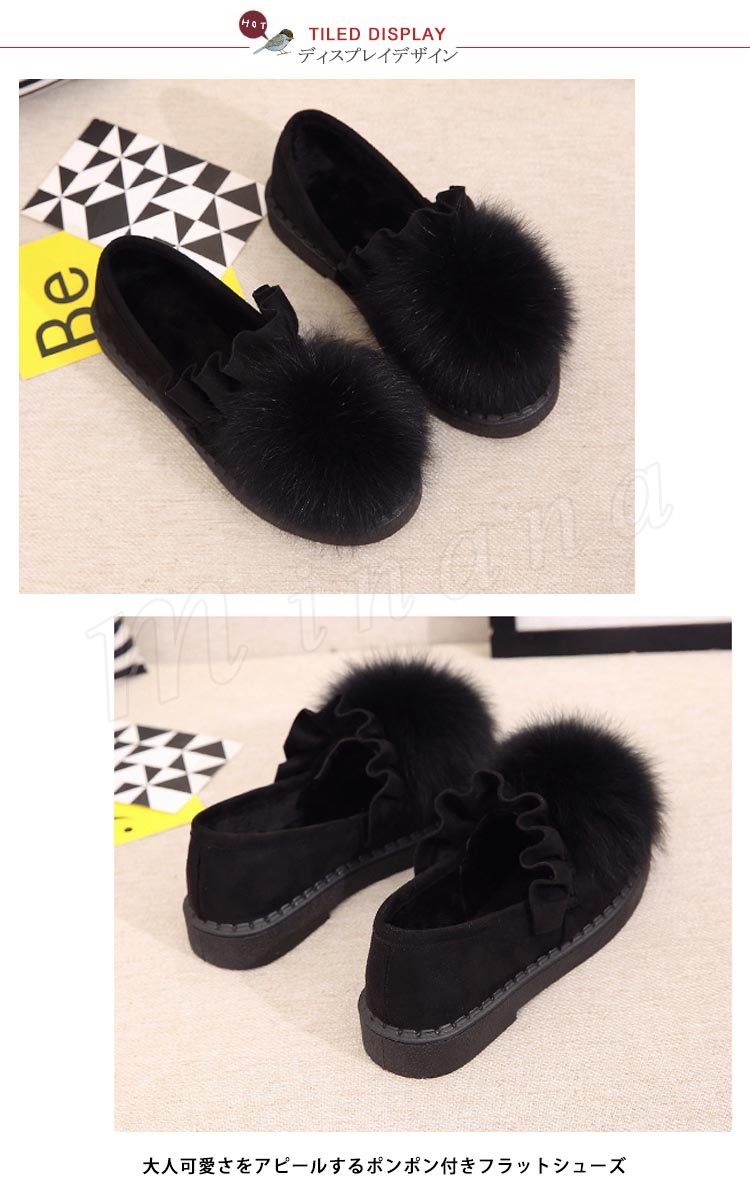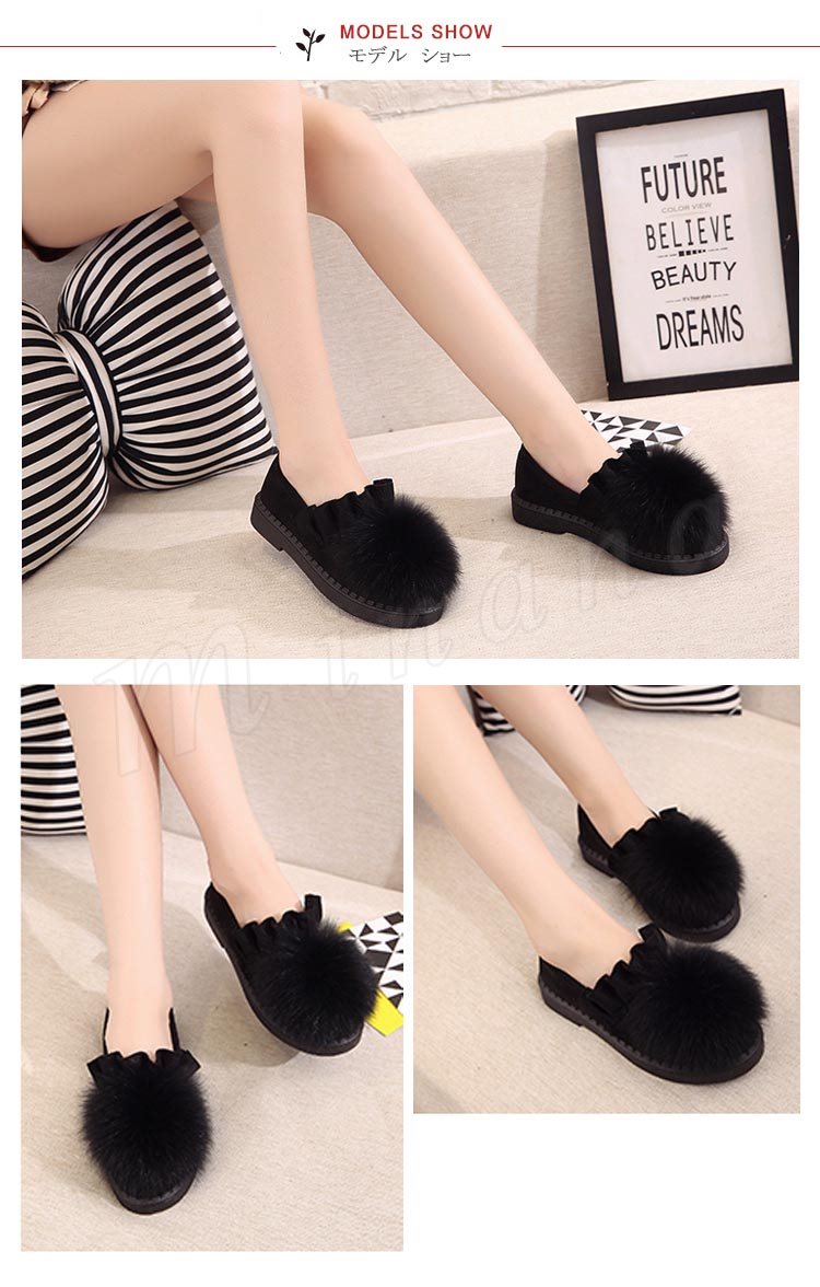 ファー/レディース/シューズ/靴/フラットソール/ローヒール/パンプス/フリル裾/スリッポン/純色/無地/ポンポン/可愛い/エレガント/上品/痛くない