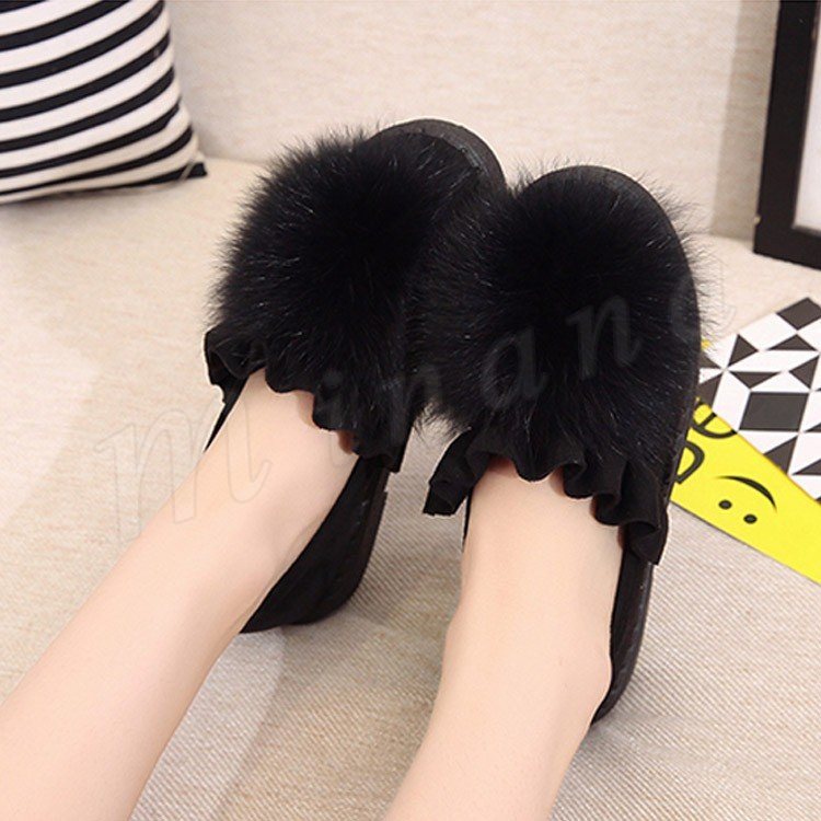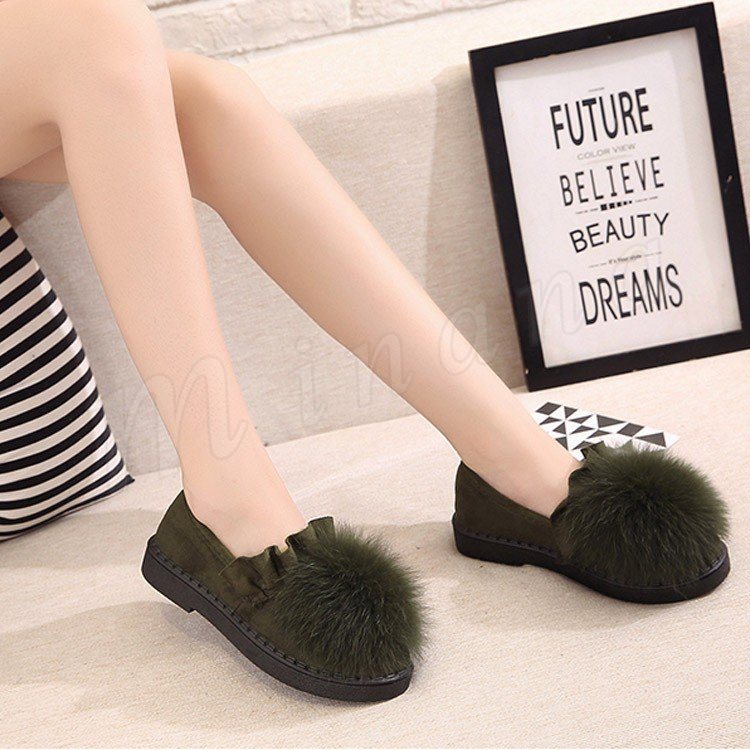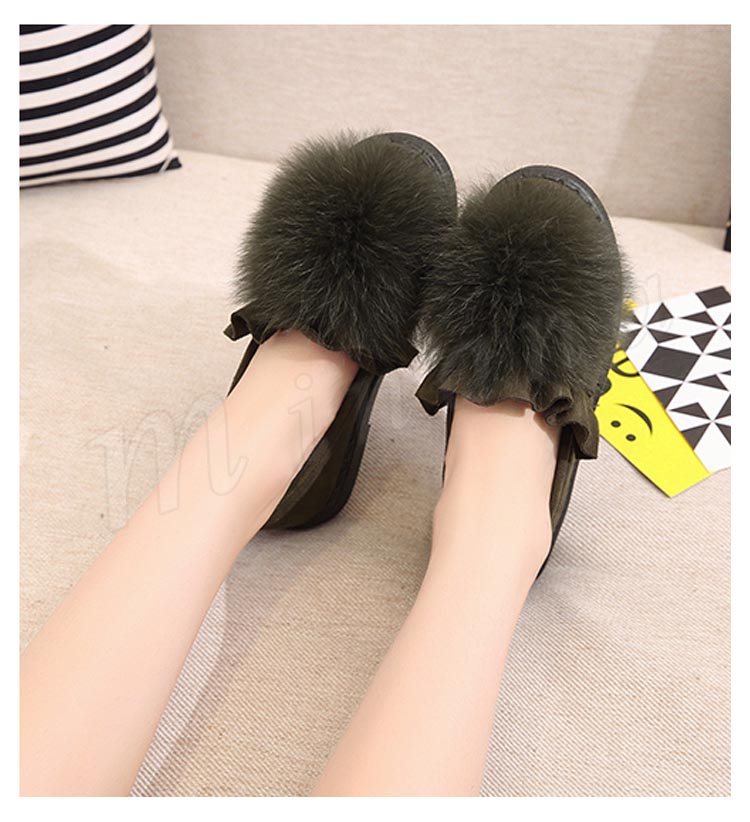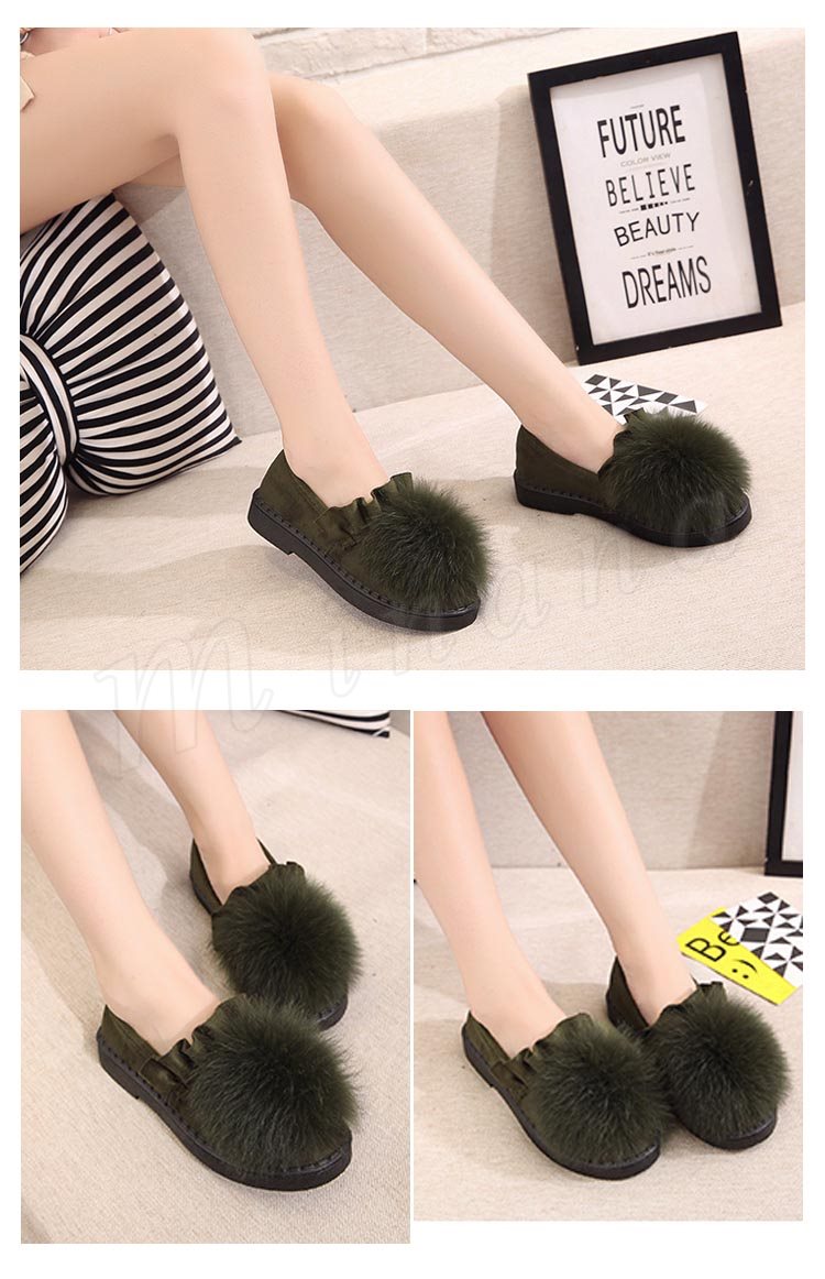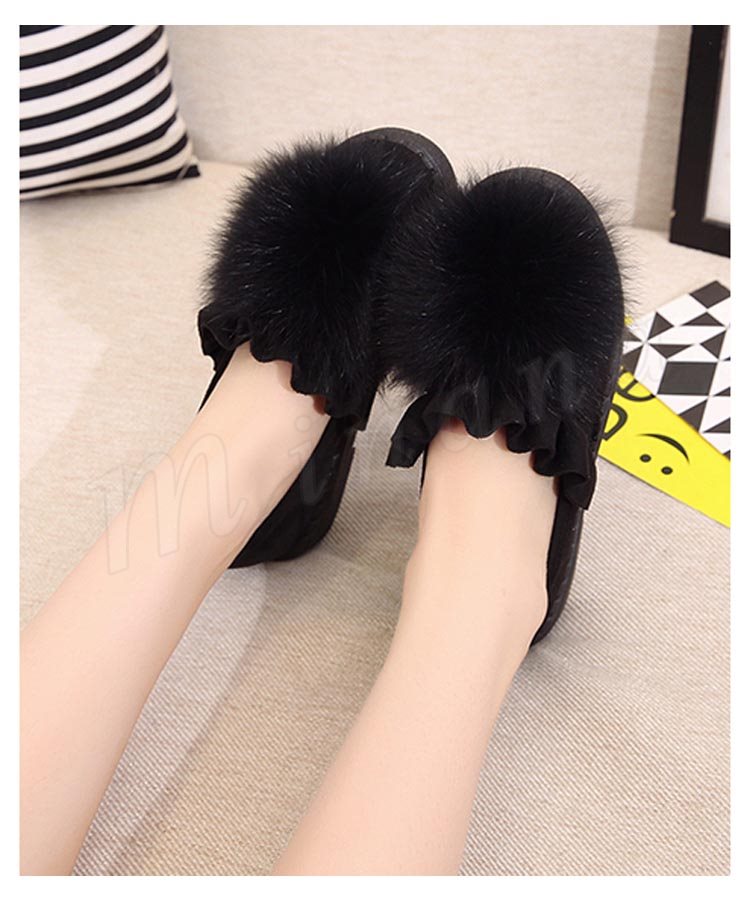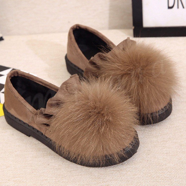 ファー/レディース/シューズ/靴/フラットソール/ローヒール/パンプス/フリル裾/スリッポン/純色/無地/ポンポン/可愛い/エレガント/上品/痛くない