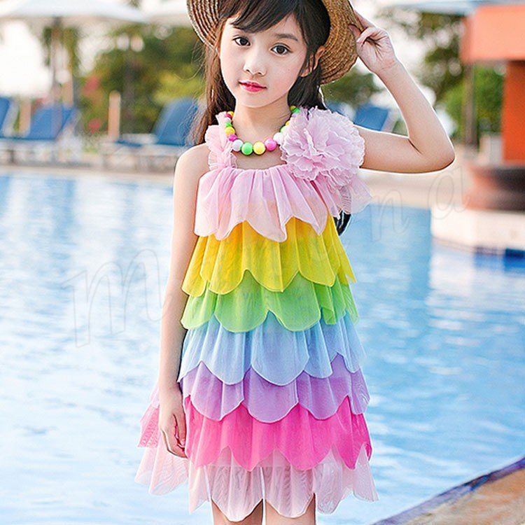 | 女の子ならみんな大好きなレインボーワンピース☆ フロント部分のお花のコサージュが愛らしさをUP! 普段使いにはもちろん、ちょっとしたお呼ばれやフォーマルにも◎ | |