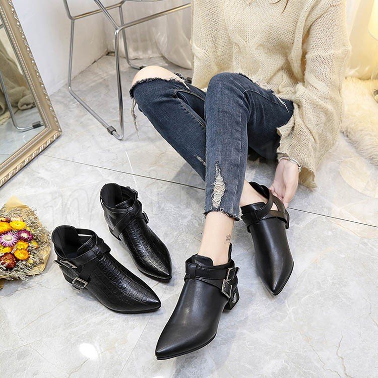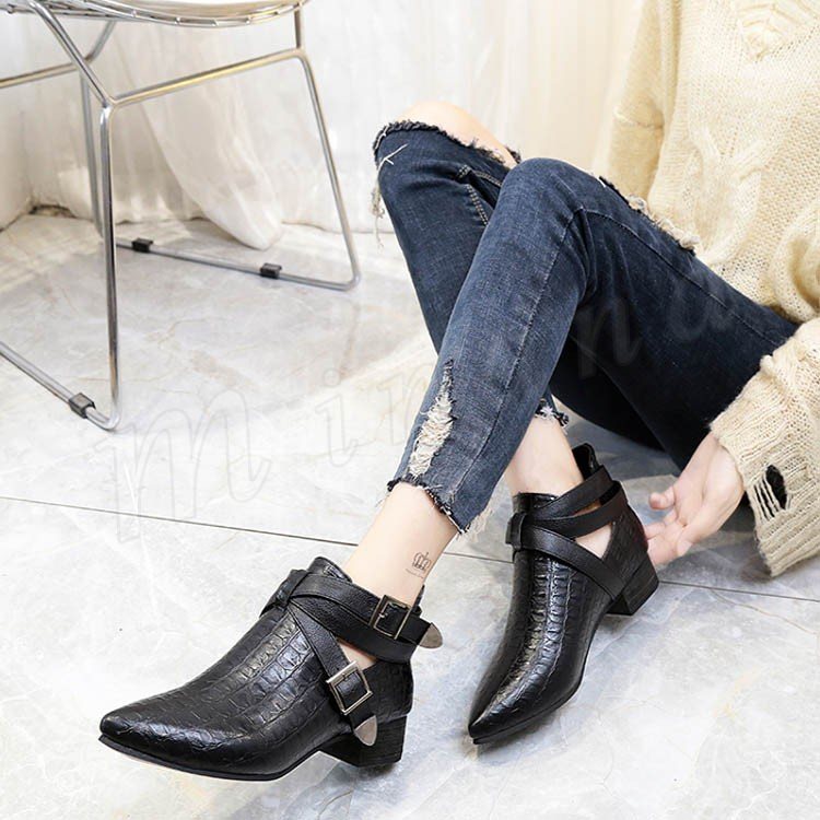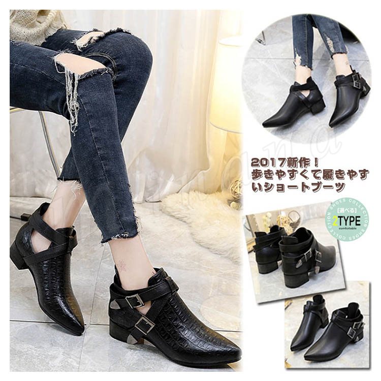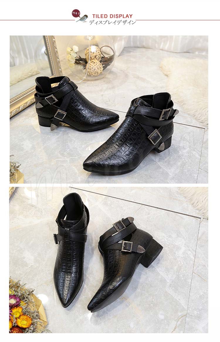 ショートブーツ ベルト ローヒール チャンキーヒール クロコ押し ブーティー アンクルブーツ 新作 秋冬 かわいい 秋物 冬物 秋 冬 レディ
