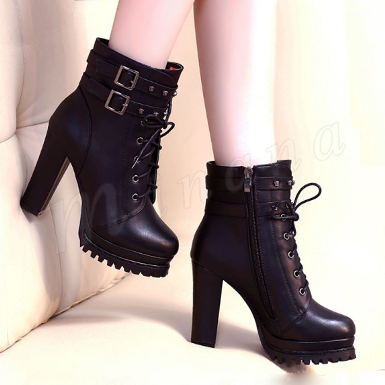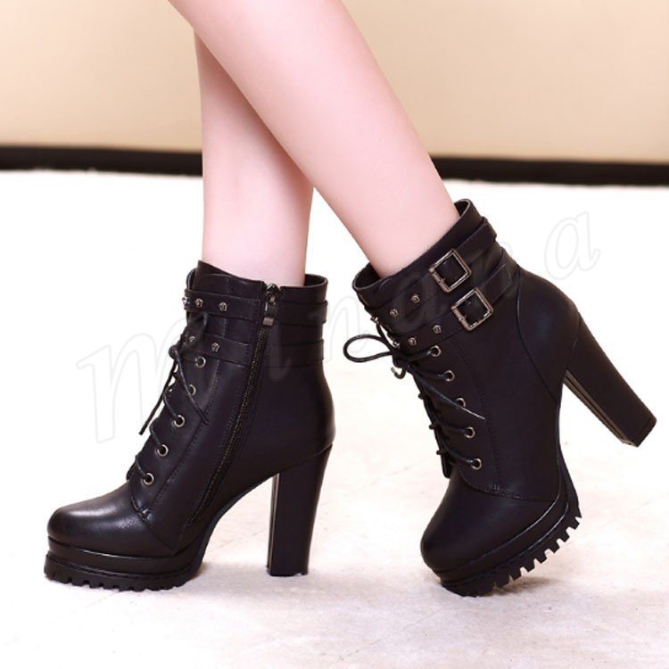 ショートブーツ レースアップブーツ ダブルベルト 編み上げ 太めヒール ブーツ ブーティ 黒 グレー ヒール10.5cm レディース