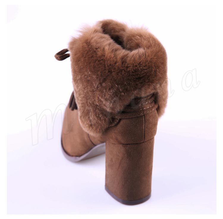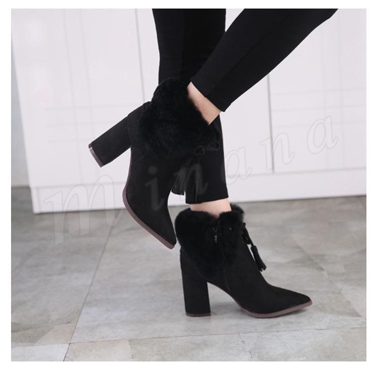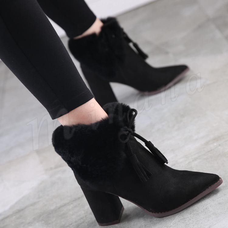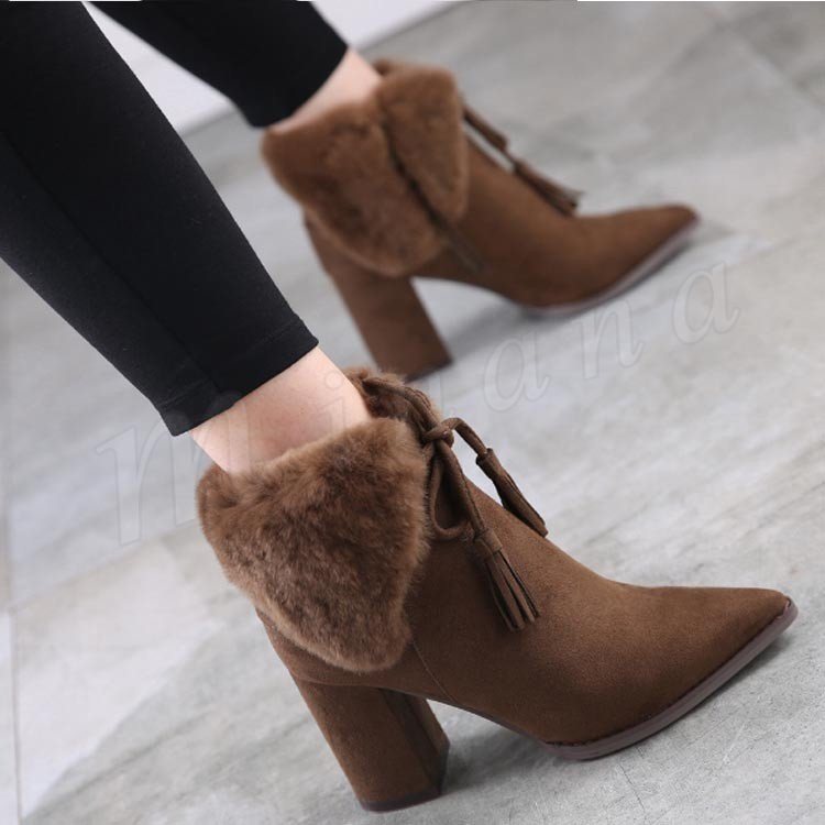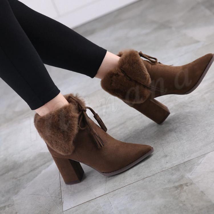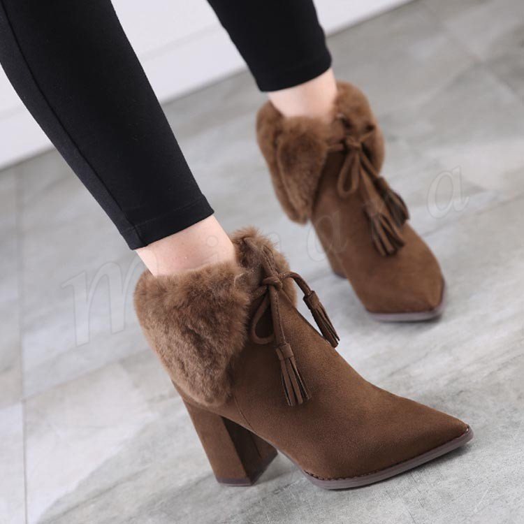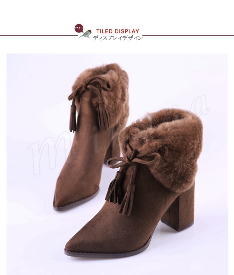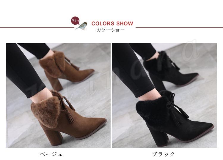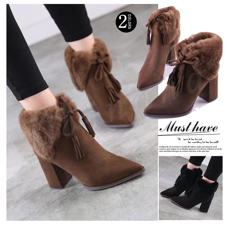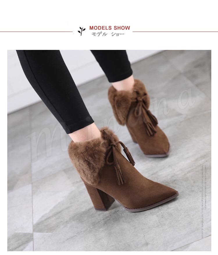 ポインテッドトゥ ショートブーツ レディース ファー付き ヒール ショートブーツ レディース ハイヒール ブーティー チャンキーヒール ブーテ