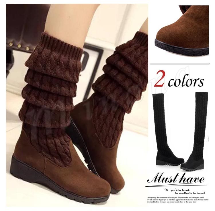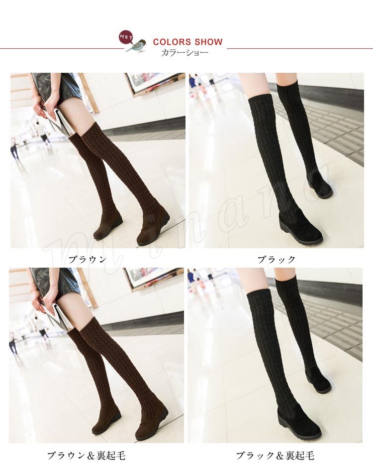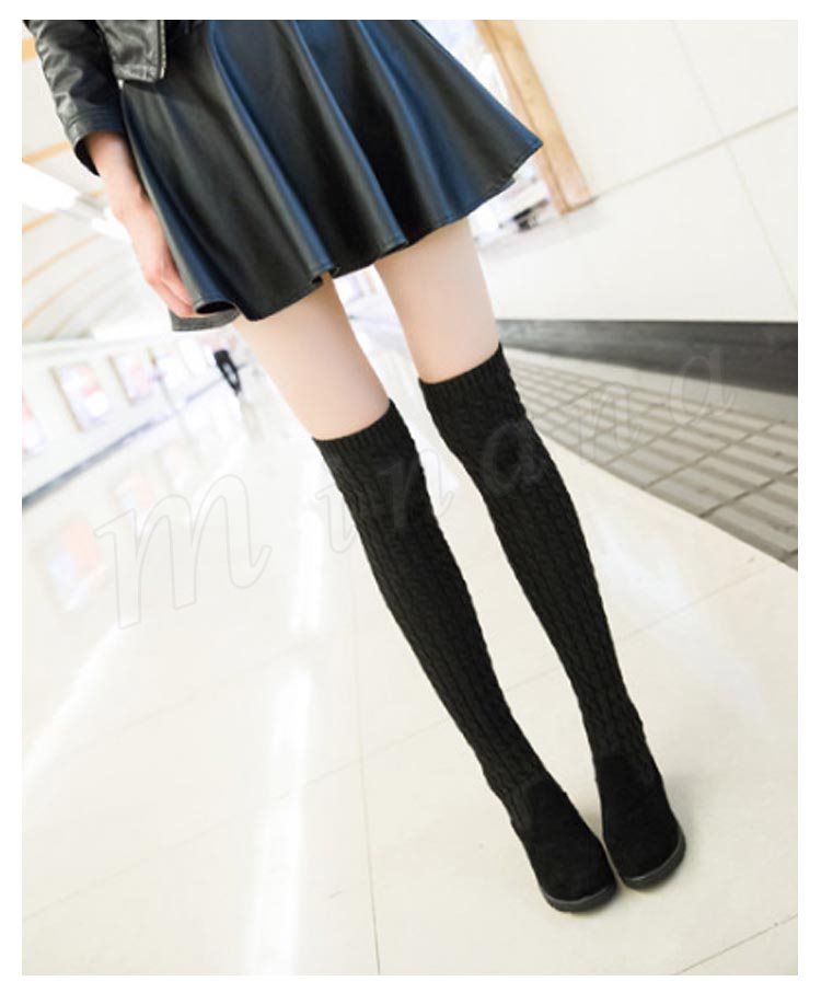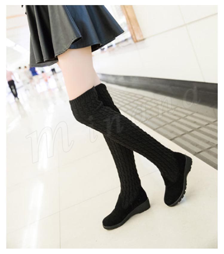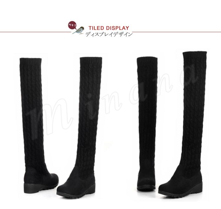 シャーリング/ニーハイ/暖かいニットロングブーツ/ニーハイブーツ/ブラックブーツ