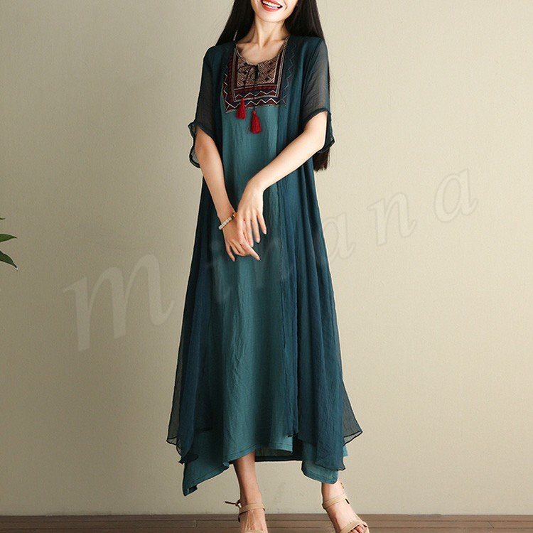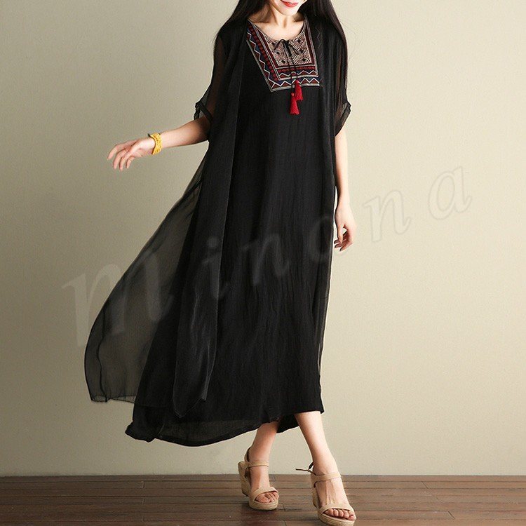 この季節になると恋しくなる素材感。綿麻素材 マキシ丈ワンピース ワンピース 綿麻 リネン ワンピース 麻 エスニック刺繍 ロングワンピース Z