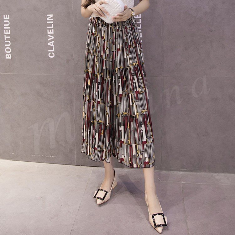 パッと視線を集める、無地&柄プリーツガウチョパンツ ガウチョパンツ スカーチョ マルチストライプ ウエストゴム シフォンスカーチョ シフォンガ