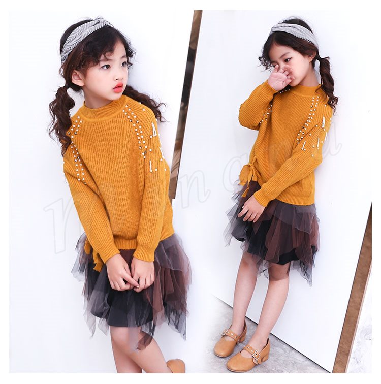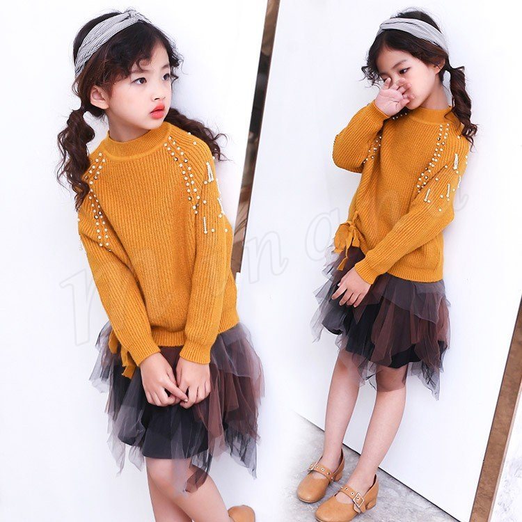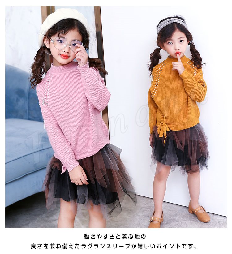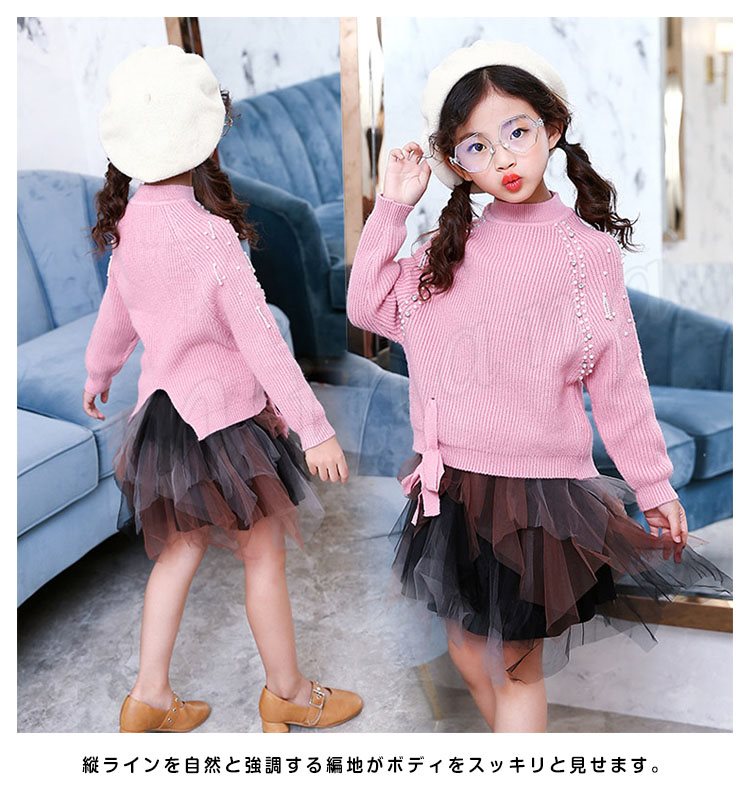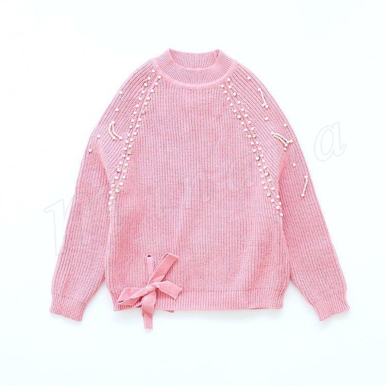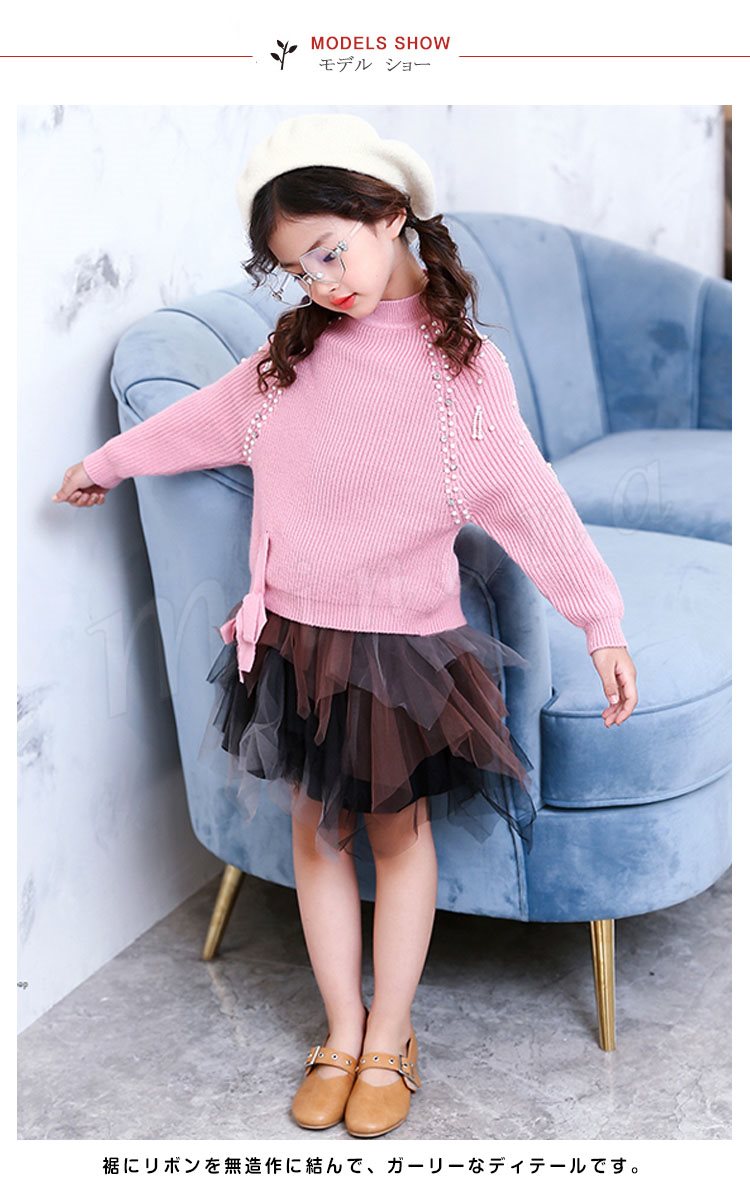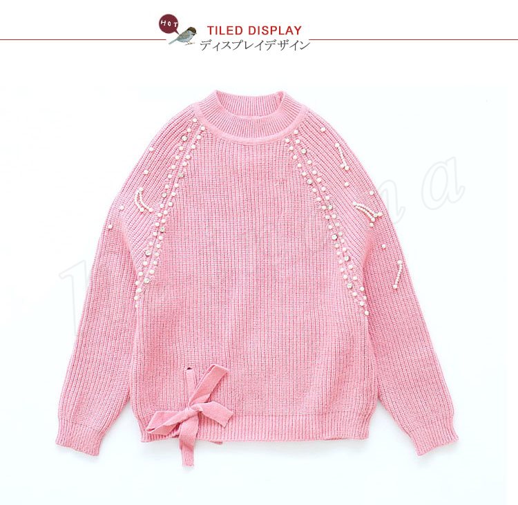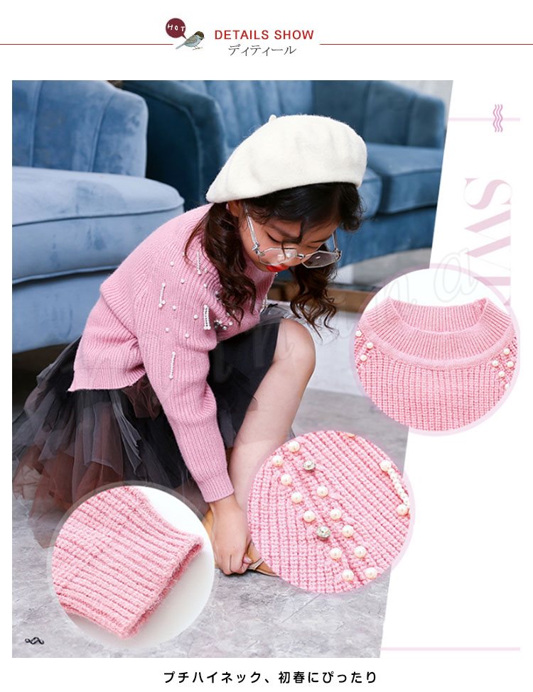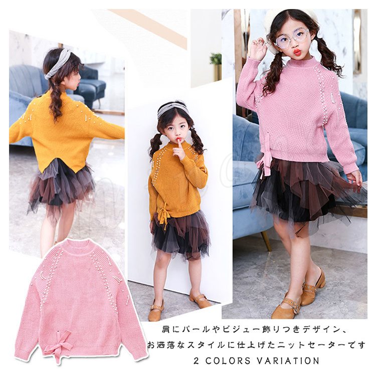肩にパールやビジュー飾りつきデザイン、お洒落なスタイルに仕上げたニットセーター 女の子ニットセーター 子供服 トップス プチハイネック リボン