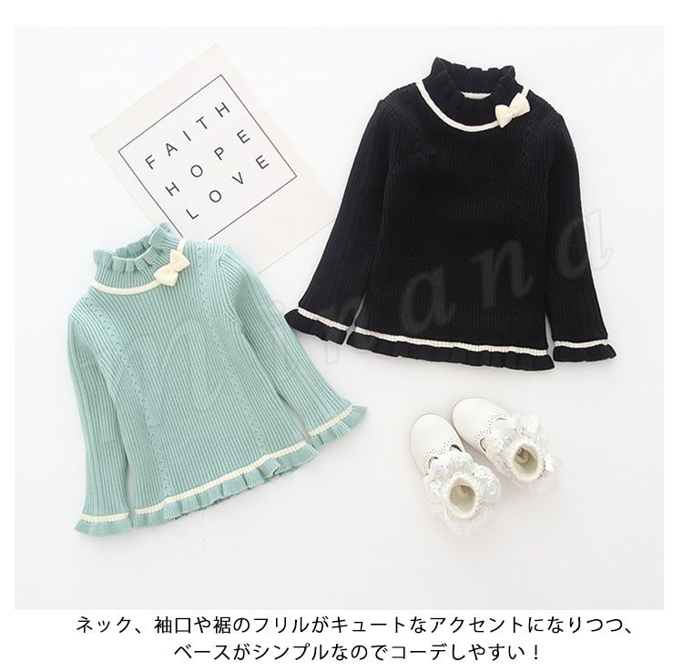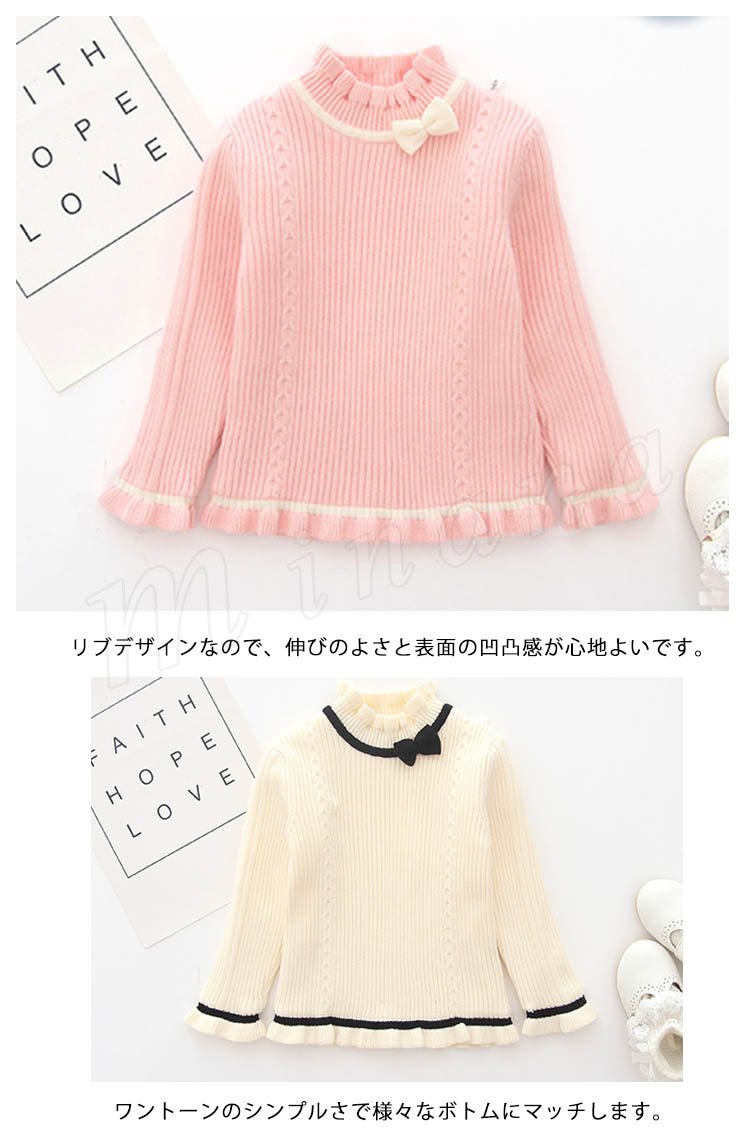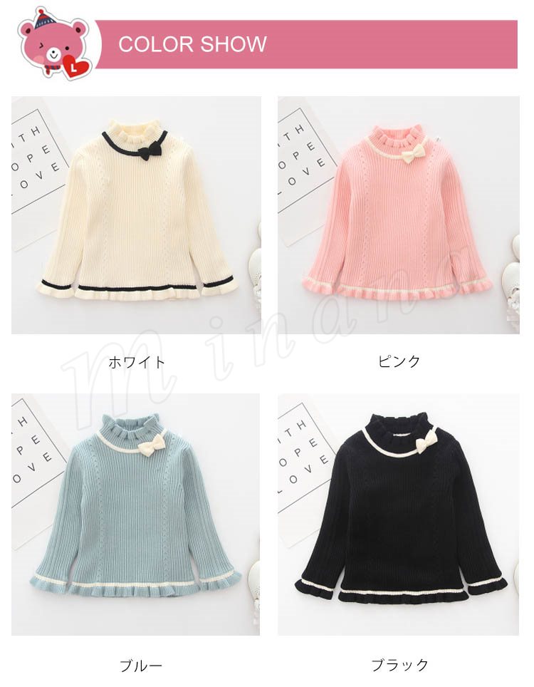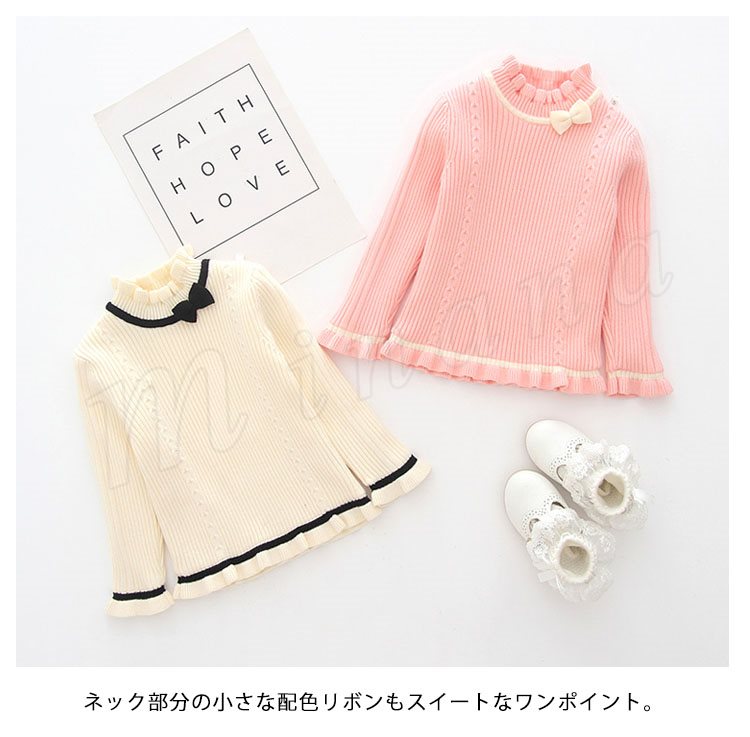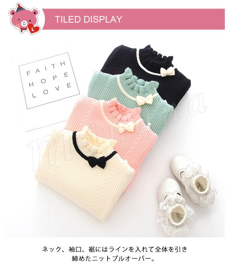 ネック、袖口、裾にはラインを入れて全体を引き締めたニットセーター 女の子ニットセーター 子供服 ベビー服 プルオーバー 配色 フリル リボン
