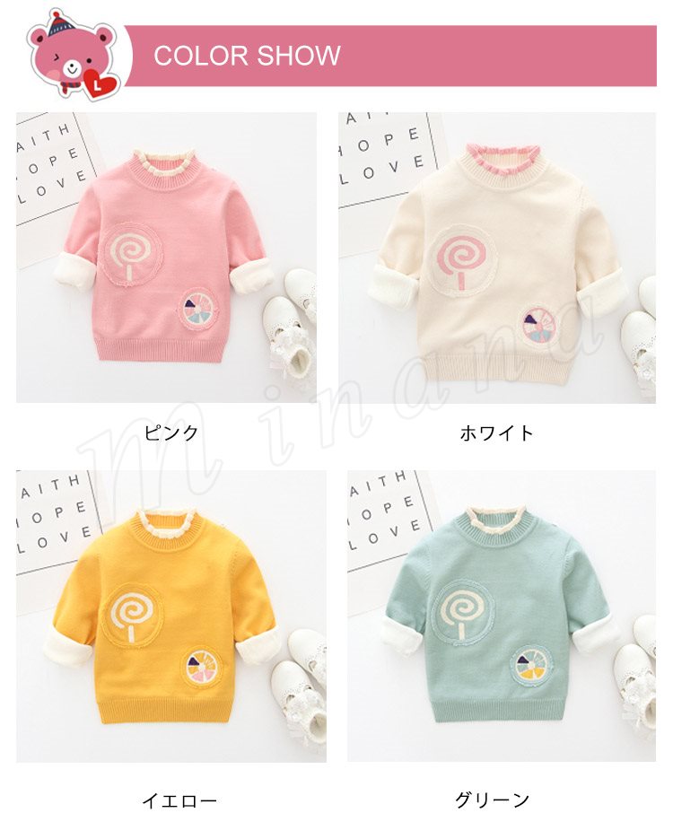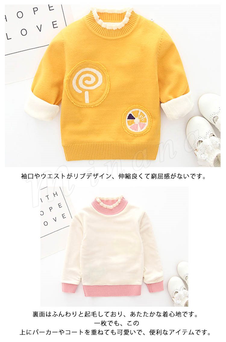| キャンディーモチーフのスウィート満点なニットセーターが登場♪ ネック部分の配色フリルはさり気ないアクセントに! 袖口やウエストがリブデザイン、伸縮良くて窮屈感がないです。 裏面はふんわりと起毛しており、あたたかな着心地です。 一枚でも、この上にパーカーやコートを重ねても可愛いで、便利なアイテムです。 | |