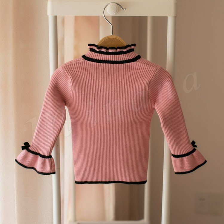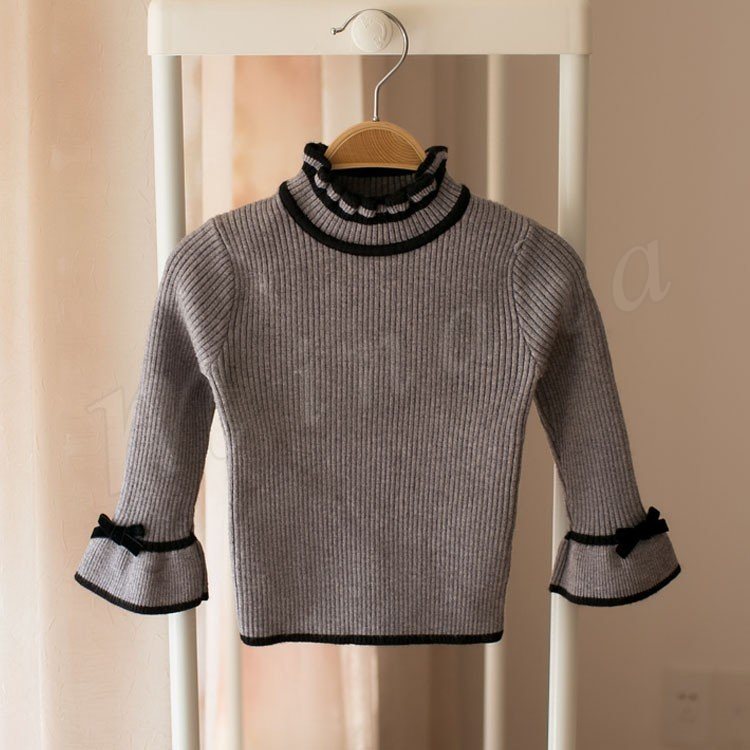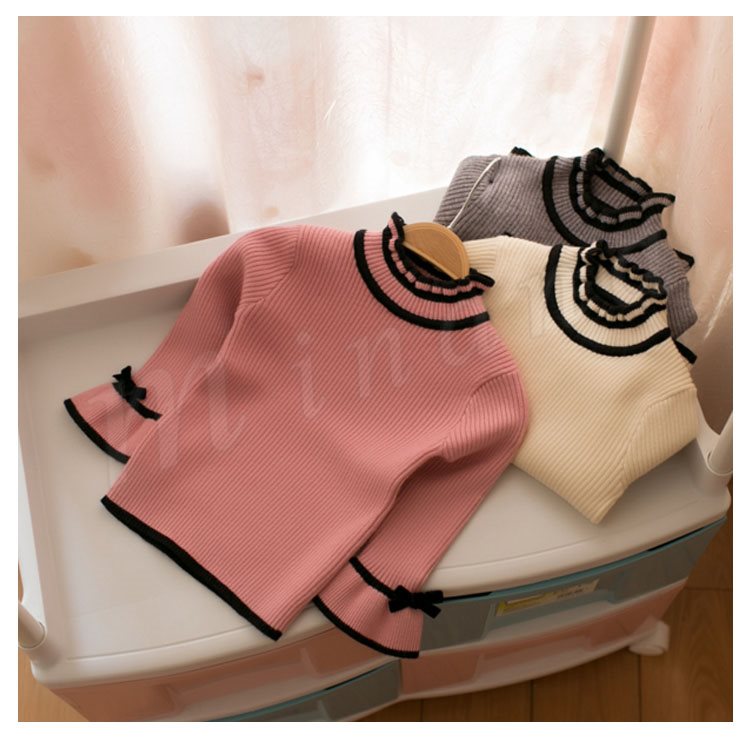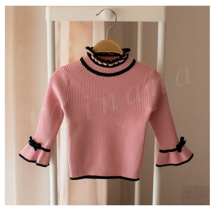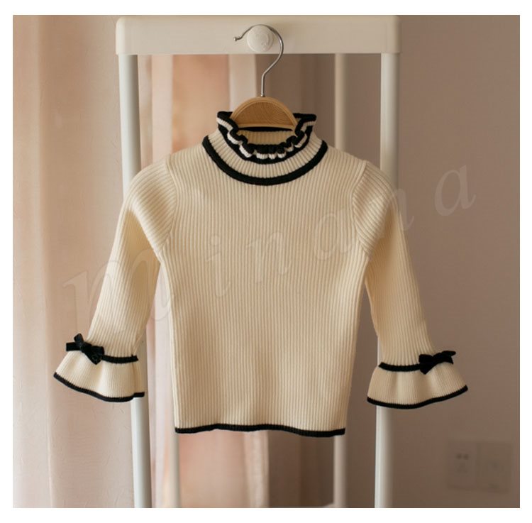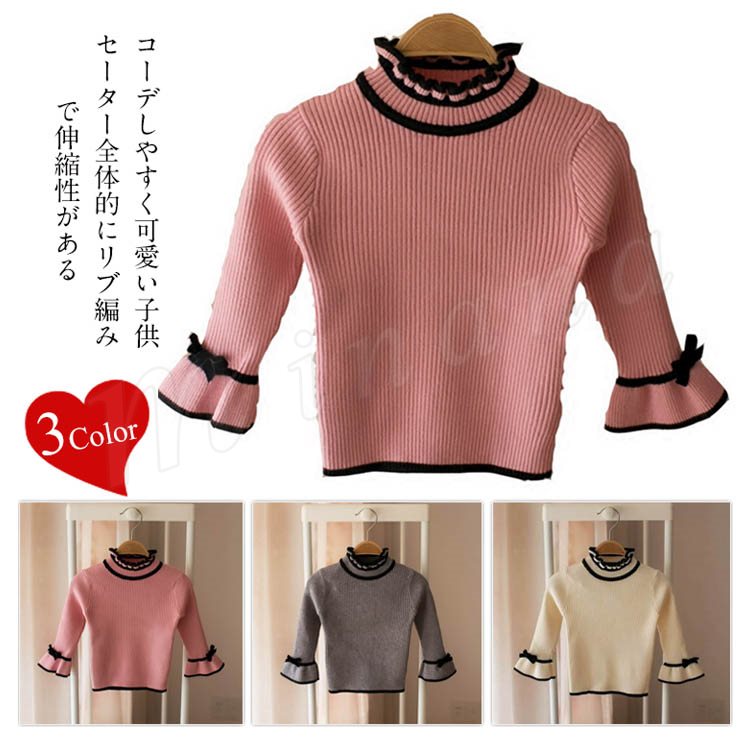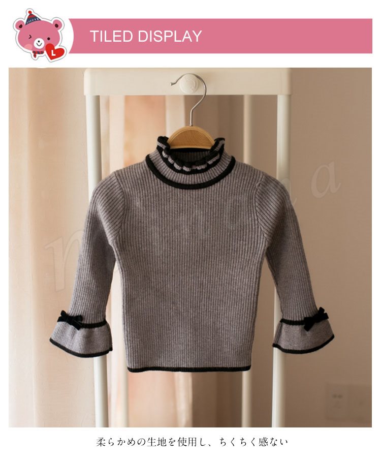 セーター/子供服/女の子/長袖/スタンドカラー/フリル/リボン付き/フレアスリーブ/リブ編み/切り替え/伸縮性/シンプル/カジュアル/スタイリ