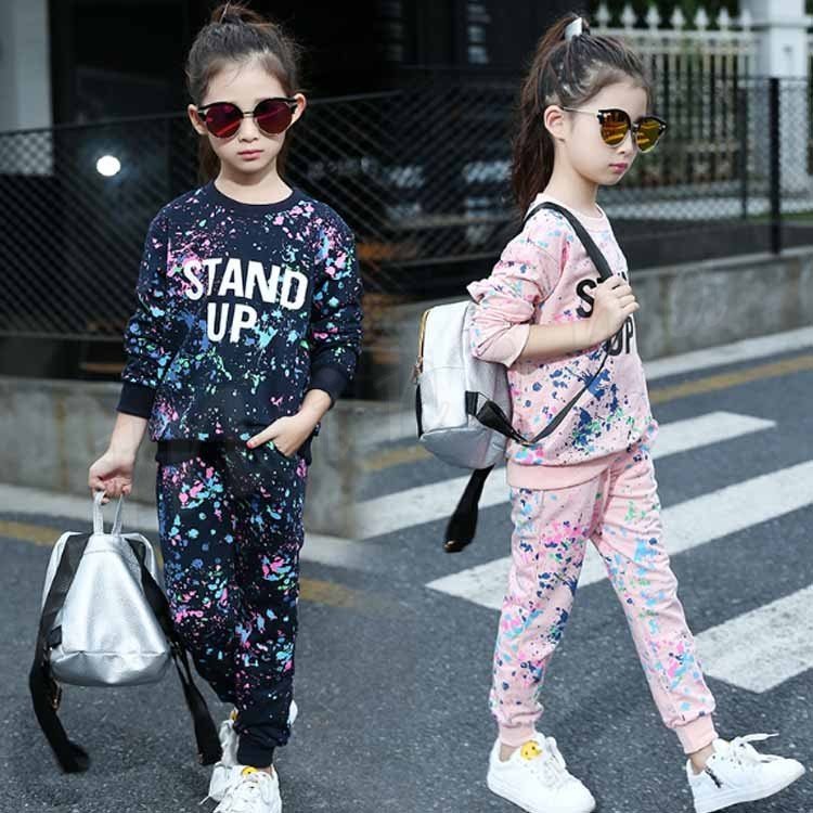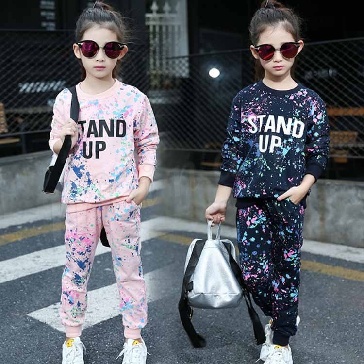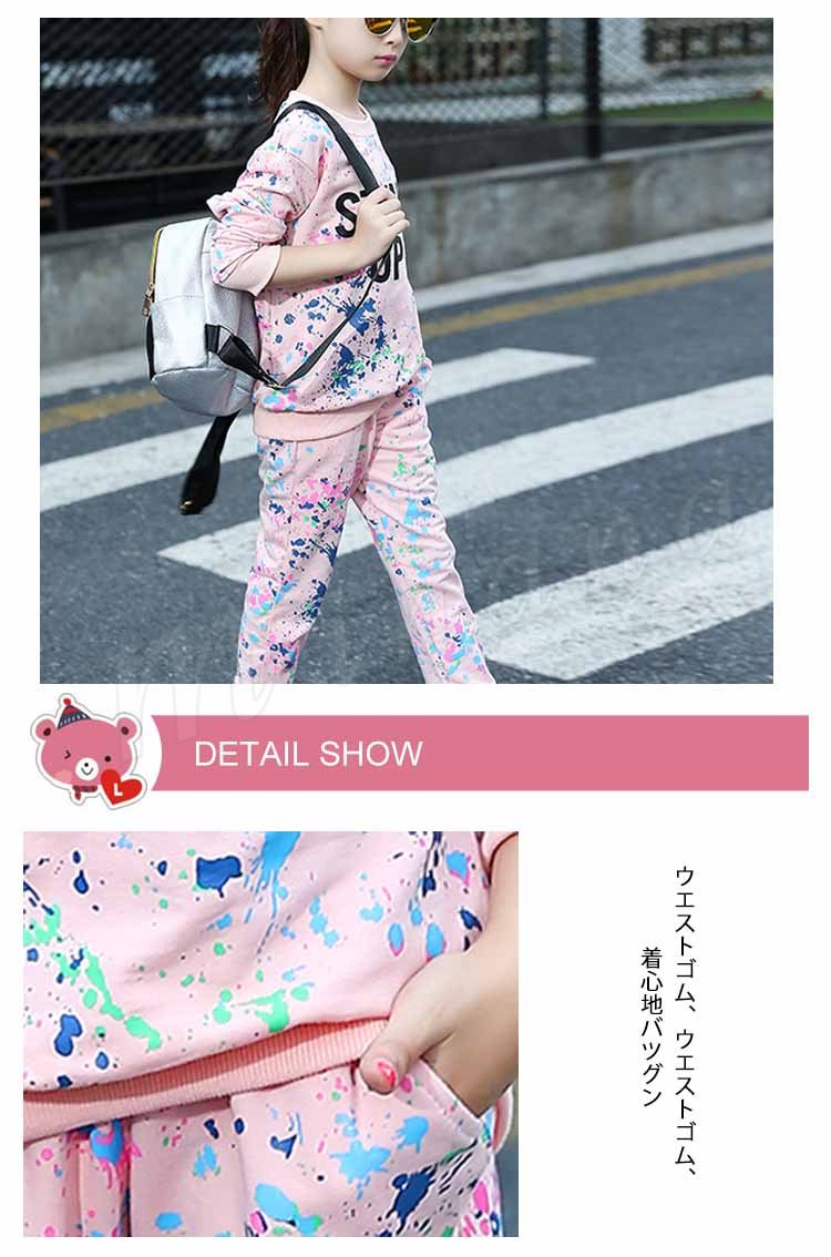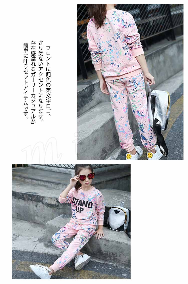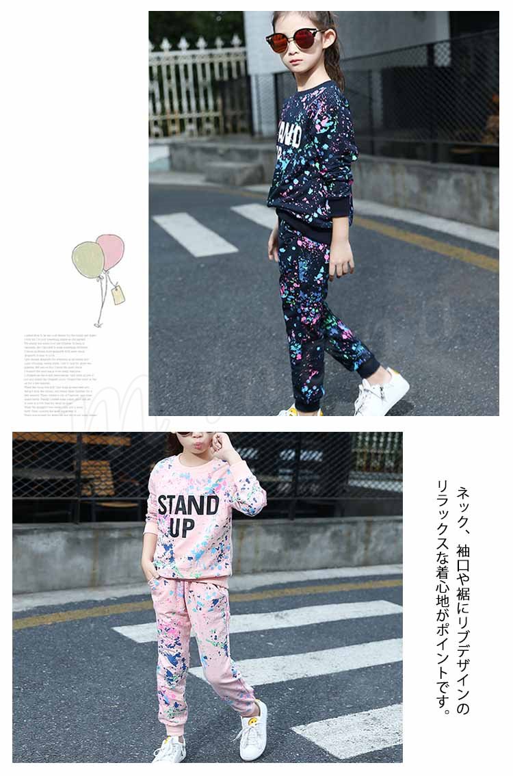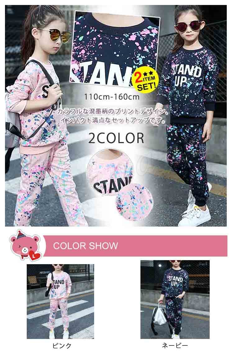 カラフルな溌墨柄のプリントデザイン、インパクト満点なセットアップ 女の子セットアップ Tシャツ×パンツ 2点セット 子供服 総柄 可愛い スマ
