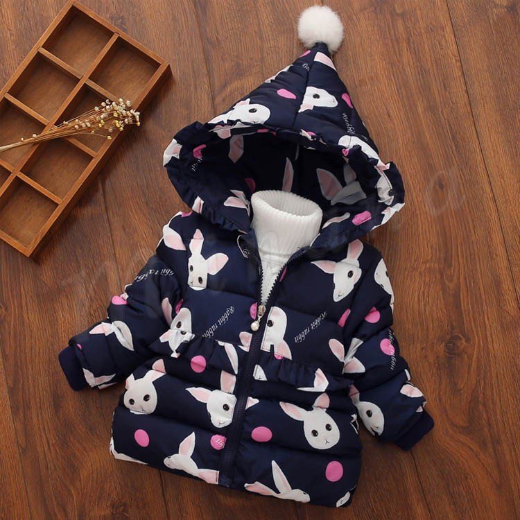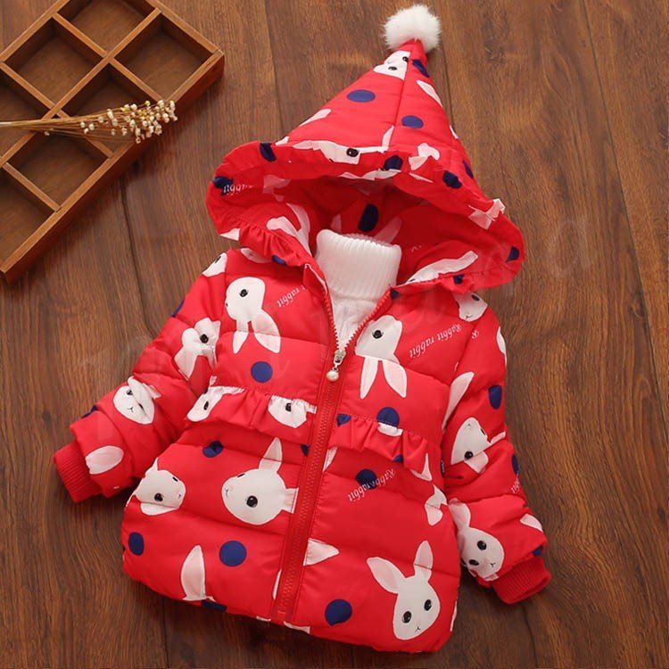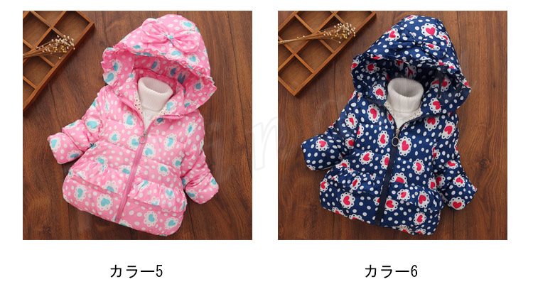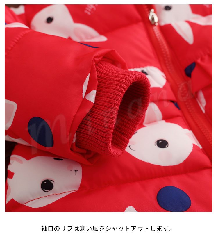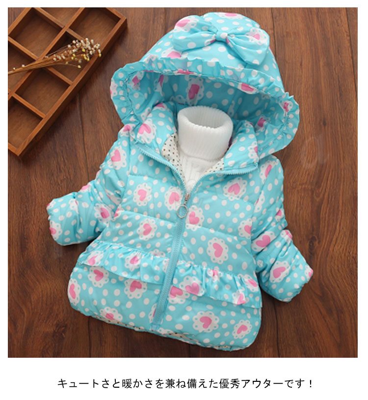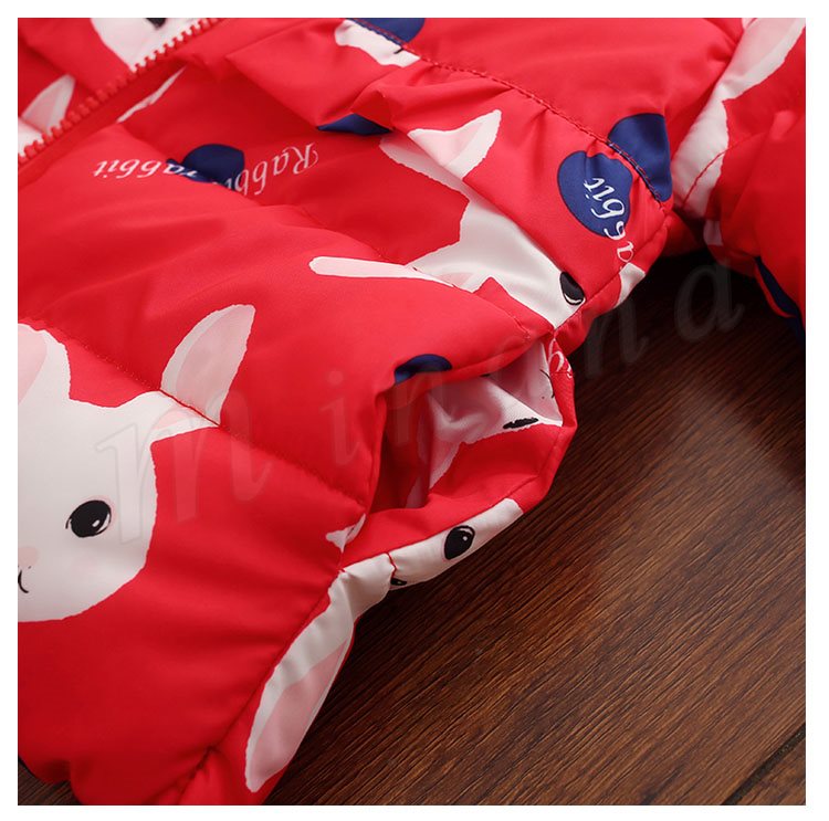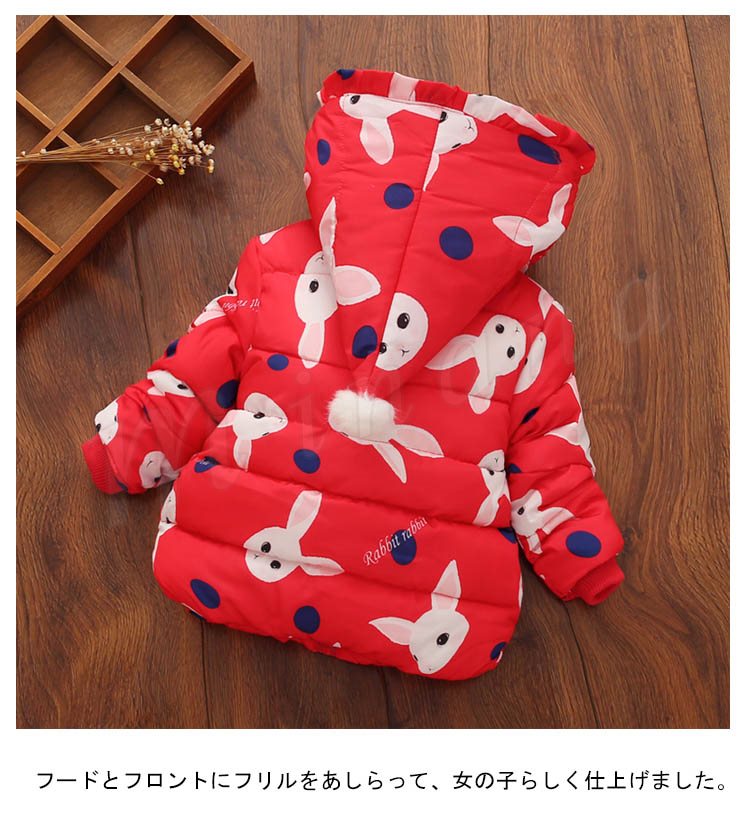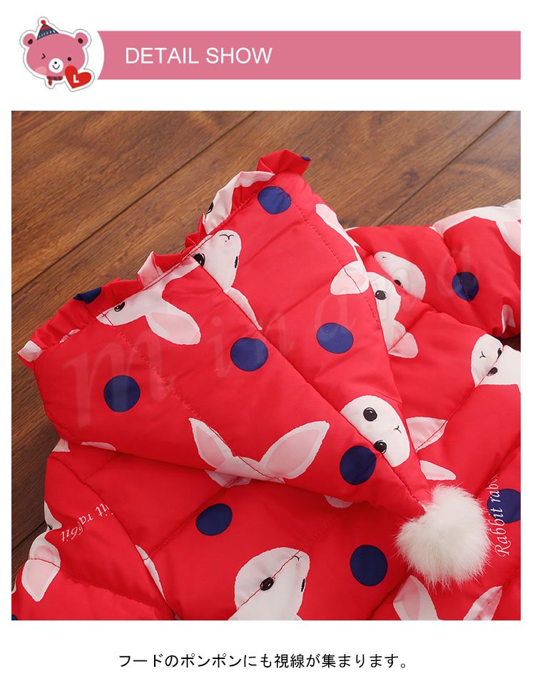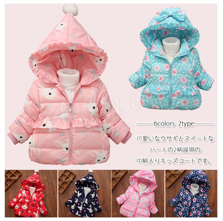 可愛いなウサギとスイートなハートの2柄展開の中綿入りキッズコート 女の子ジャケット アウター 子供アウター フード付き ファスナー パール フ