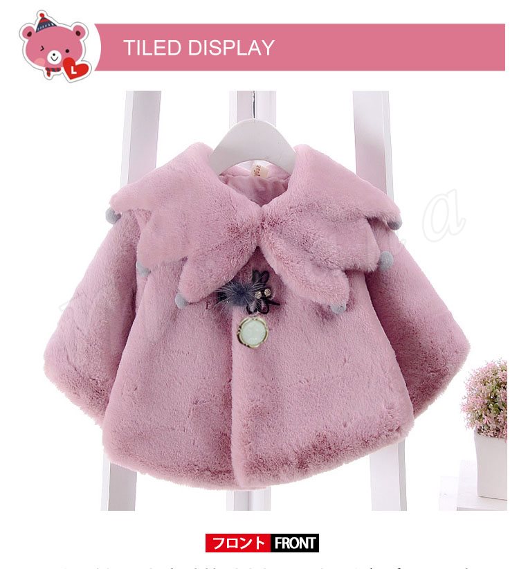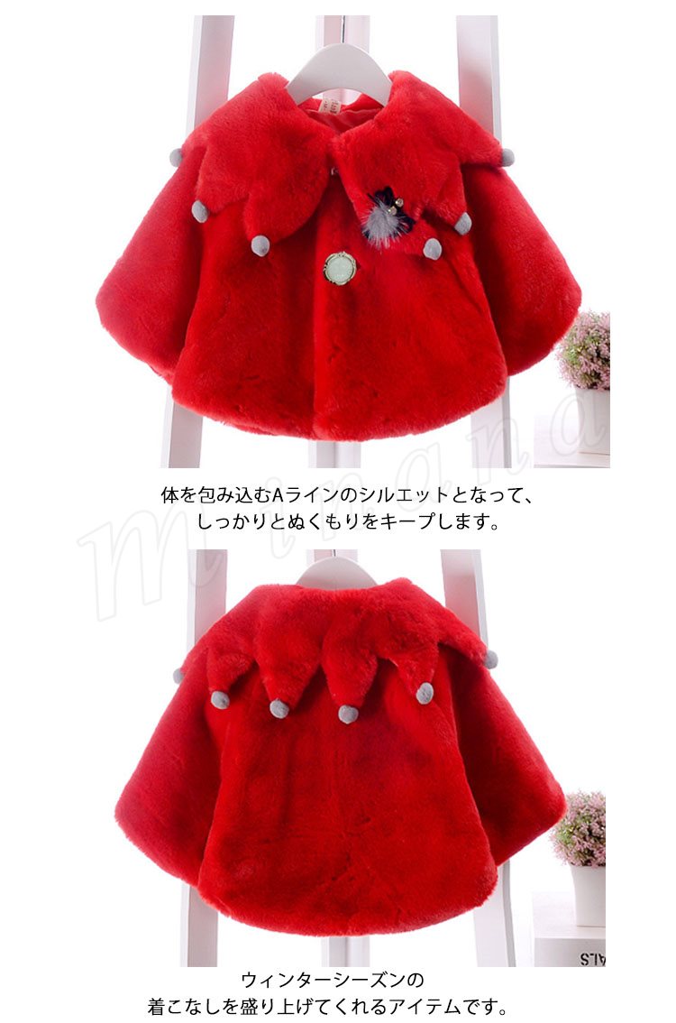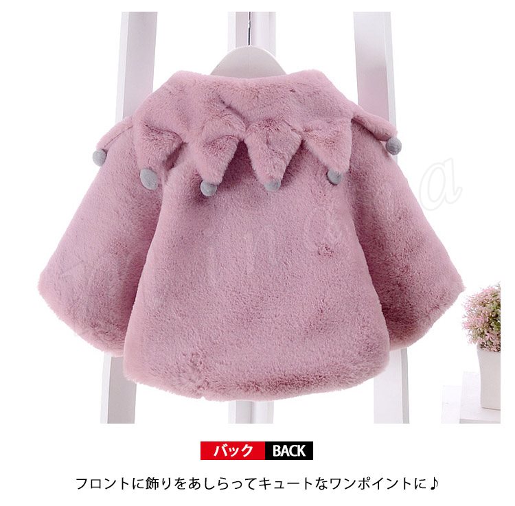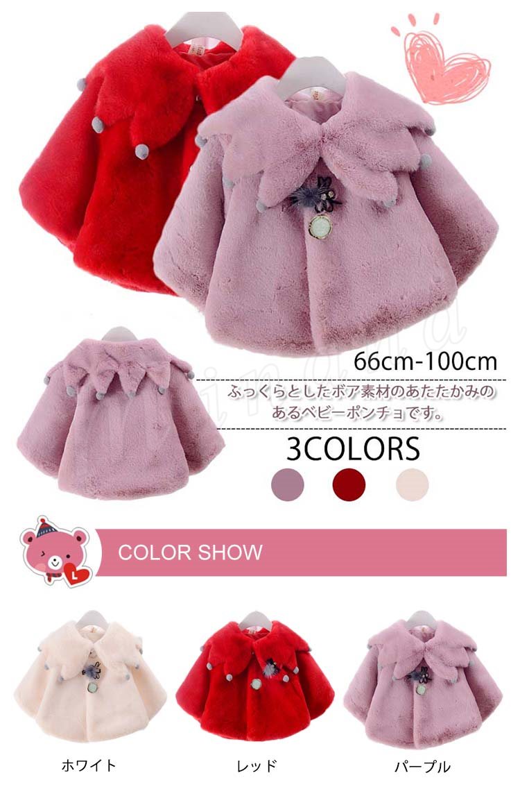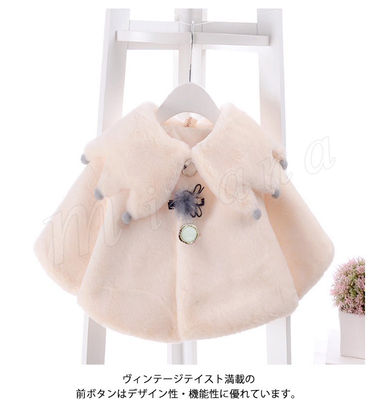 ふっくらとしたボア素材のあたたかみのあるベビーポンチョ 女の子 子供アウター ベビーアウター ケープ マント ヴィンテージ Aライン ポンポン