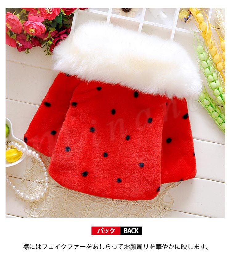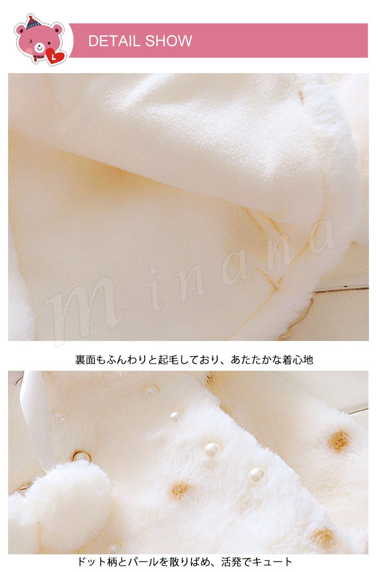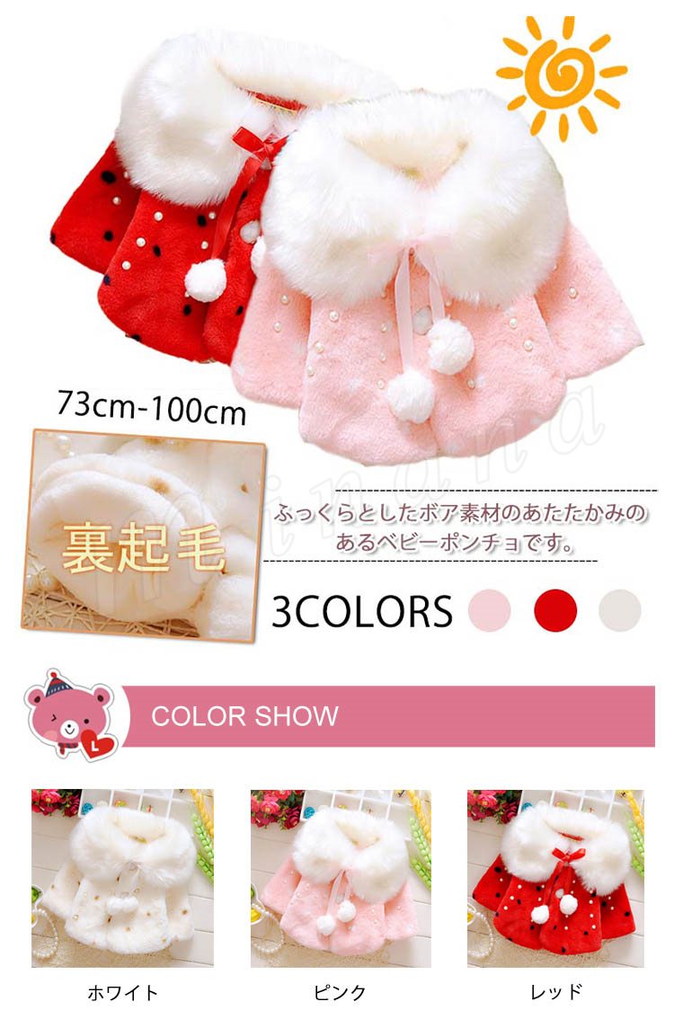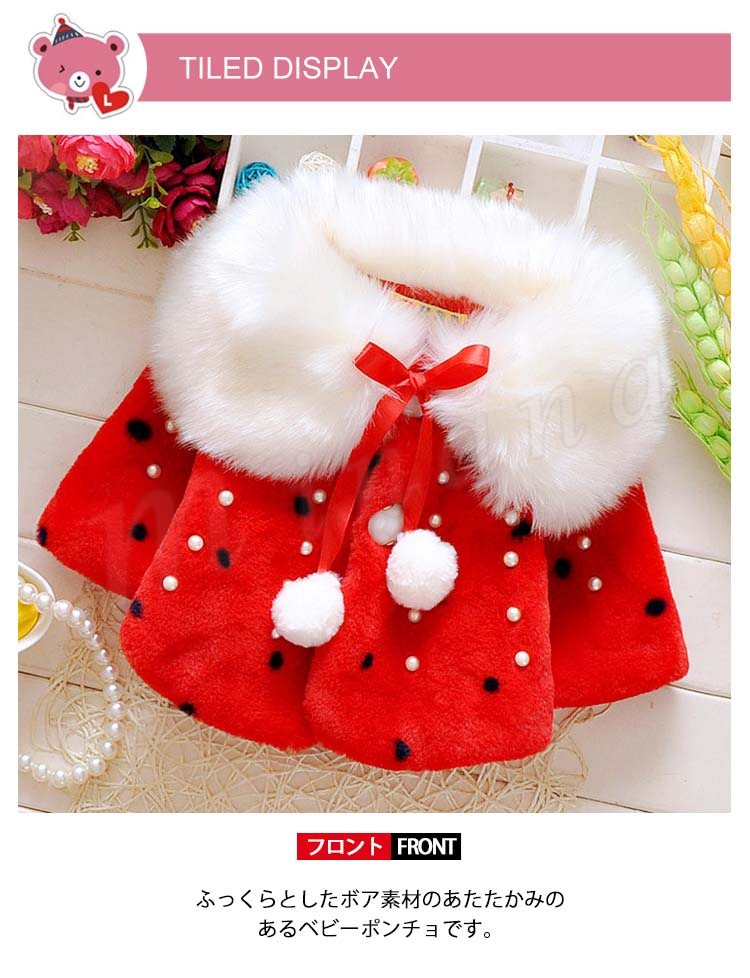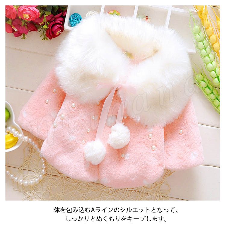 ふっくらとしたボア素材のあたたかみのあるベビーポンチョ 女の子 ケープ マント ベビーアウター フェイクファー トッド柄 パール付き Aライン