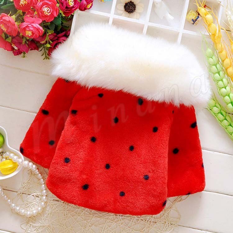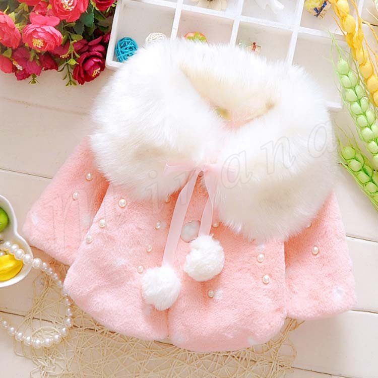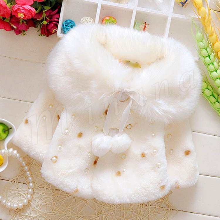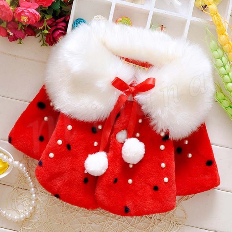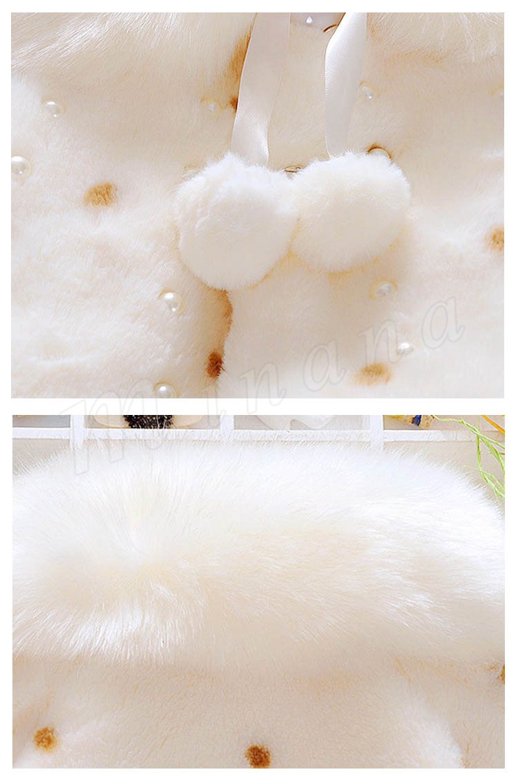 ふっくらとしたボア素材のあたたかみのあるベビーポンチョ 女の子 ケープ マント ベビーアウター フェイクファー トッド柄 パール付き Aライン