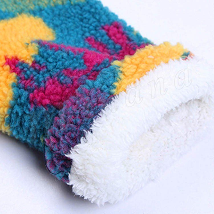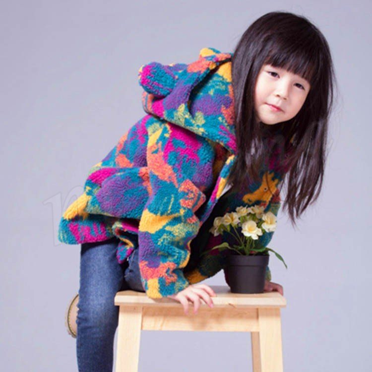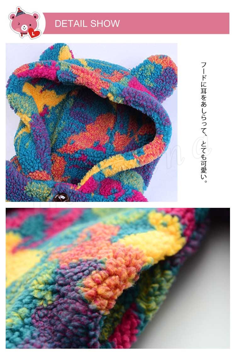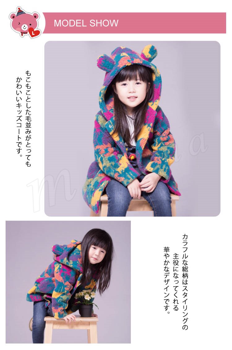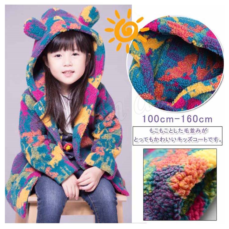 もこもことした毛並みがとってもかわいいキッズコート 女の子アウター 子供アウター ミディアム丈 カラフル 総柄 フード付き モコモコ 可愛い