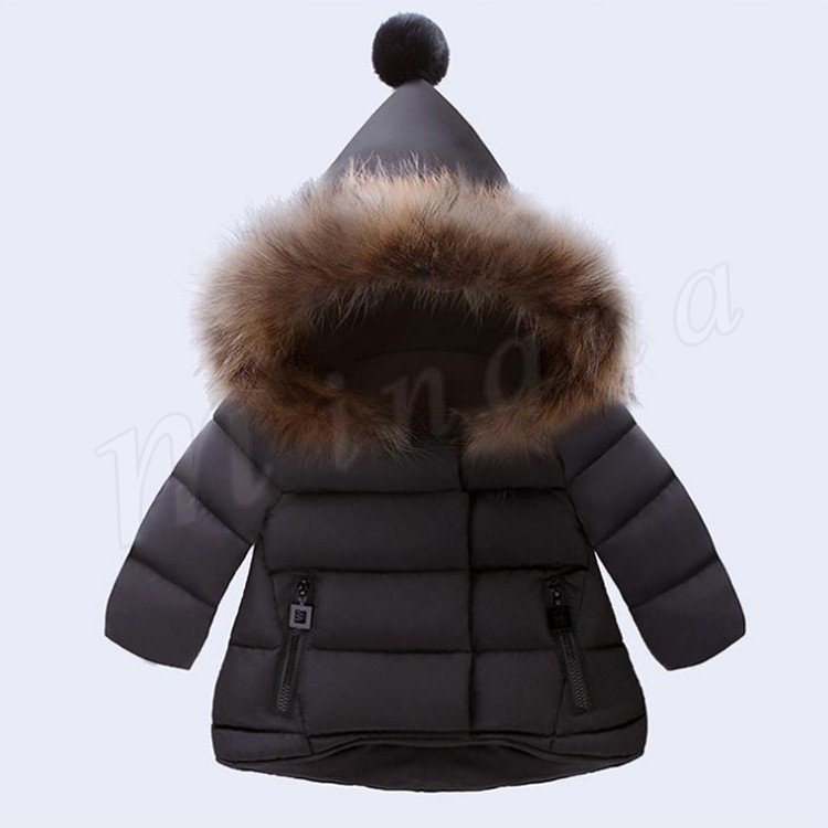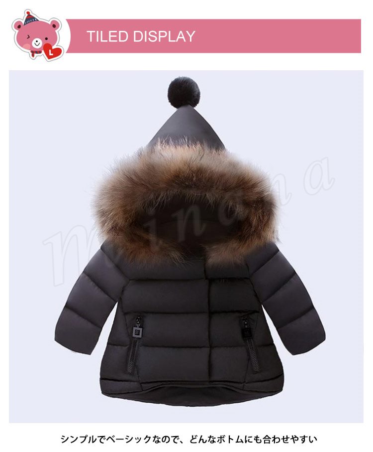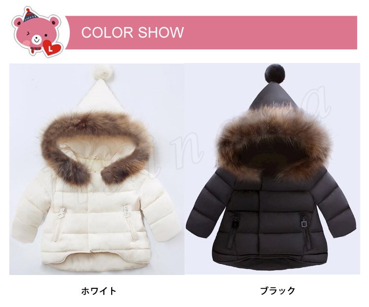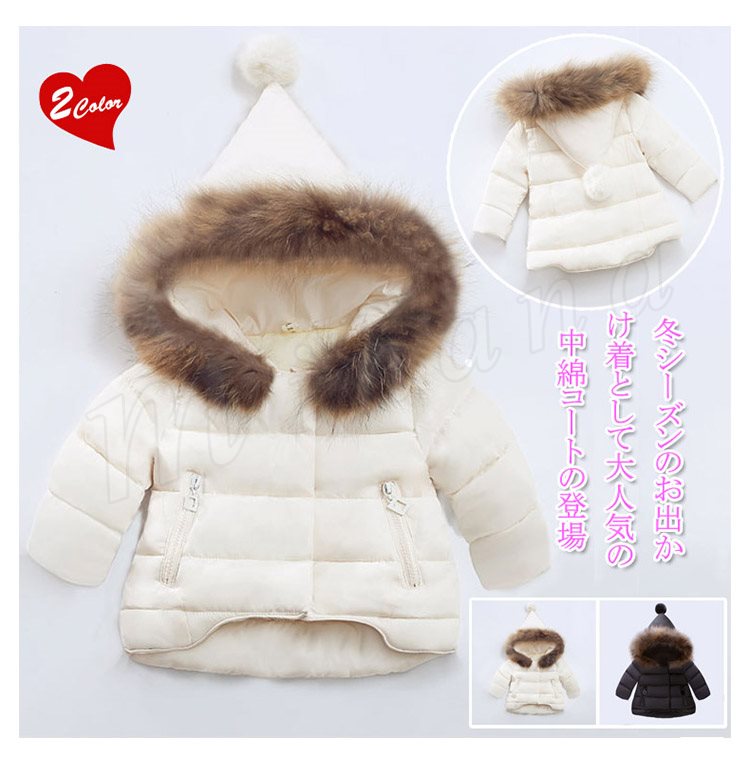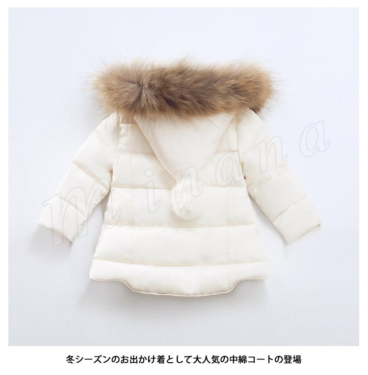 ポンポン付き中綿コート/女の子/ガールズ/子供綿入れコート/ショット丈/フード付き/フェイクファー/80cm/90cm/100cm/110cm