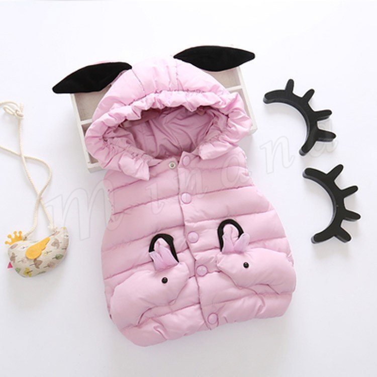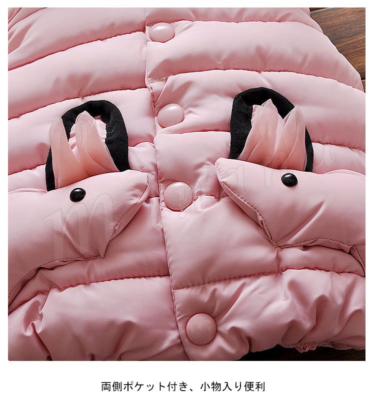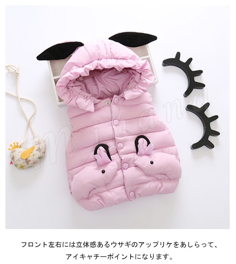 フードにはウサギ耳付き、可愛いなレイヤードスタイルが完成するキッズ中綿入りベスト 女の子ベスト 子供服 キャザー 可憐 アップリケ オシャレ