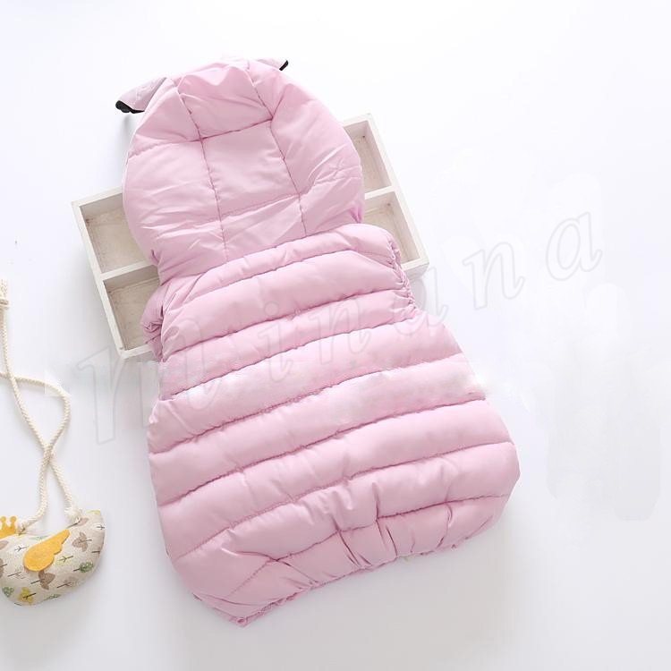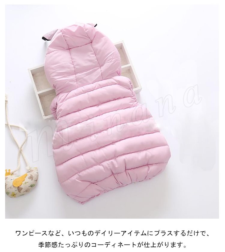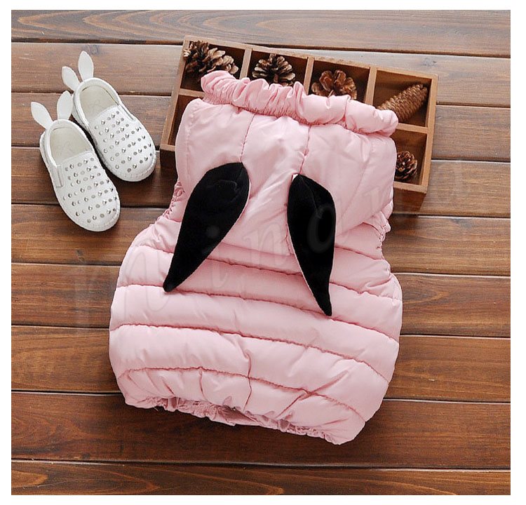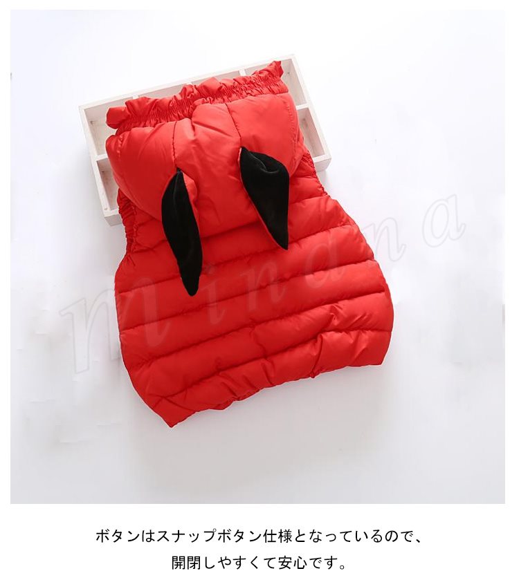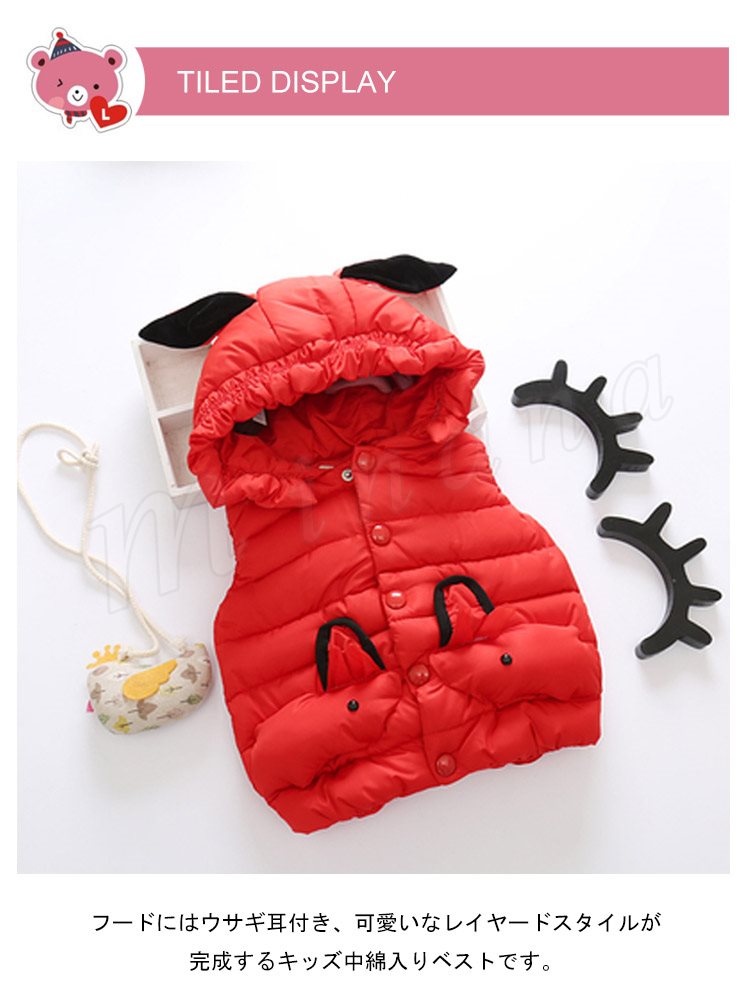 フードにはウサギ耳付き、可愛いなレイヤードスタイルが完成するキッズ中綿入りベストです。