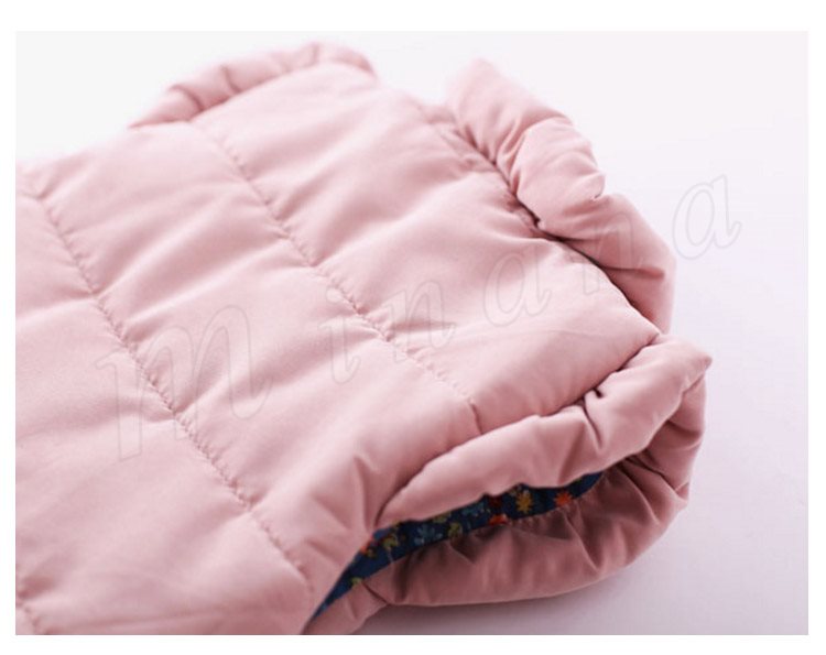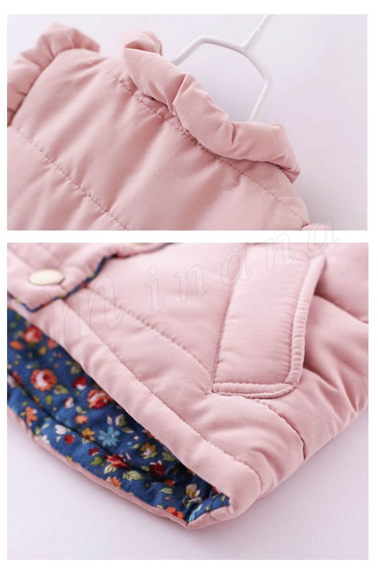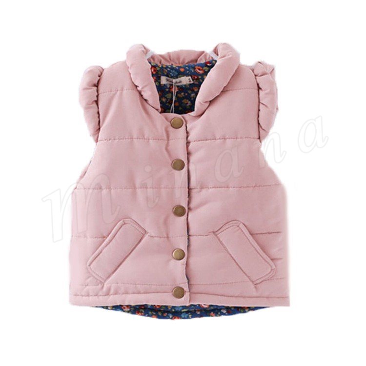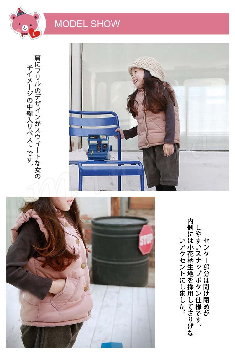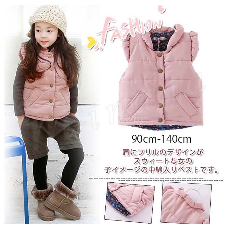 肩にフリルのデザインがスウィートな女の子イメージの中綿入りベストです。