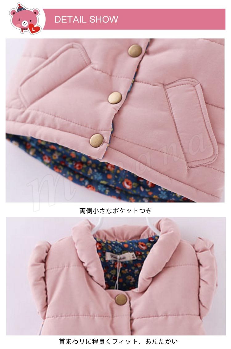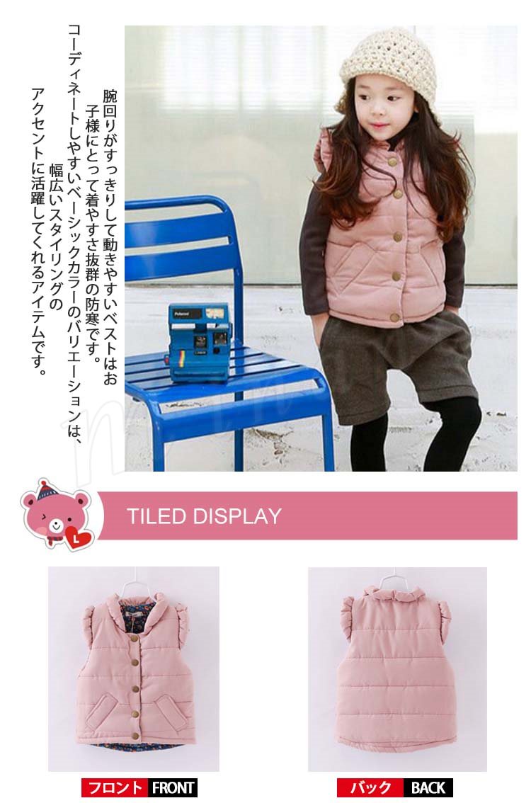 肩にフリルのデザインがスウィートな女の子イメージの中綿入りベスト 女の子ベスト 子供服 ジップアップ フリル 可愛い オシャレ シンプル ス