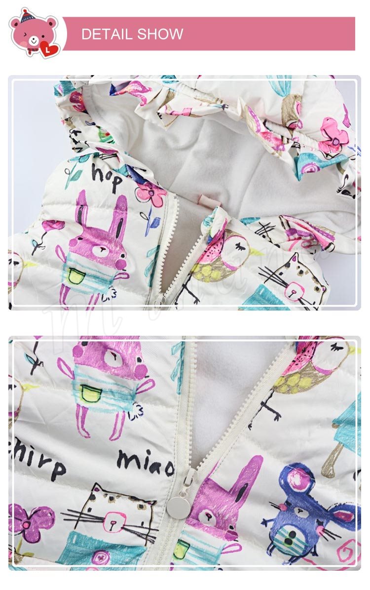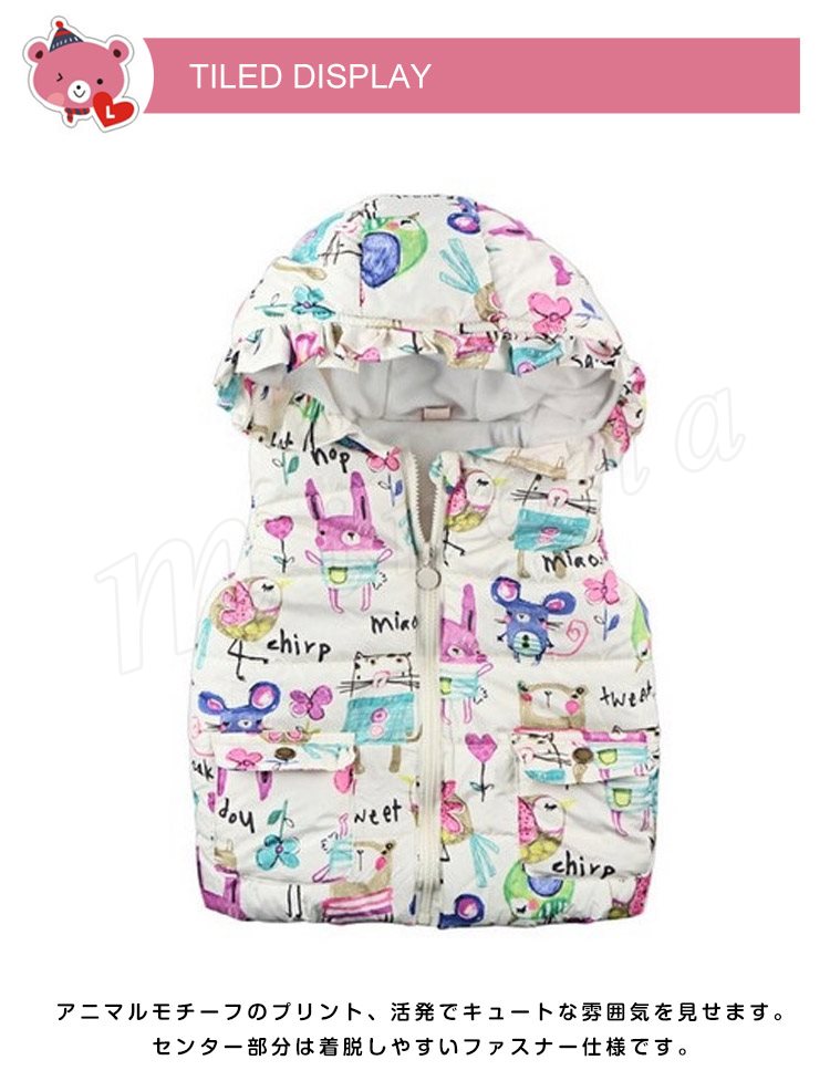 フードのフリルデザインが印象的な中綿入りベスト 女の子ベスト 子供服 アウター アニマル フードつきベスト スマート 可愛い キュート カジュ