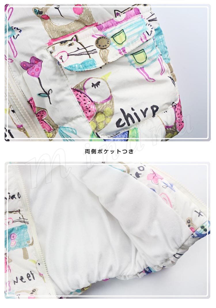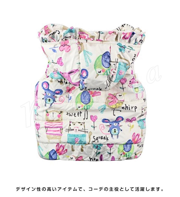 | フードのフリルデザインが印象的な中綿入りベストです。 アニマルモチーフのプリント、活発でキュートな雰囲気を見せます。 センター部分は着脱しやすいファスナー仕様です。 デザイン性の高いアイテムで、コーデの主役として活躍します。 温度調節に重宝するこれからの季節に重宝する一着です。 | |