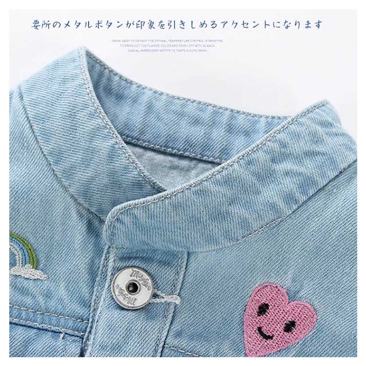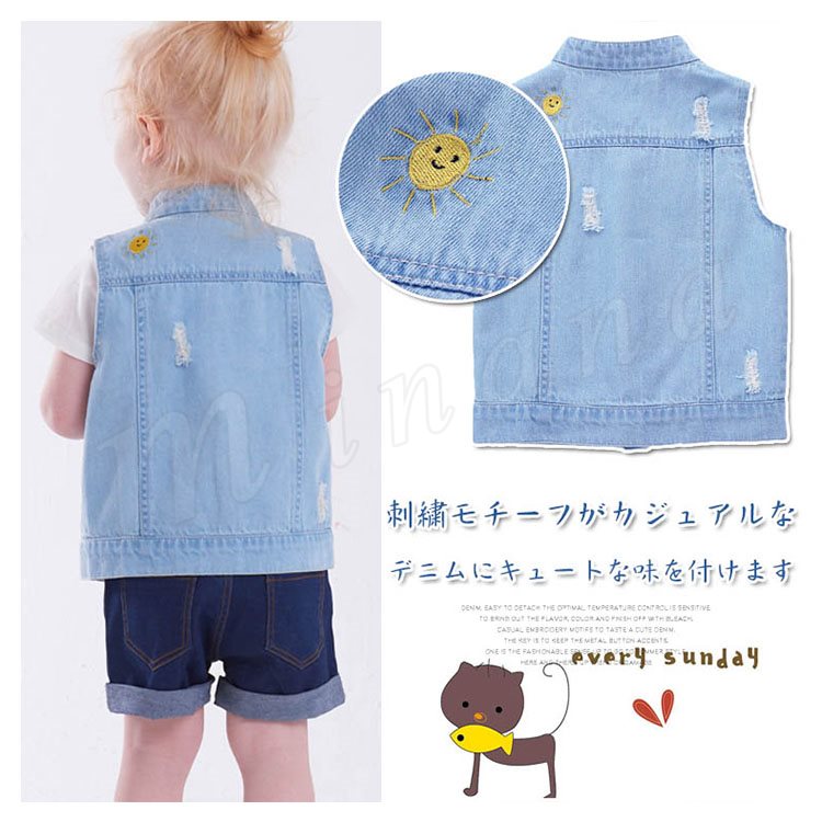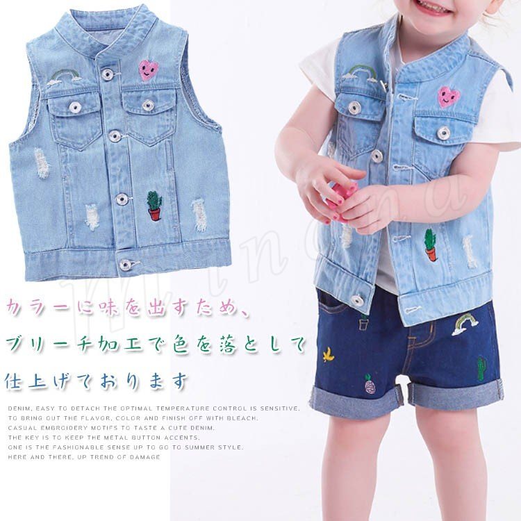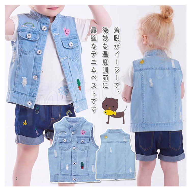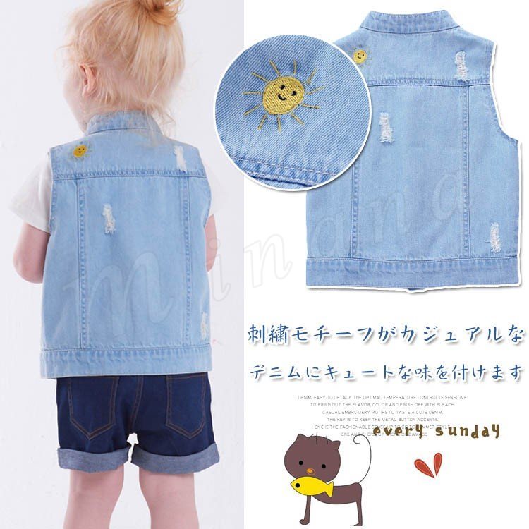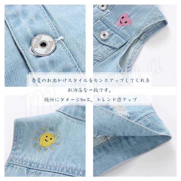 着脱がイージーで、微妙な温度調節に最適なデニムベスト 女の子デニムベスト 子供服 アウター ノースリーブジャケット ダメージ キュート 陽気