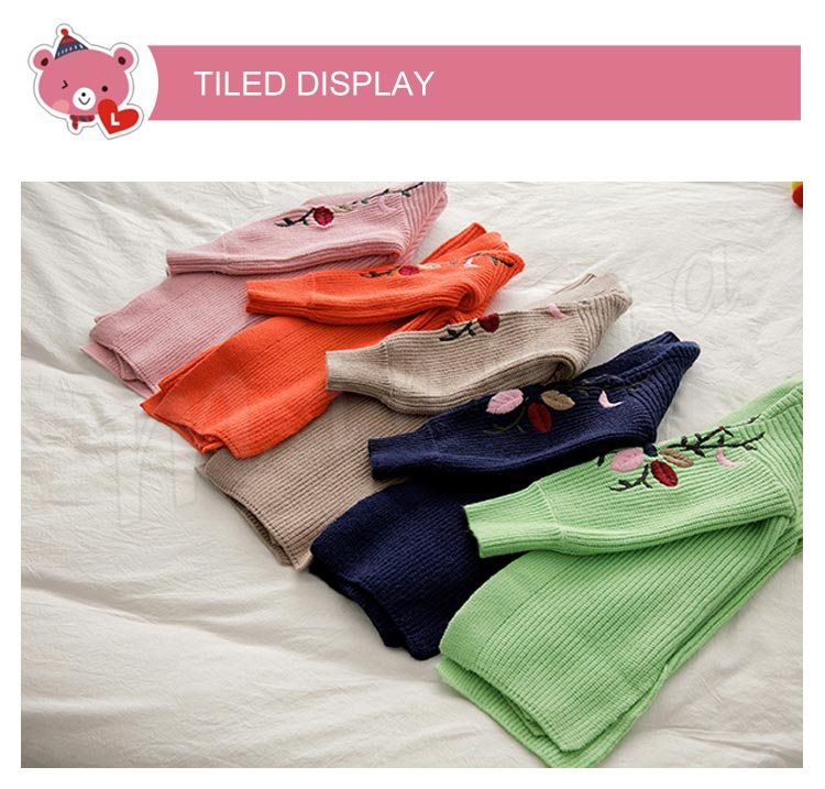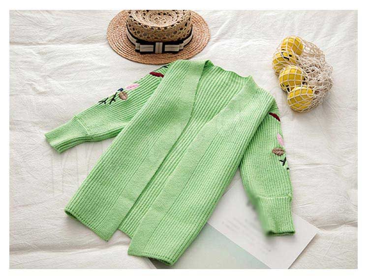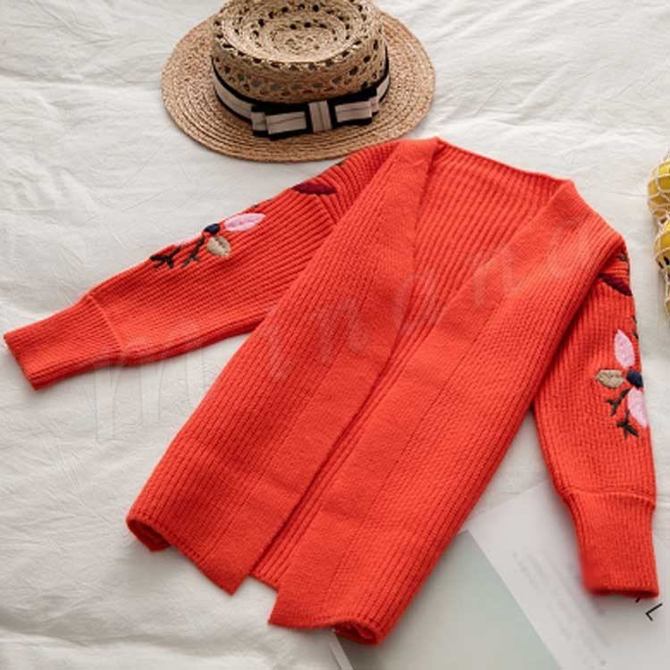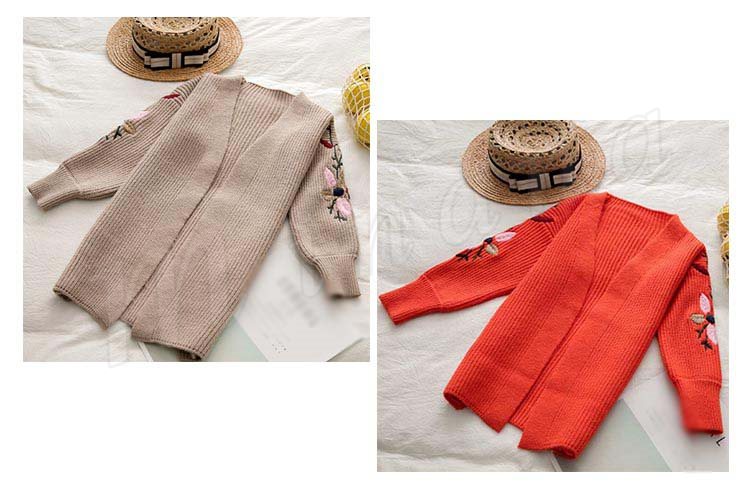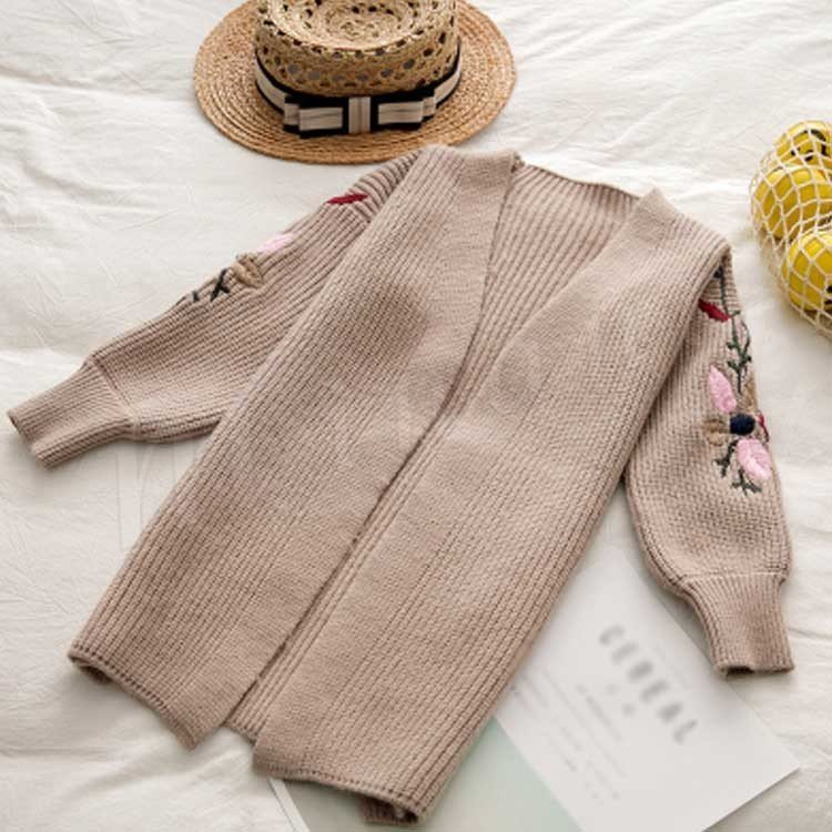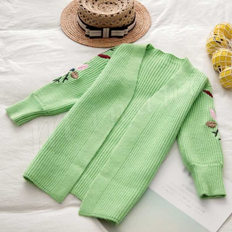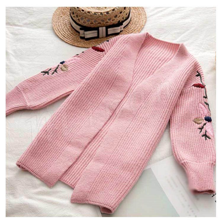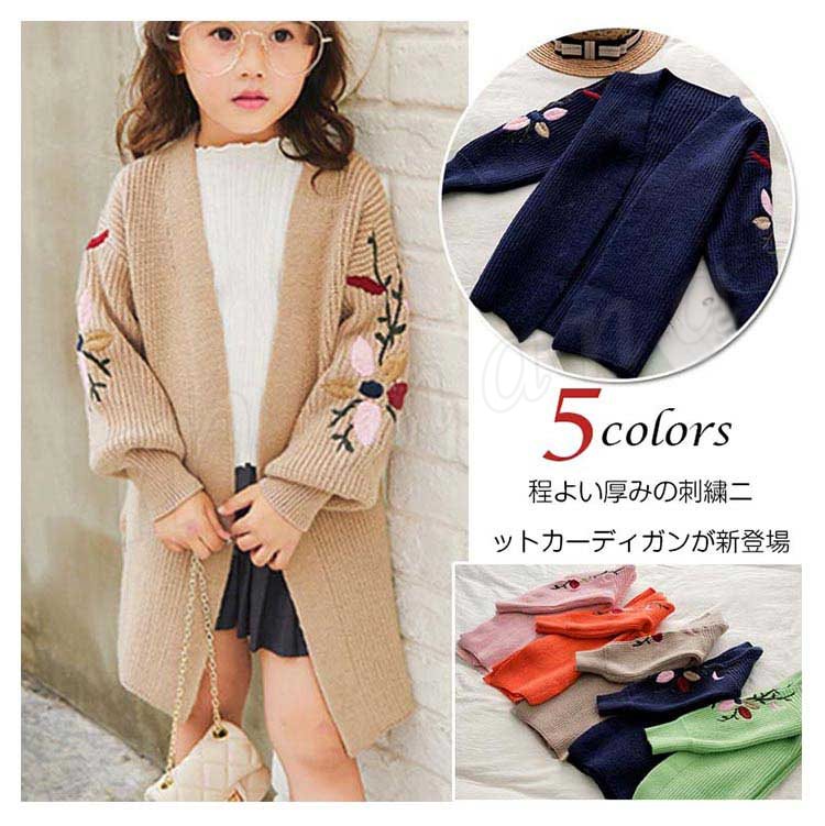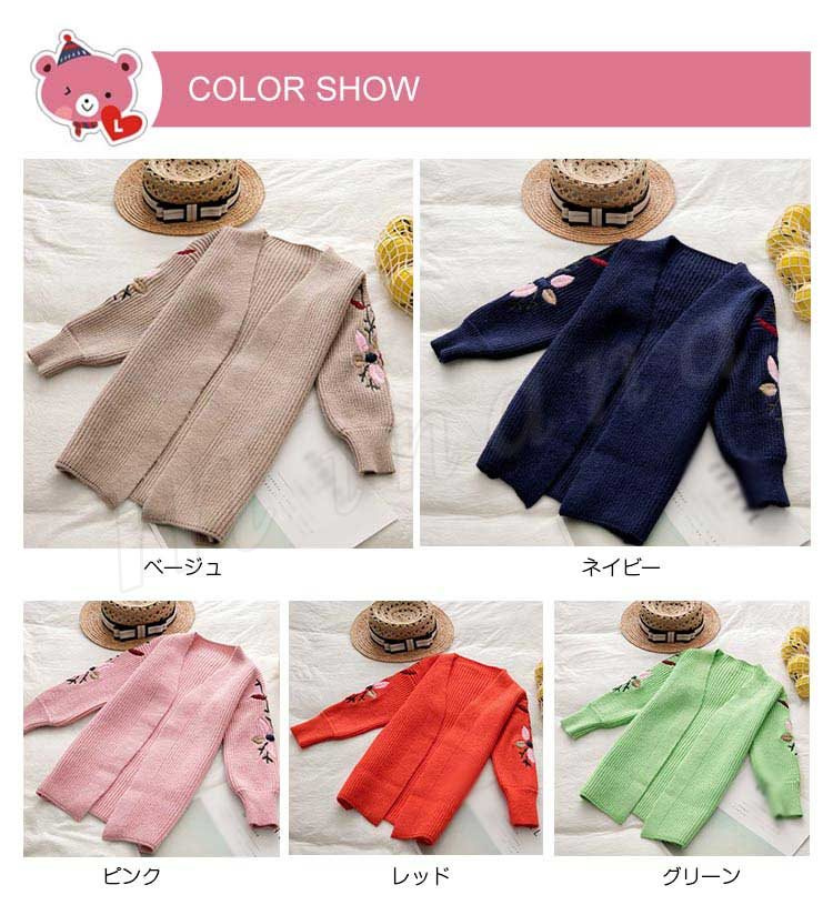 刺繍/子供服/ニットカーディガン/女の子/ロングカーディガン/羽織/長袖/Vネック/前開き/ボリュームスリーブ/スリット入り/花刺繍/暖かい/