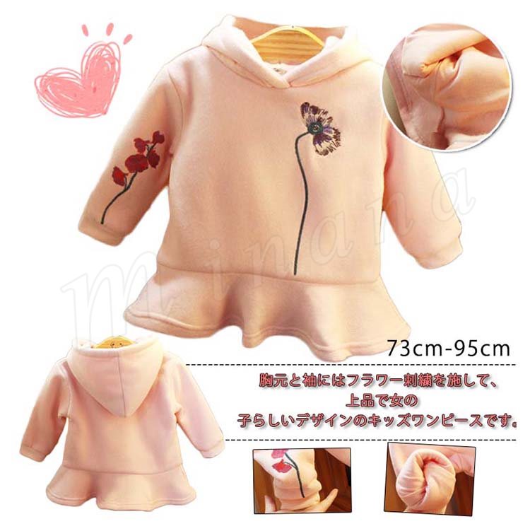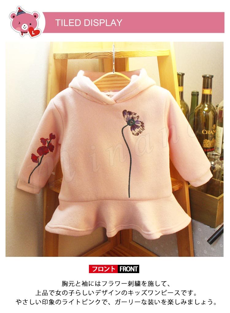 | 胸元と袖にはフラワー刺繍を施して、上品で女の子らしいデザインのキッズワンピースです。 フード付きは首回りがとってもあたたかい、まるで毛布をかぶっているような至福感! 裾のふんわりとした切り替えとAラインシルエットが特徴です。 やさしい印象のライトピンクで、ガーリーな装いを楽しみましょう。 | |