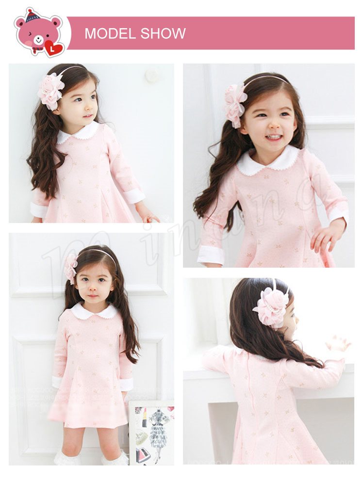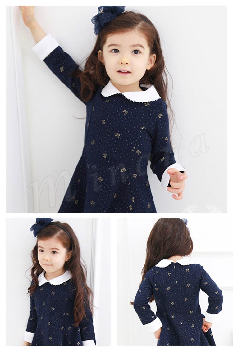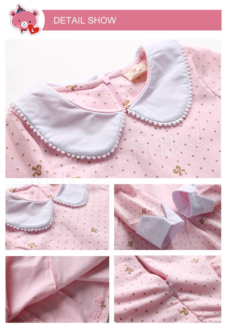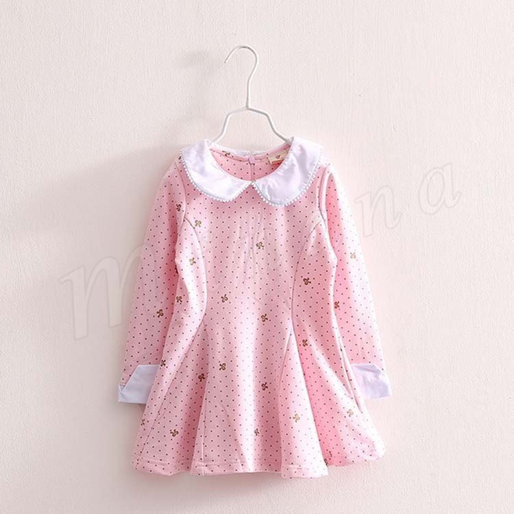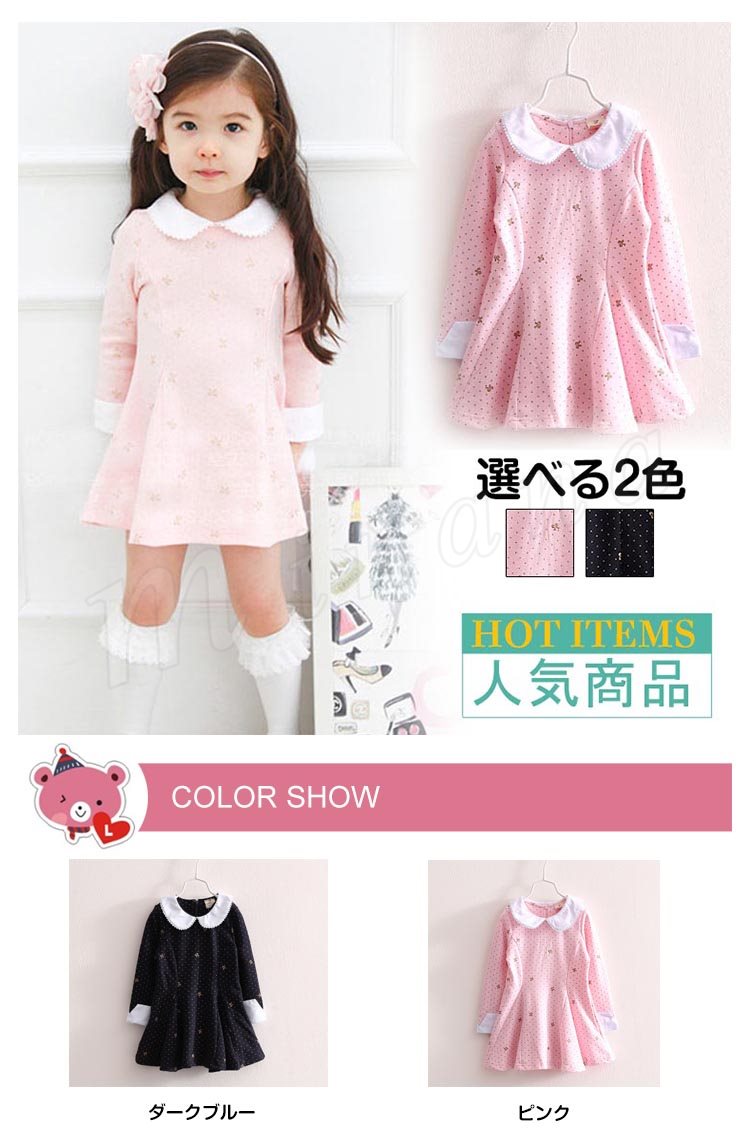 送料無料ワンピース 折襟 丸襟 長袖 子ども服 子供服 プリント ドット柄 リボン お姫様 ピンク レース飾り襟 キュート プルオーバー 人