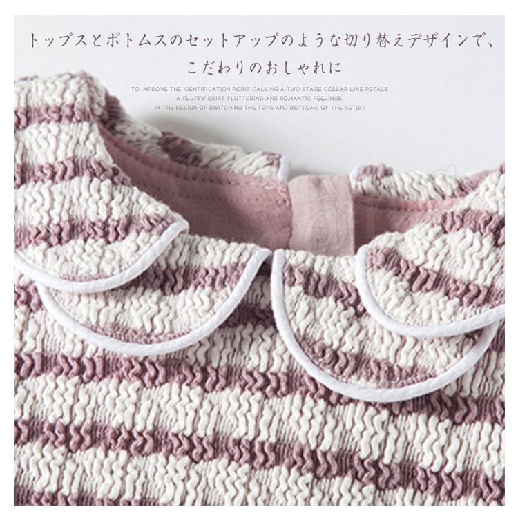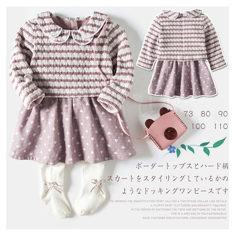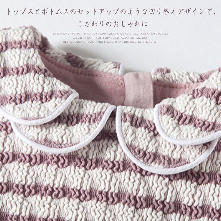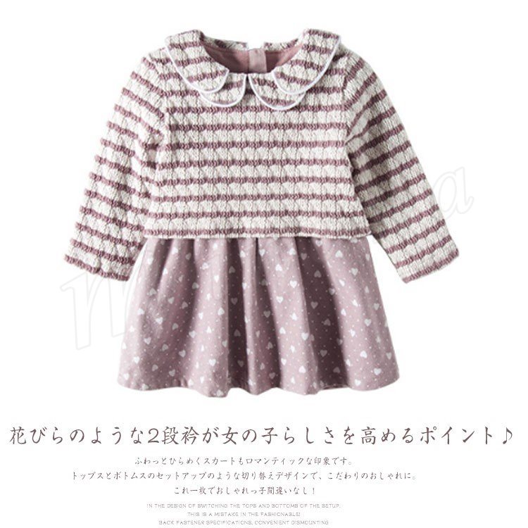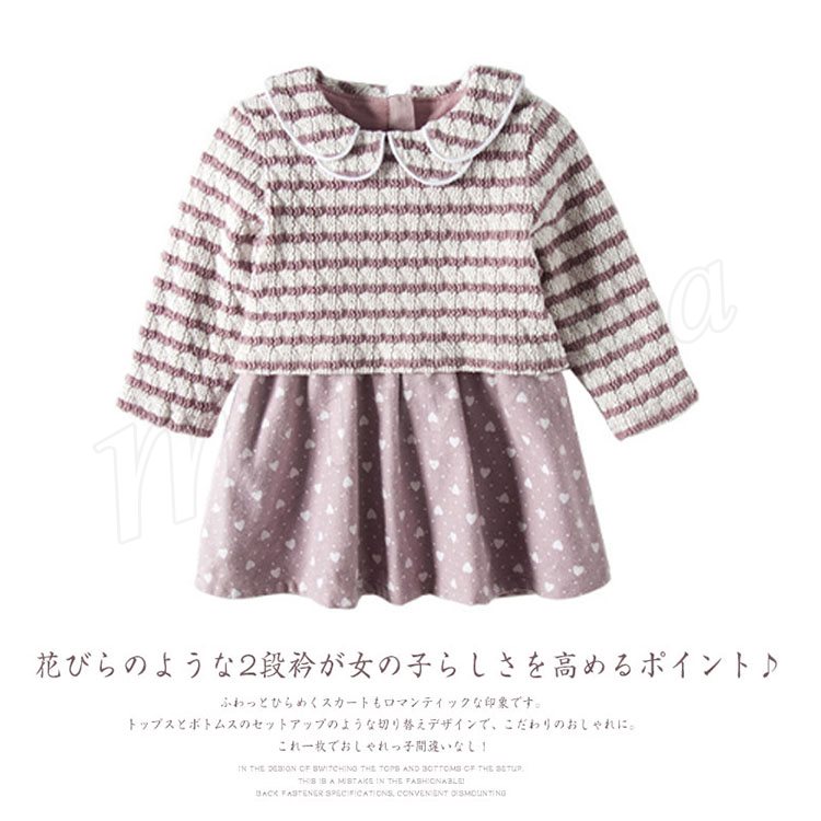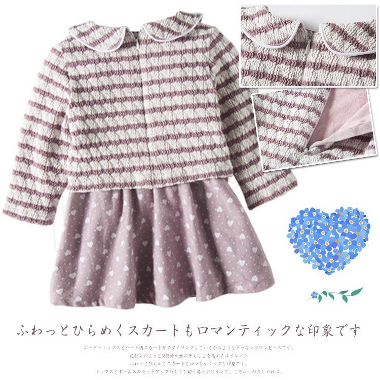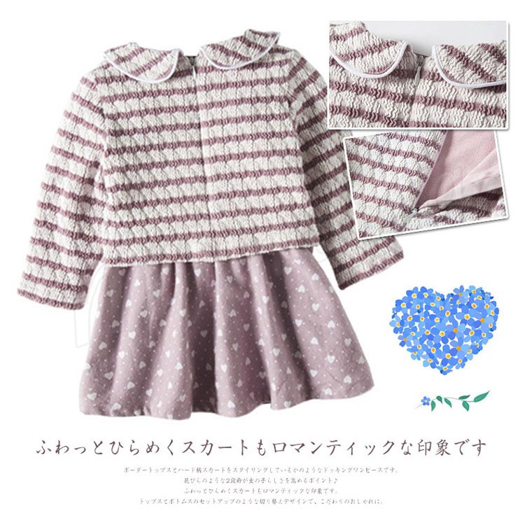 | ボーダートップスとハード柄スカートをスタイリングしているかのようなドッキングワンピースです。 花びらのような2段衿が女の子らしさを高めるポイント♪ ふわっとひらめくスカートもロマンティックな印象です。 トップスとボトムスのセットアップのような切り替えデザインで、こだわりのおしゃれに。 これ一枚でおしゃれっ子間違いなし! | |