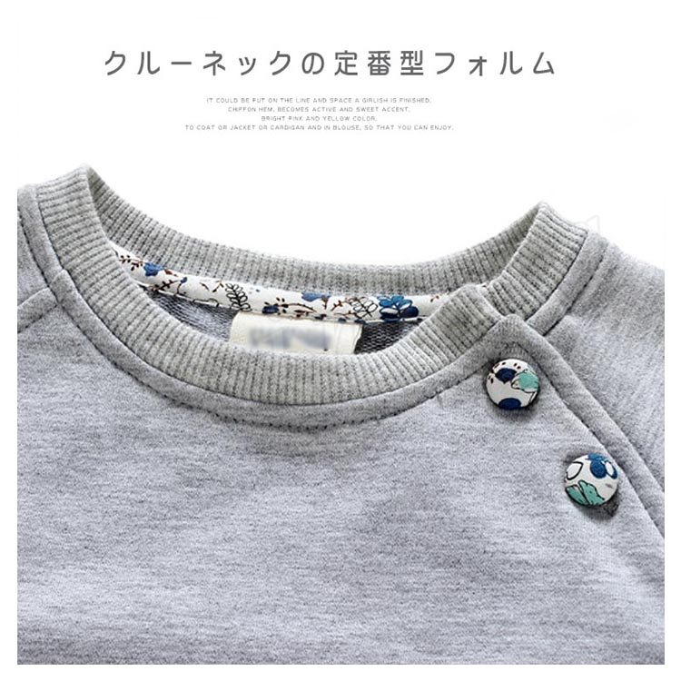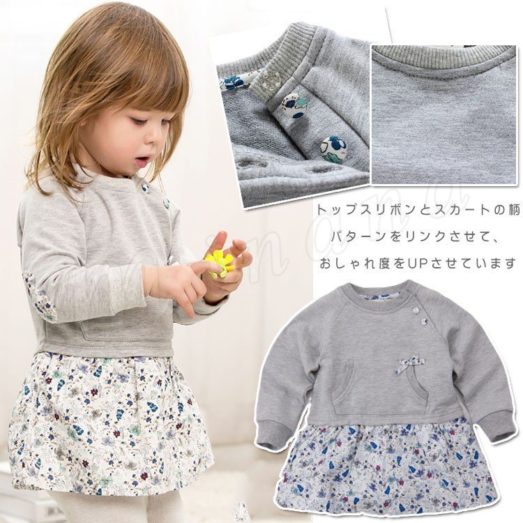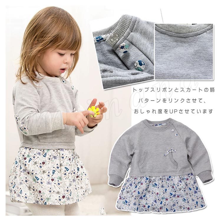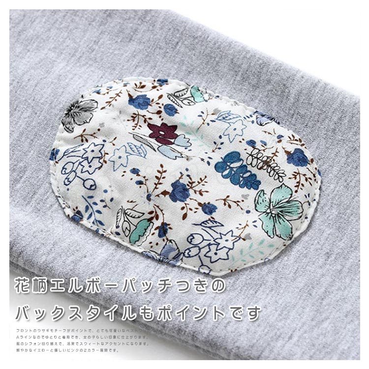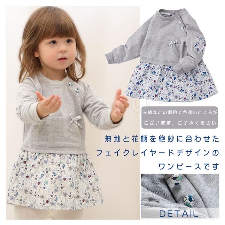 無地と花柄を絶妙に合わせたフェイクデザインのワンピース キッズワンピース 子供服 ベビー服 長袖ワンピース クルーネック エルボーパッチ リボ