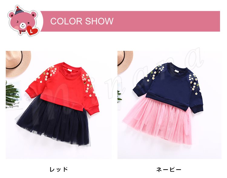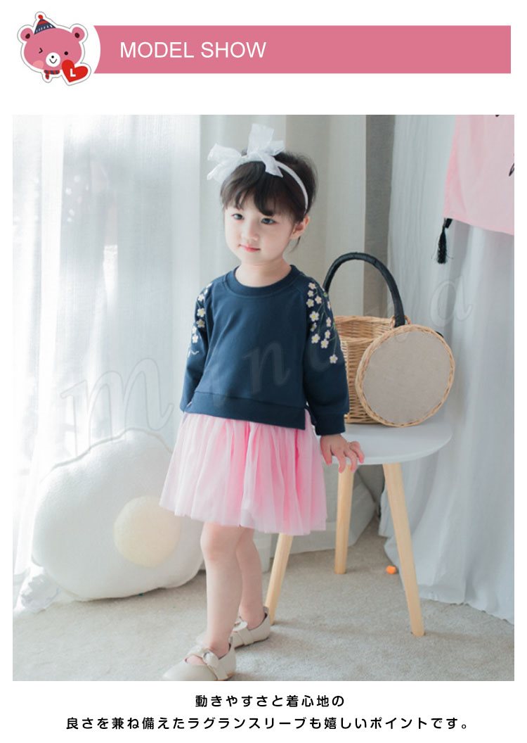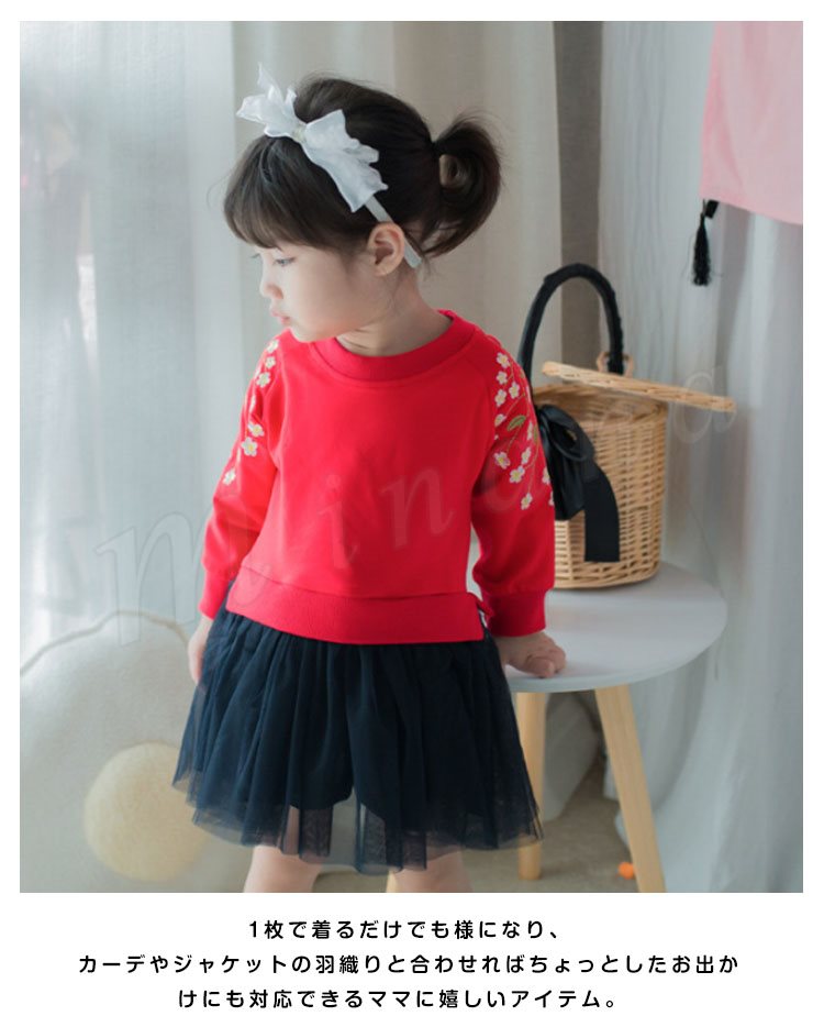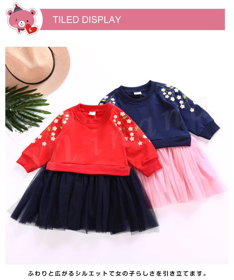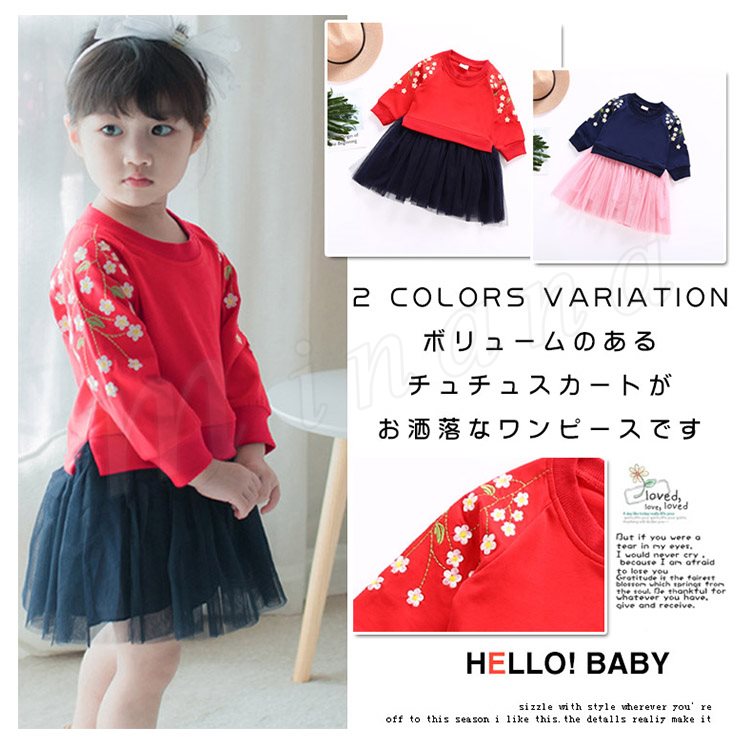 ボリュームのあるチュチュスカートがお洒落なワンピース 女の子ワンピース 子供服 長袖 クルーネック 花柄 刺繍 キュート 可愛い エレガント