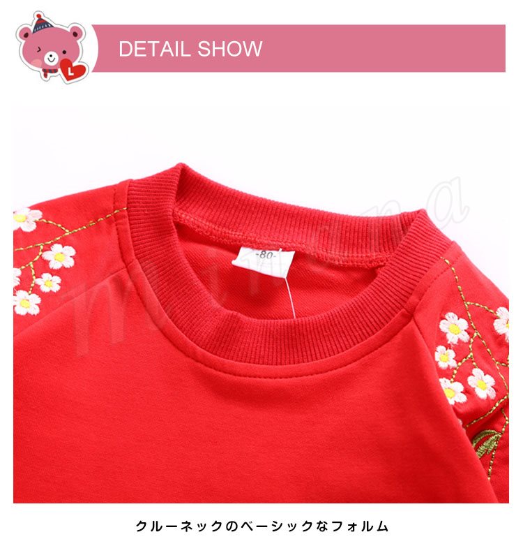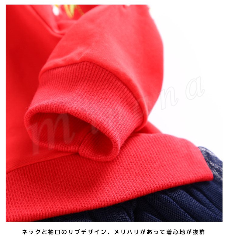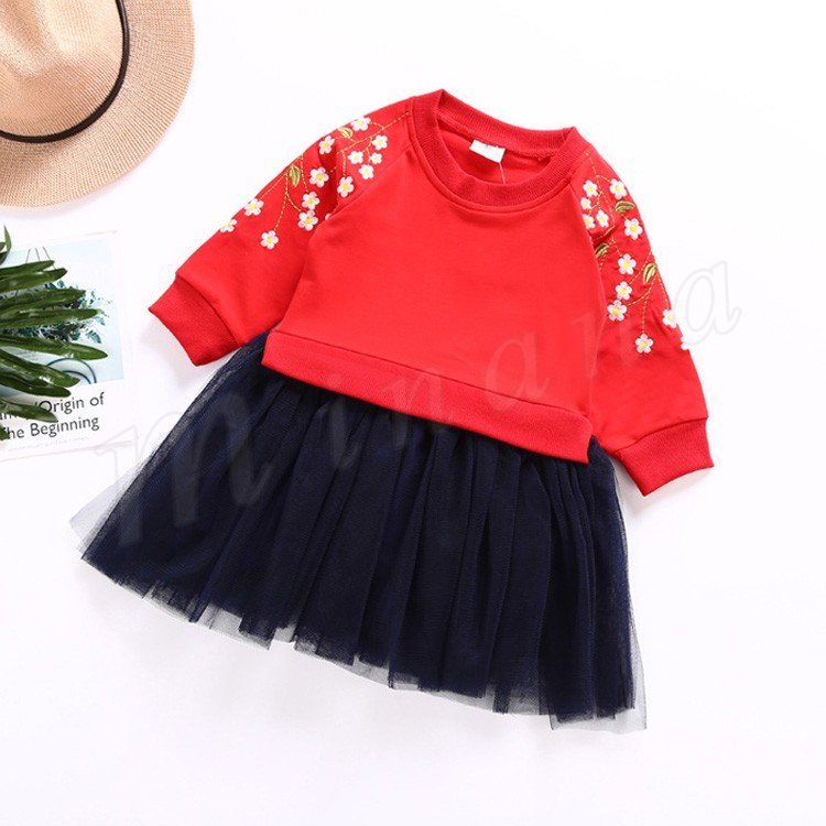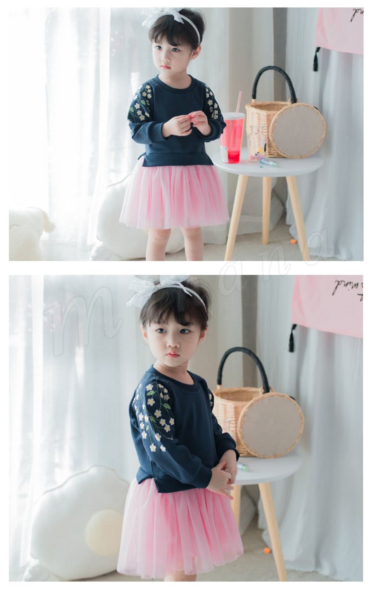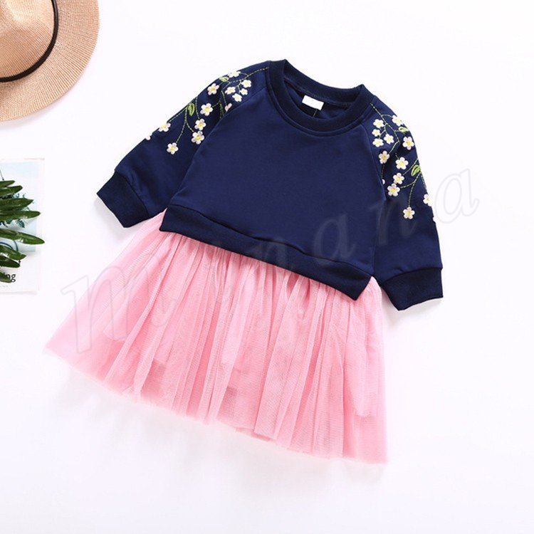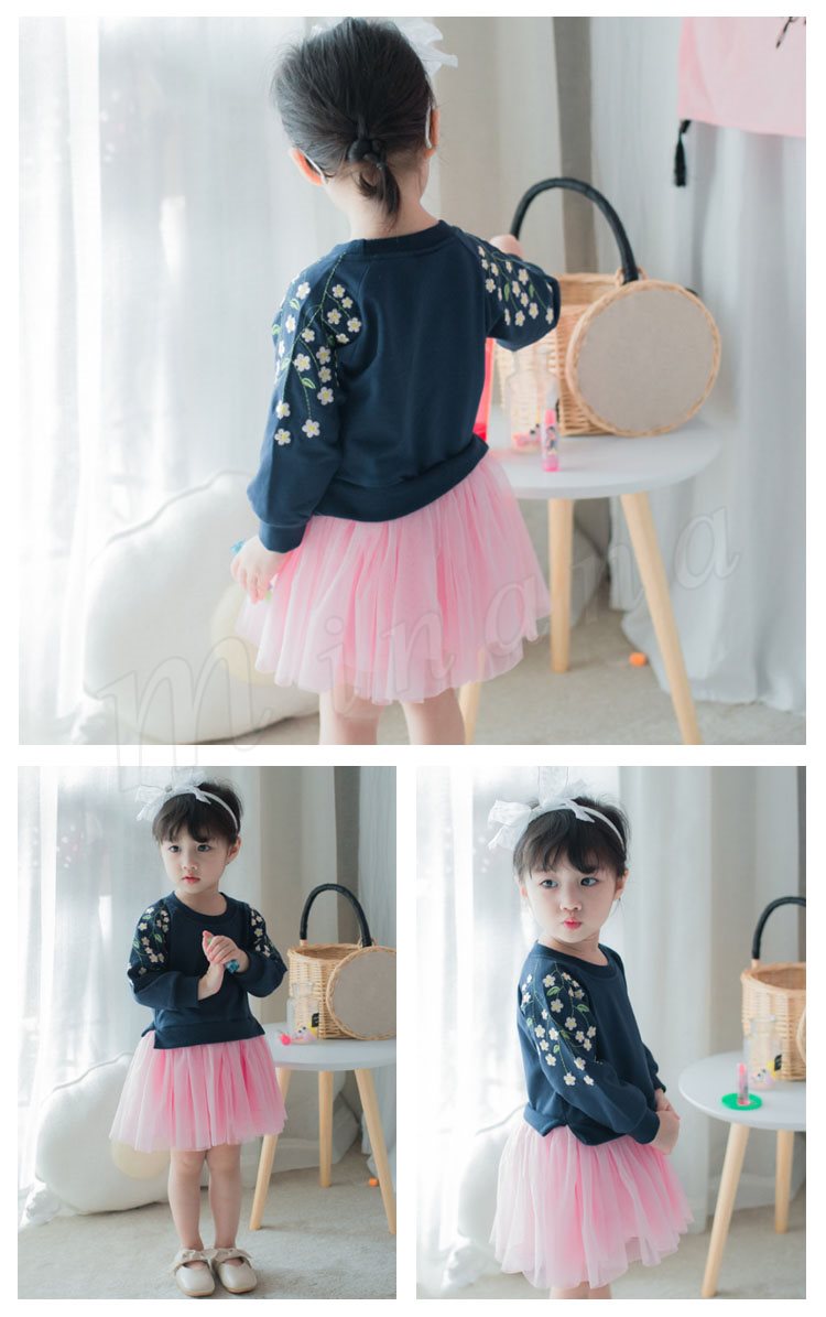 ボリュームのあるチュチュスカートがお洒落なワンピース 女の子ワンピース 子供服 長袖 クルーネック 花柄 刺繍 キュート 可愛い エレガント