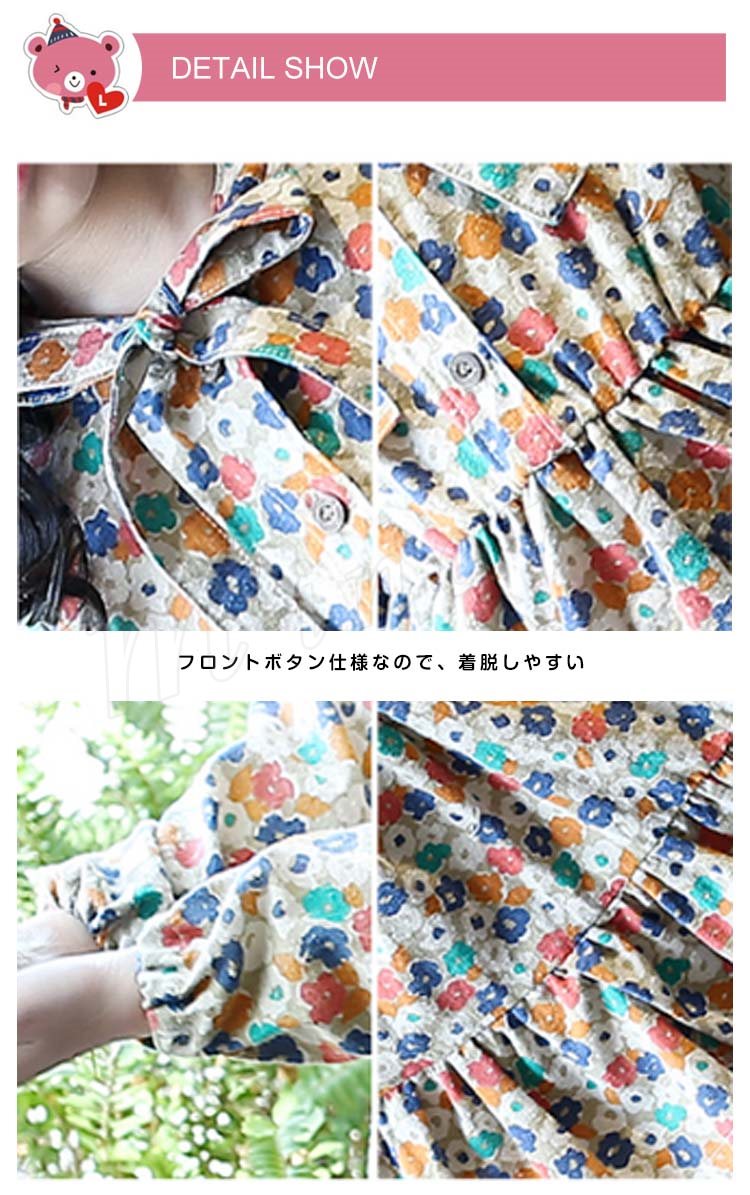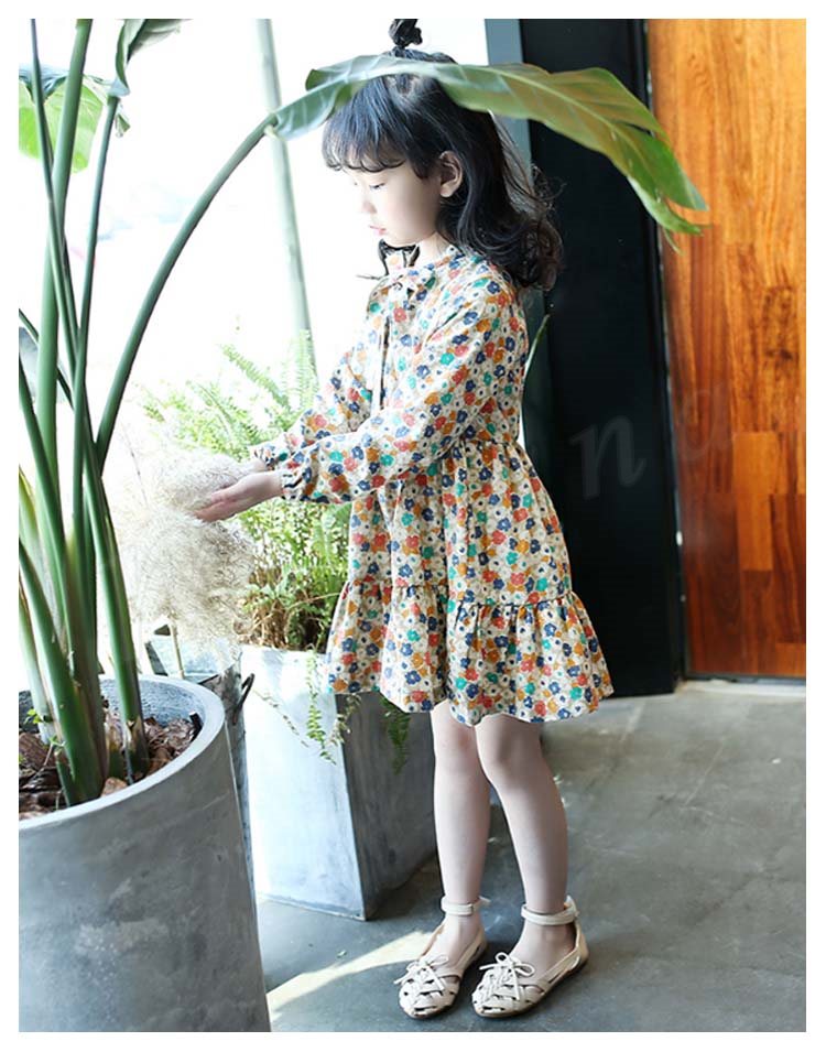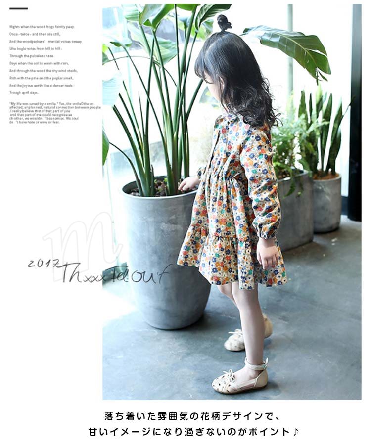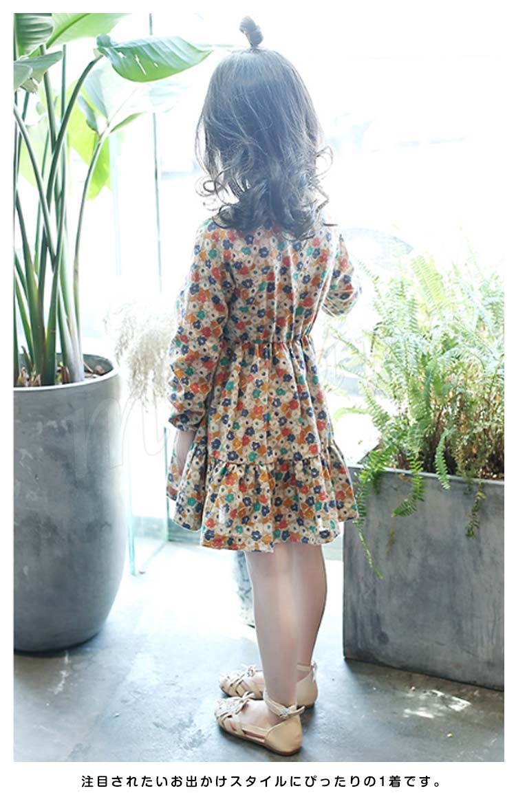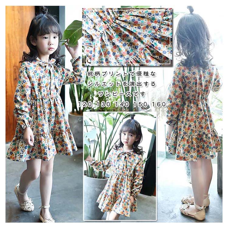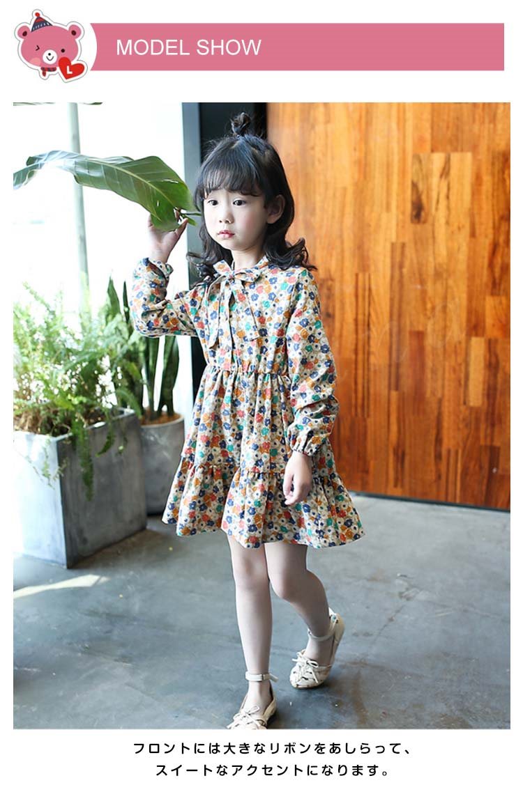 総柄プリントで優雅なシルエットを演出するワンピース 女の子ワンピース 子供服 長袖 Aラインワンピース リボン 花柄 エレガント 可愛い オシ