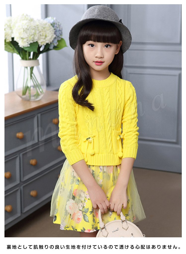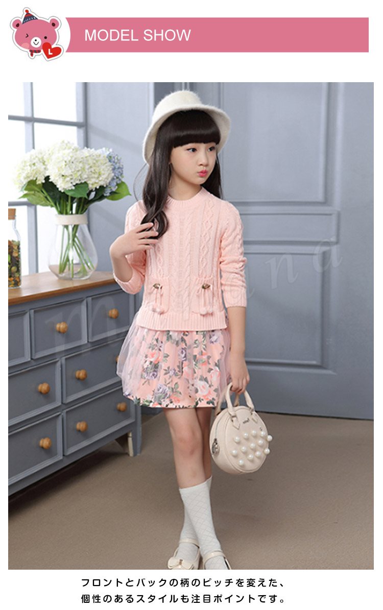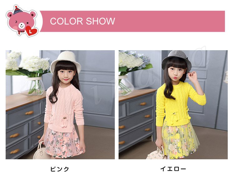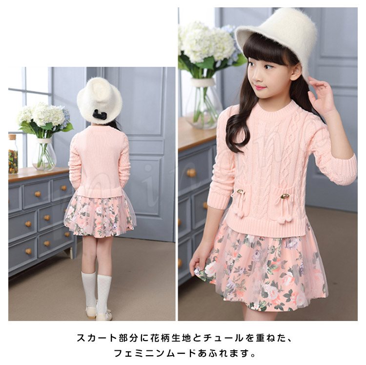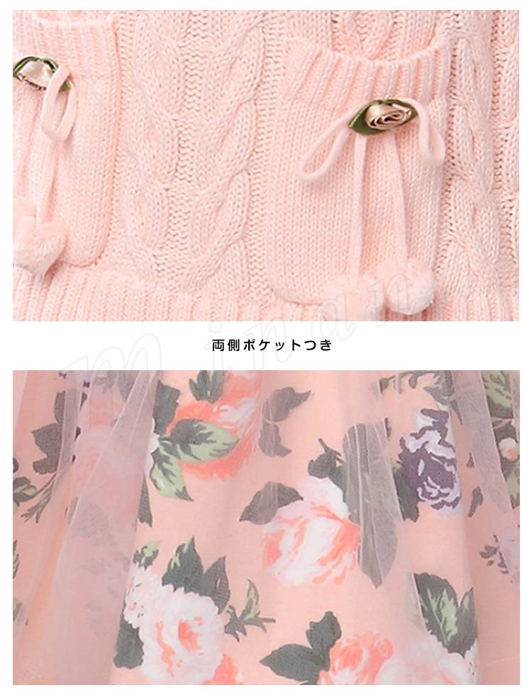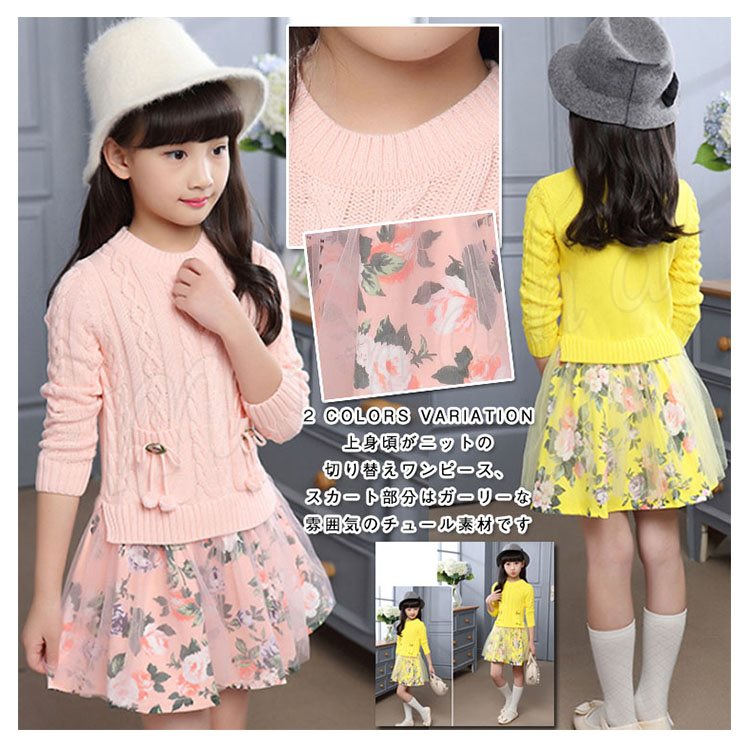 上身頃をニット生地、スカート部分をチュールで切り替えた、異素材コンビの切り替えワンピース 女の子ワンピース 子供服 長袖 Aラインワンピース