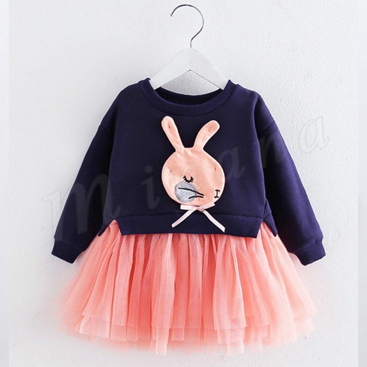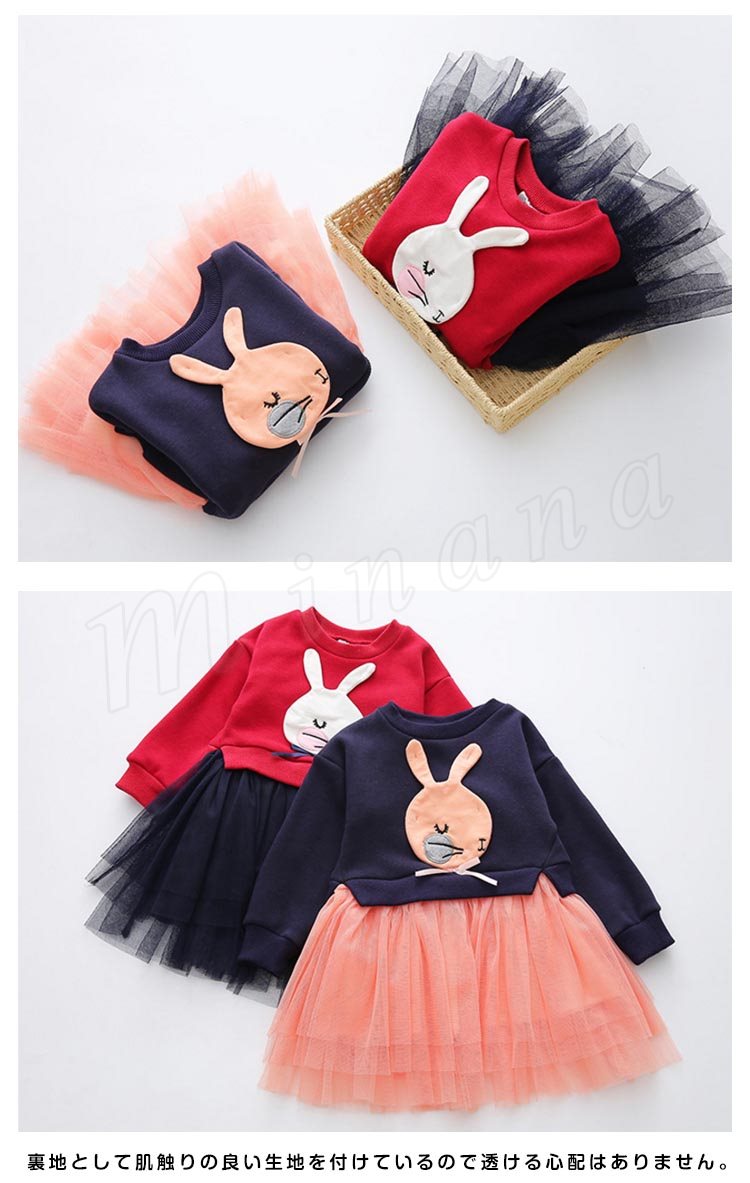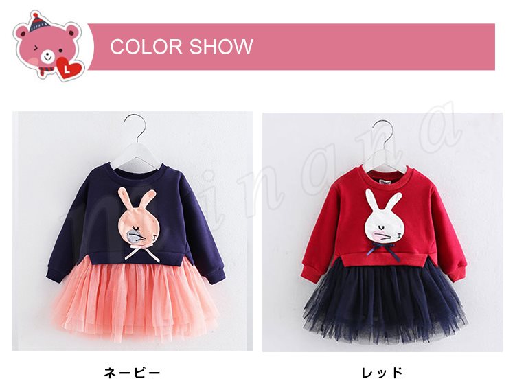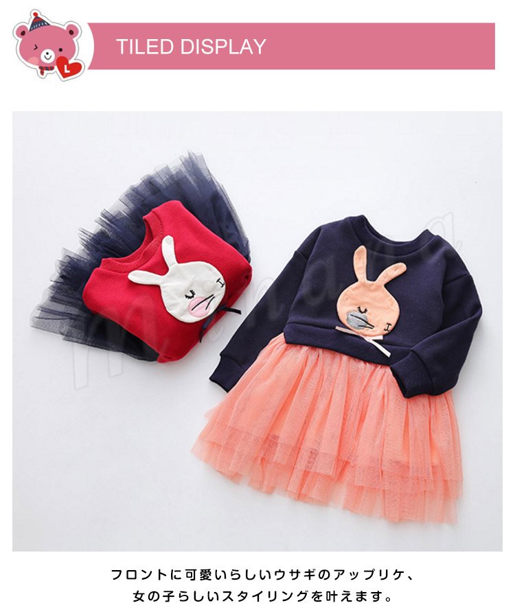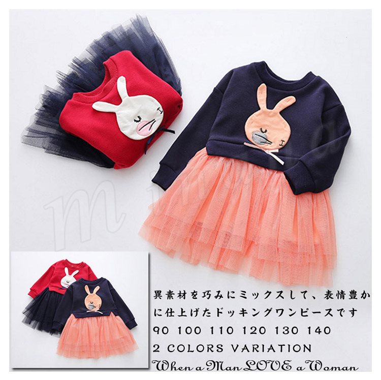 異素材を巧みにミックスして、表情豊かに仕上げたドッキングワンピース 女の子ワンピース 子供服 長袖 Aラインワンピース ウサギ アップリケ キ