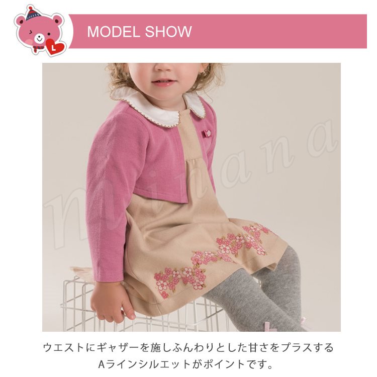 | ポレロを重ね着したようなフェイクレイヤードしたデザインのワンピースです。 清潔感溢れる白衿が女の子らしい可愛さを引き立てます。 裾に愛らしいフラワーをあしらって、スタイリングを女の子らしく彩ります。 ウエストにギャザーを施しふんわりとした甘さをプラスするAラインシルエットがポイントです。 ディリー使いはもちろん、お出かけシーンにもぴったりです。 | |
