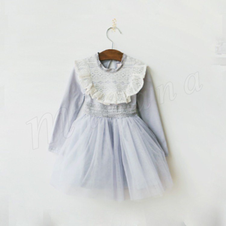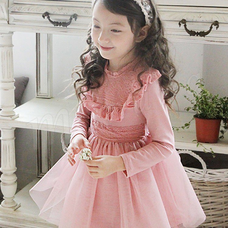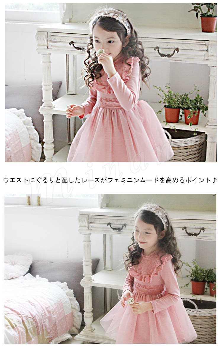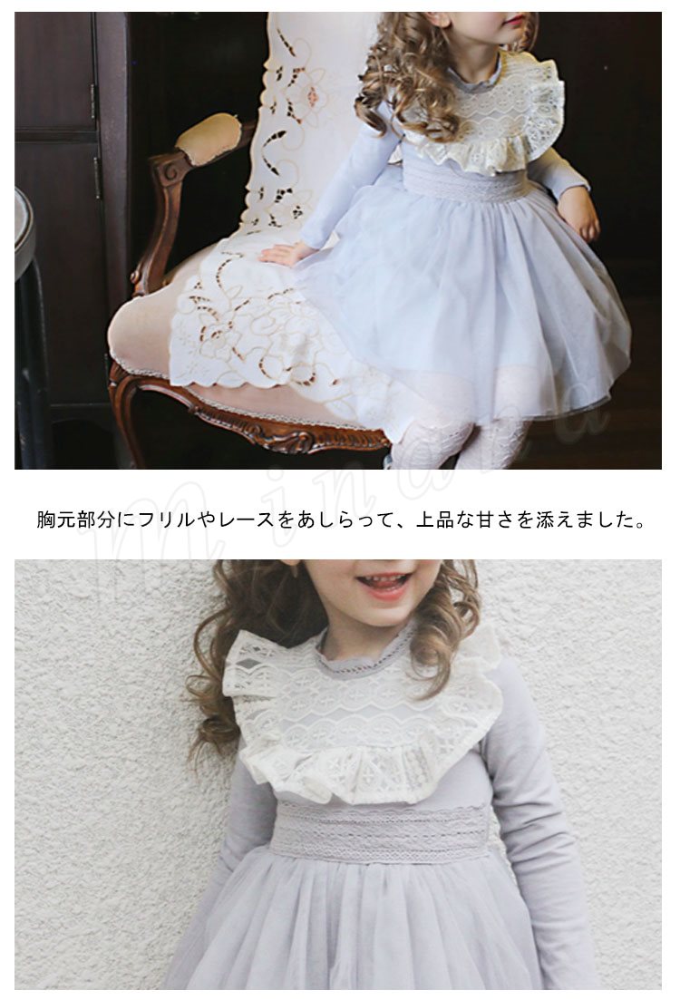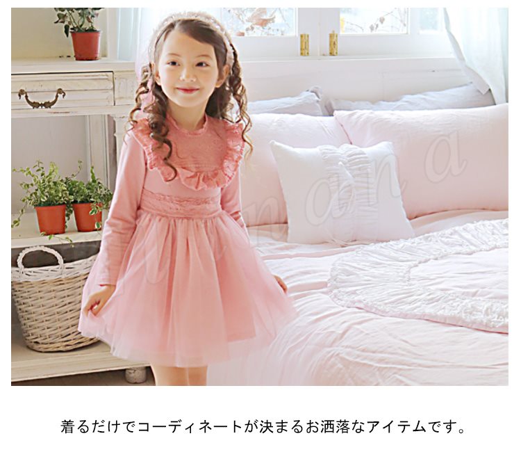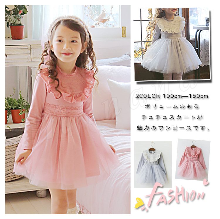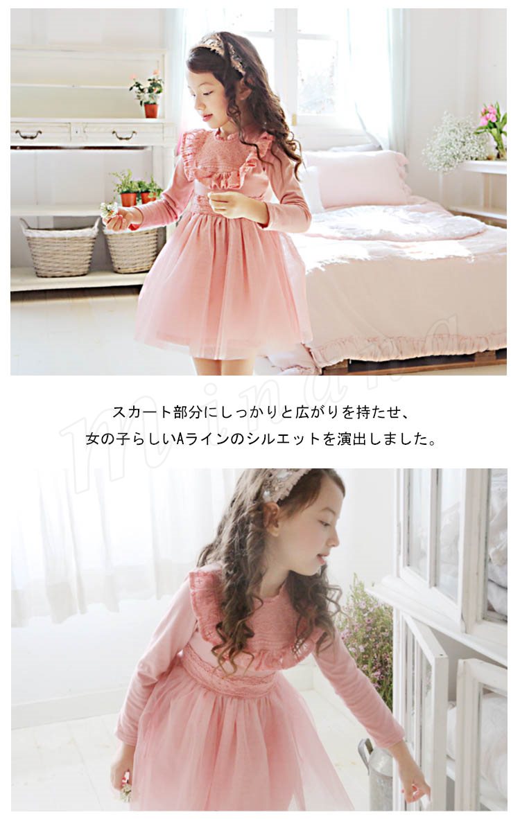 ボリュームのあるチュチュスカートが魅力のワンピース キッズワンピース 女の子 ドッキングワンピース 長袖 フリル レース エレガント 可愛い