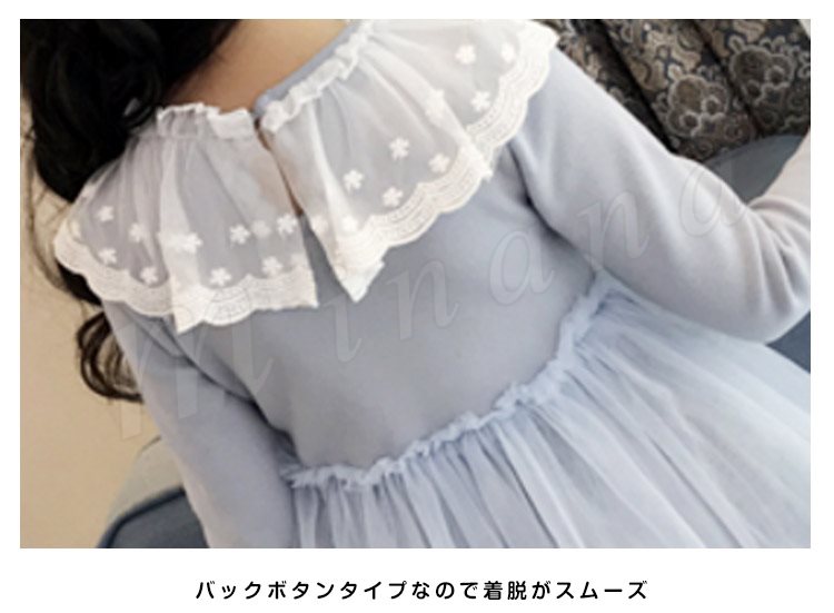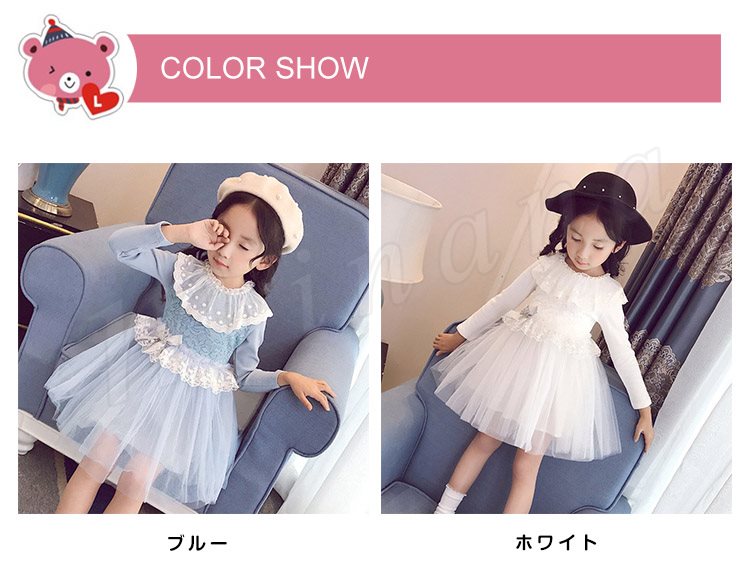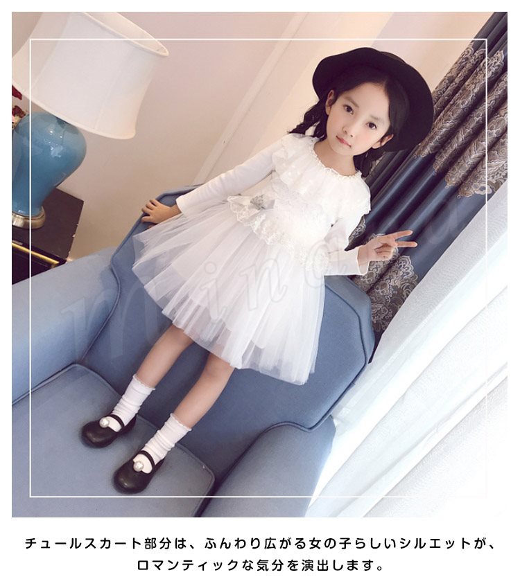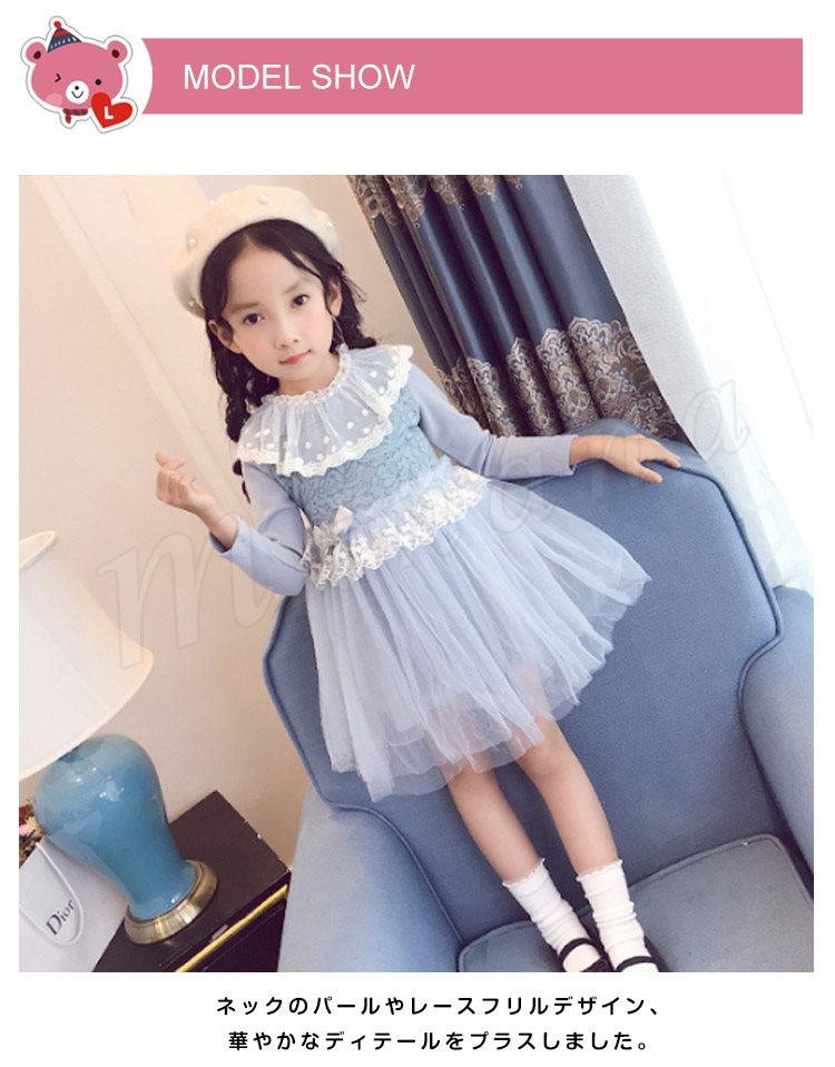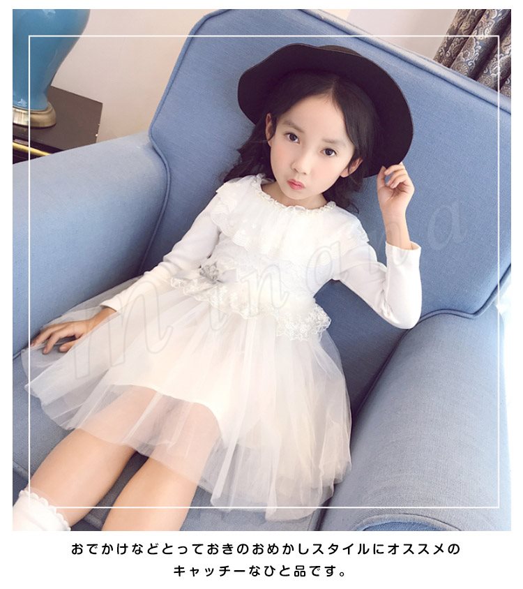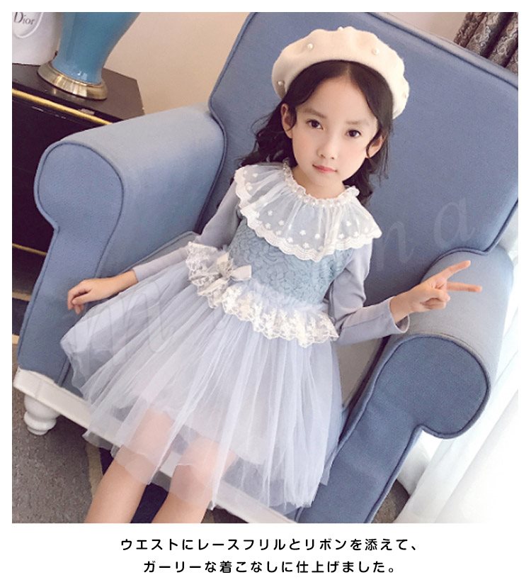 チュールと多様なレース使いがプリンセス風たっぷりのワンピース 女の子ワンピース 子供服 長袖 Aラインワンピース リボン エレガント お洒落