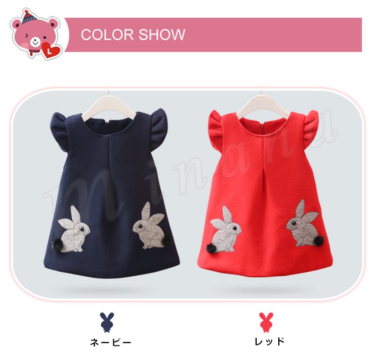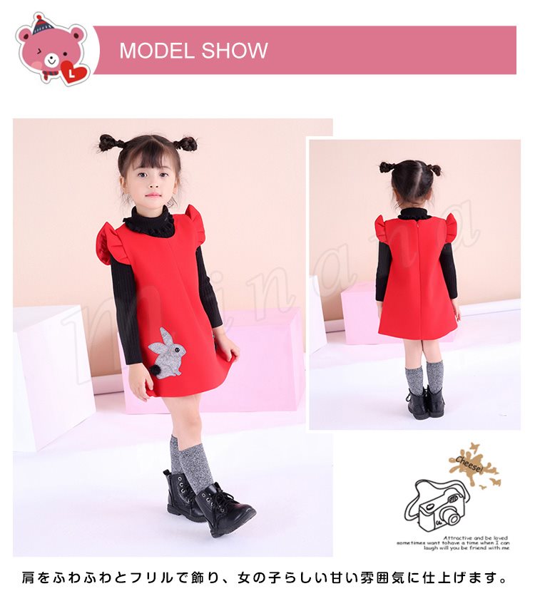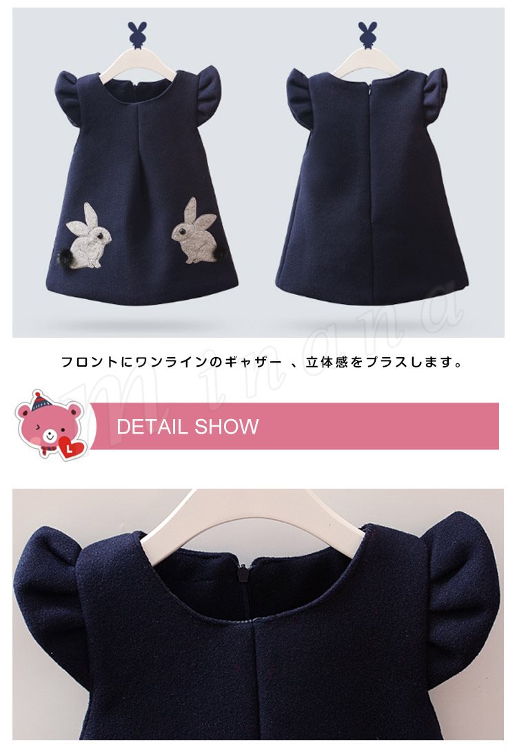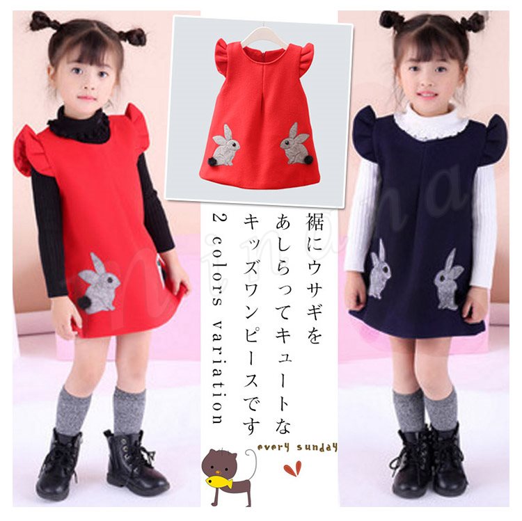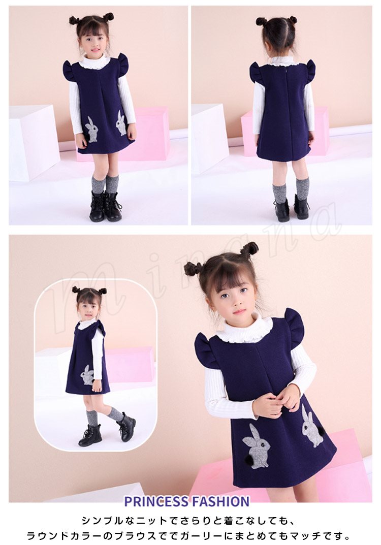 | 裾にウサギをあしらってキュートなキッズワンピースです。 肩をふわふわとフリルで飾り、女の子らしい甘い雰囲気に仕上げます。 フロントにワンラインのギャザー 、立体感をプラスします。 シンプルなニットでさらりと着こなしても、ラウンドカラーのブラウスででガーリーにまとめてもマッチです。 綺麗なカラーリングでコーディネートの主役に活躍してくれるとっても優秀な一枚です。 | |