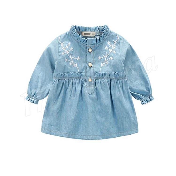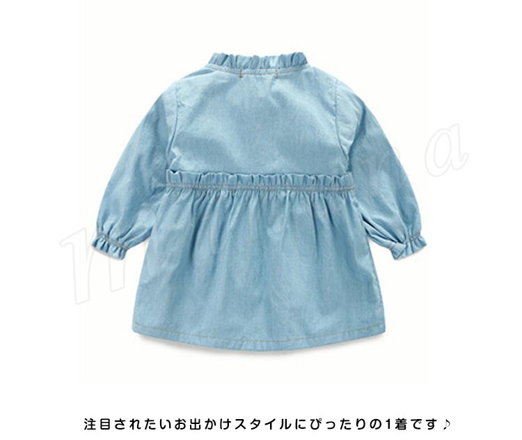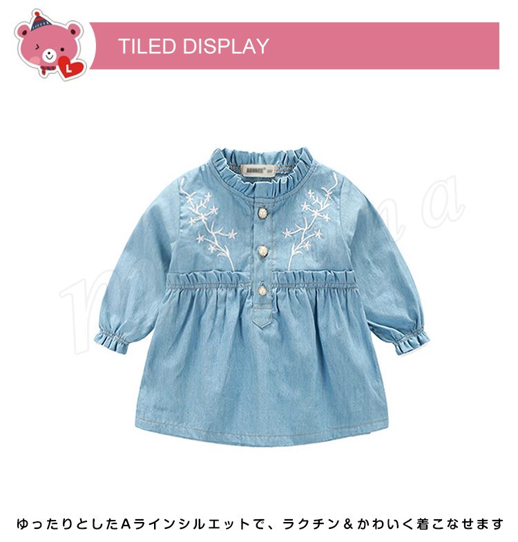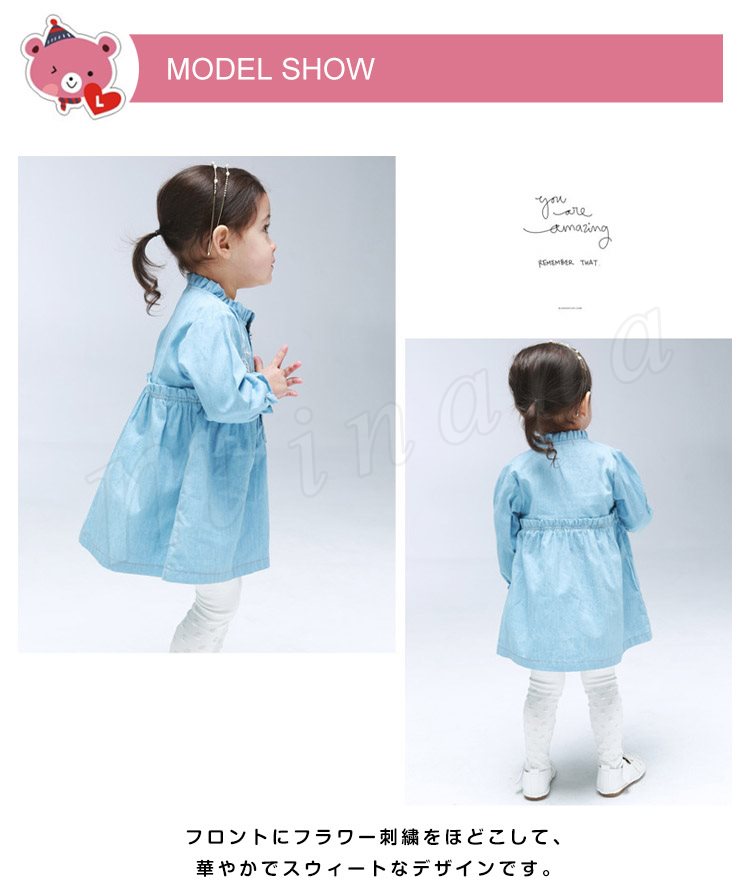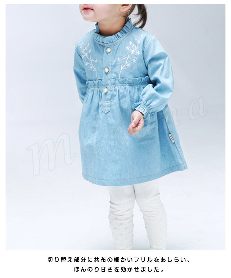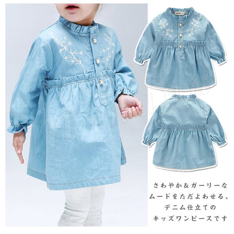 さわやか&ガーリーなムードをただよわせる、デニム仕立てのキッズワンピース 女の子長袖ワンピース 子供服 ベビーワンピース フラワー 刺繍 キュ