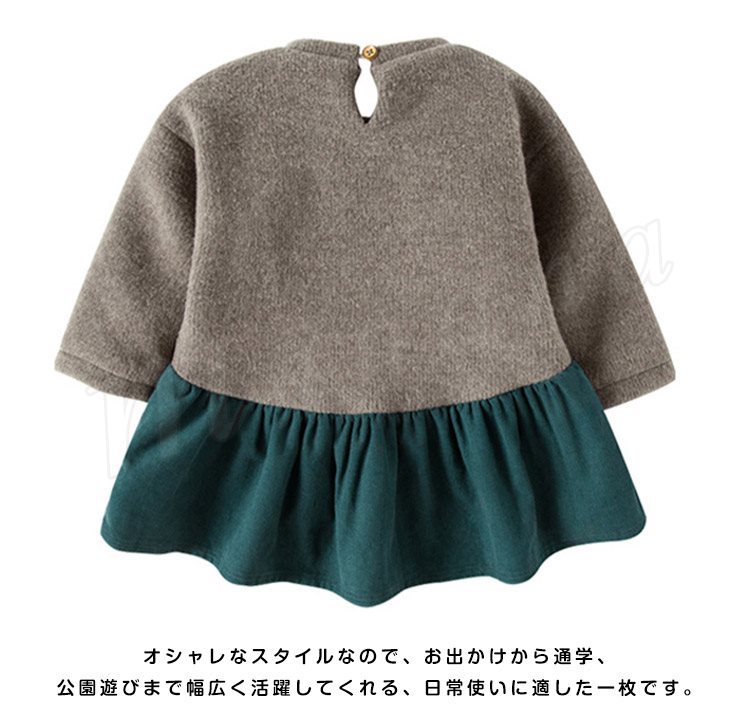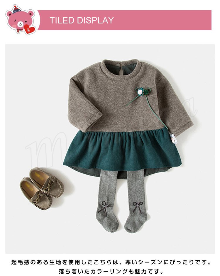 | フロントにカラーポンポンをあしらい、可愛いなキッズワンピースです。 ウエストからのプリーツの配色切り替え、ふんわりと広がるシルエットで女の子らしさを引き立てます。 起毛感のある生地を使用したこちらは、寒いシーズンにぴったりです。 落ち着いたカラーリングも魅力です。 オシャレなスタイルなので、お出かけから通学、公園遊びまで幅広く活躍してくれる、日常使いに適した一枚です。 | |