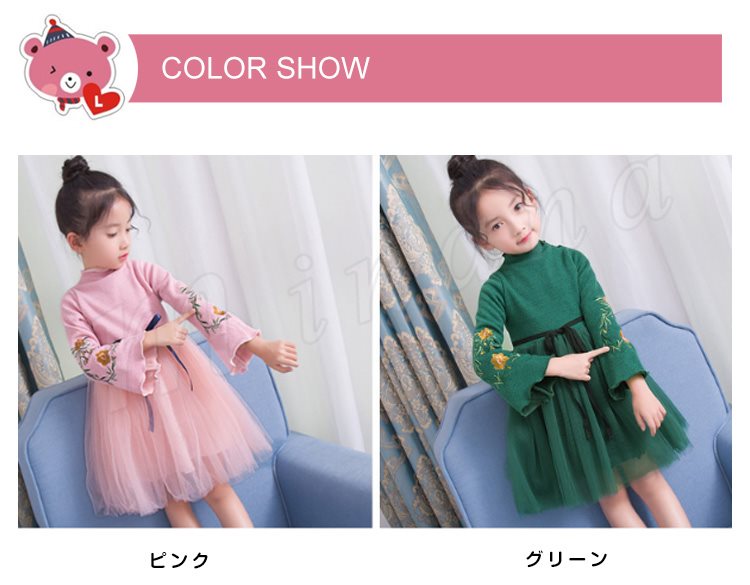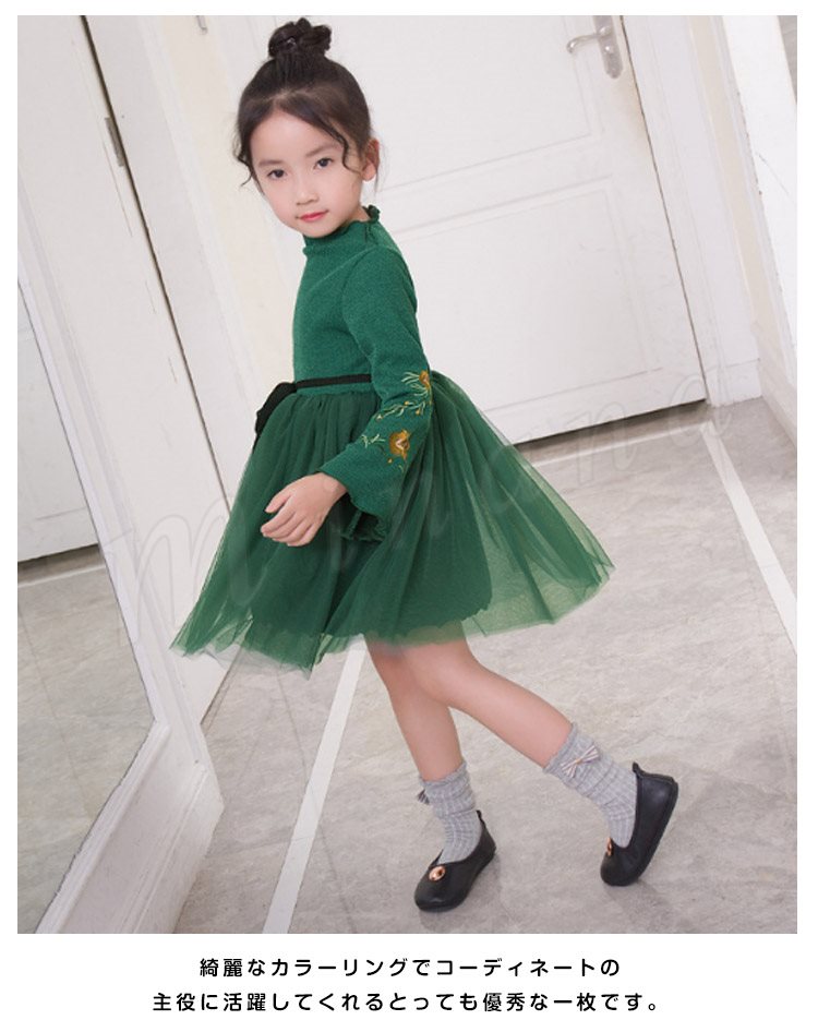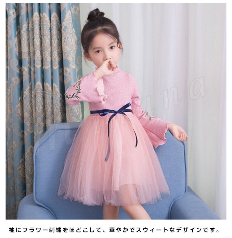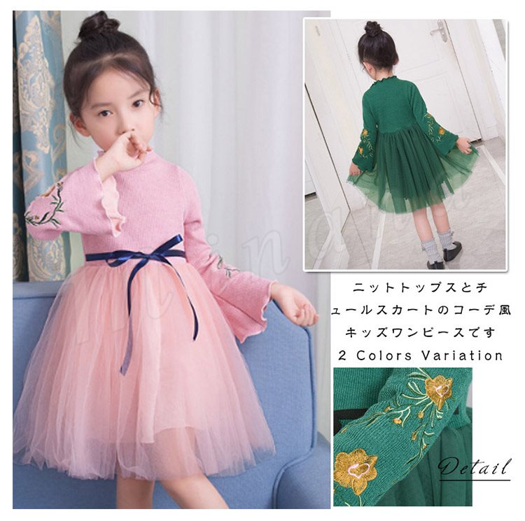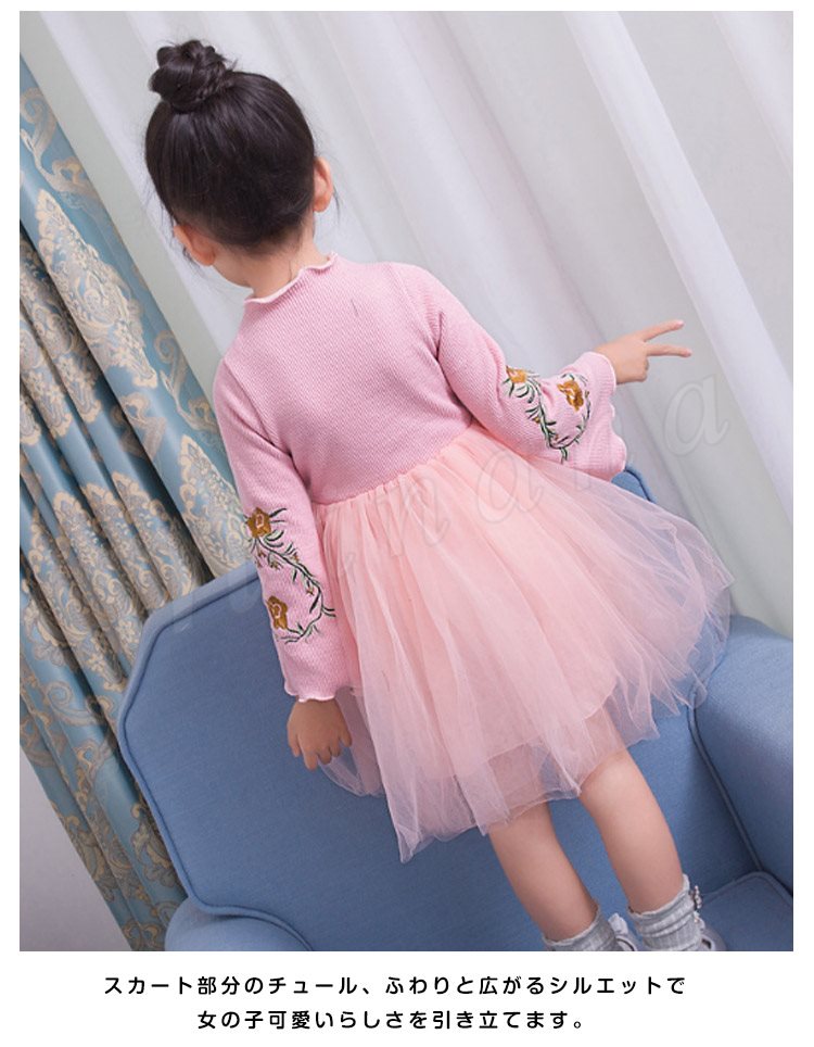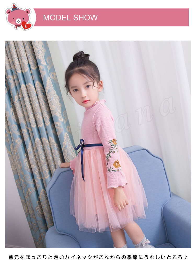 ニットトップスとチュールスカートのコーデ風キッズワンピース 女の子長袖ワンピース 子供服 チュール切り替えワンピース ハイネック フラワー 刺