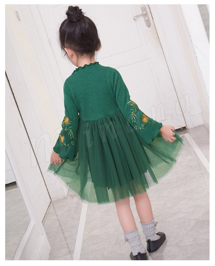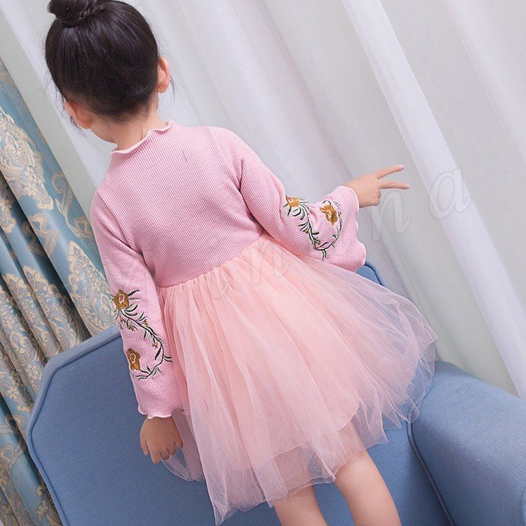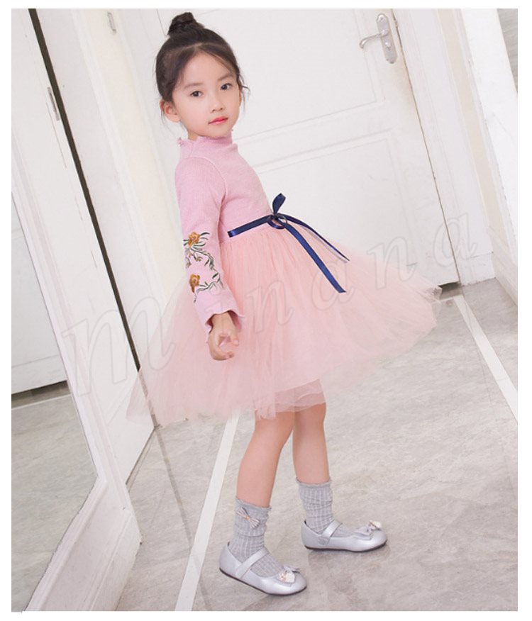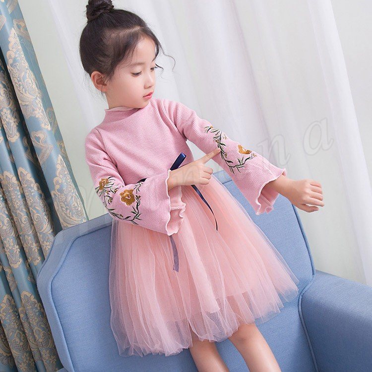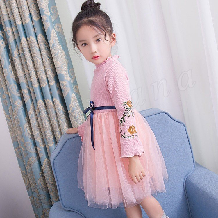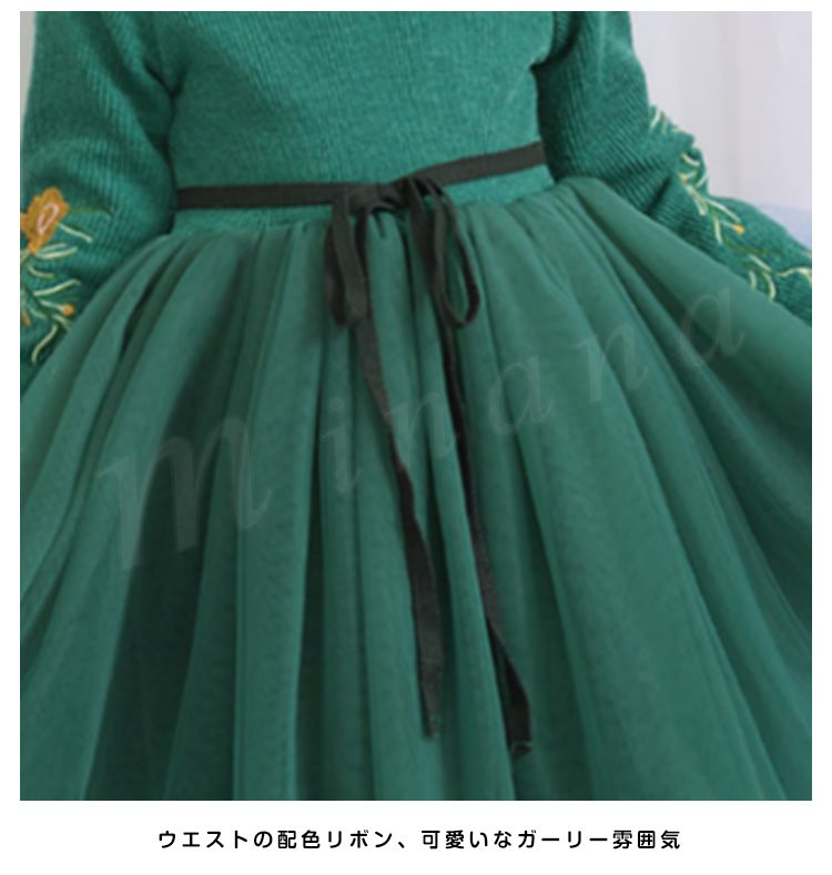 ニットトップスとチュールスカートのコーデ風キッズワンピース 女の子長袖ワンピース 子供服 チュール切り替えワンピース ハイネック フラワー 刺