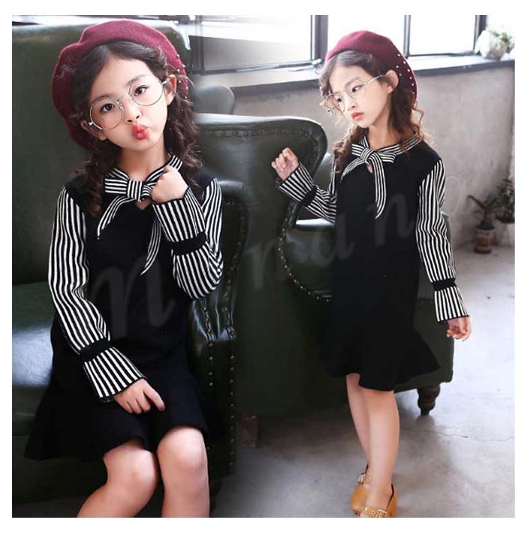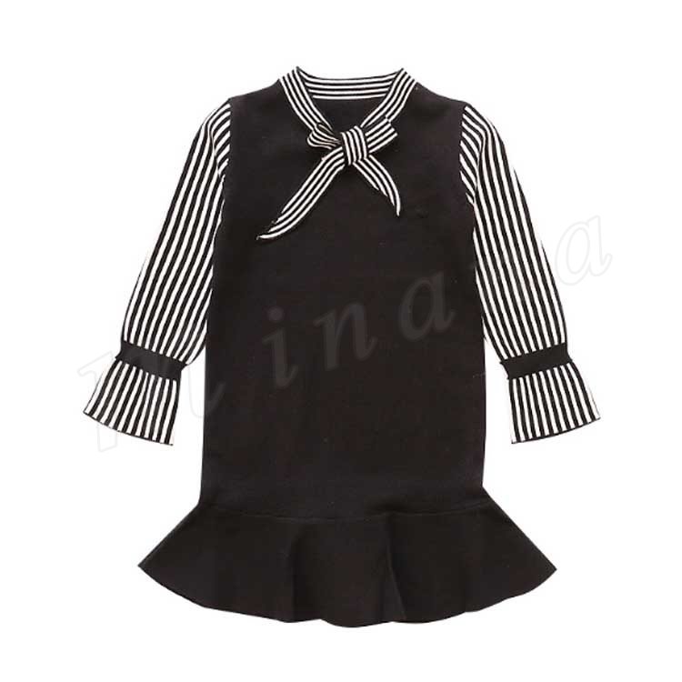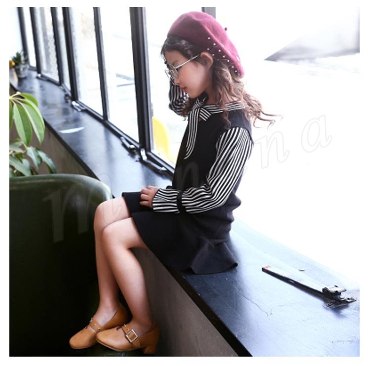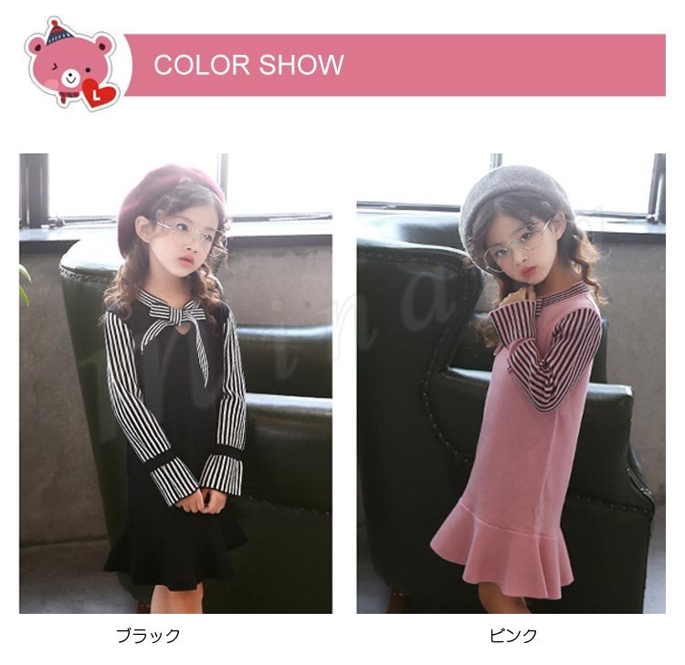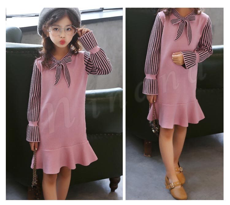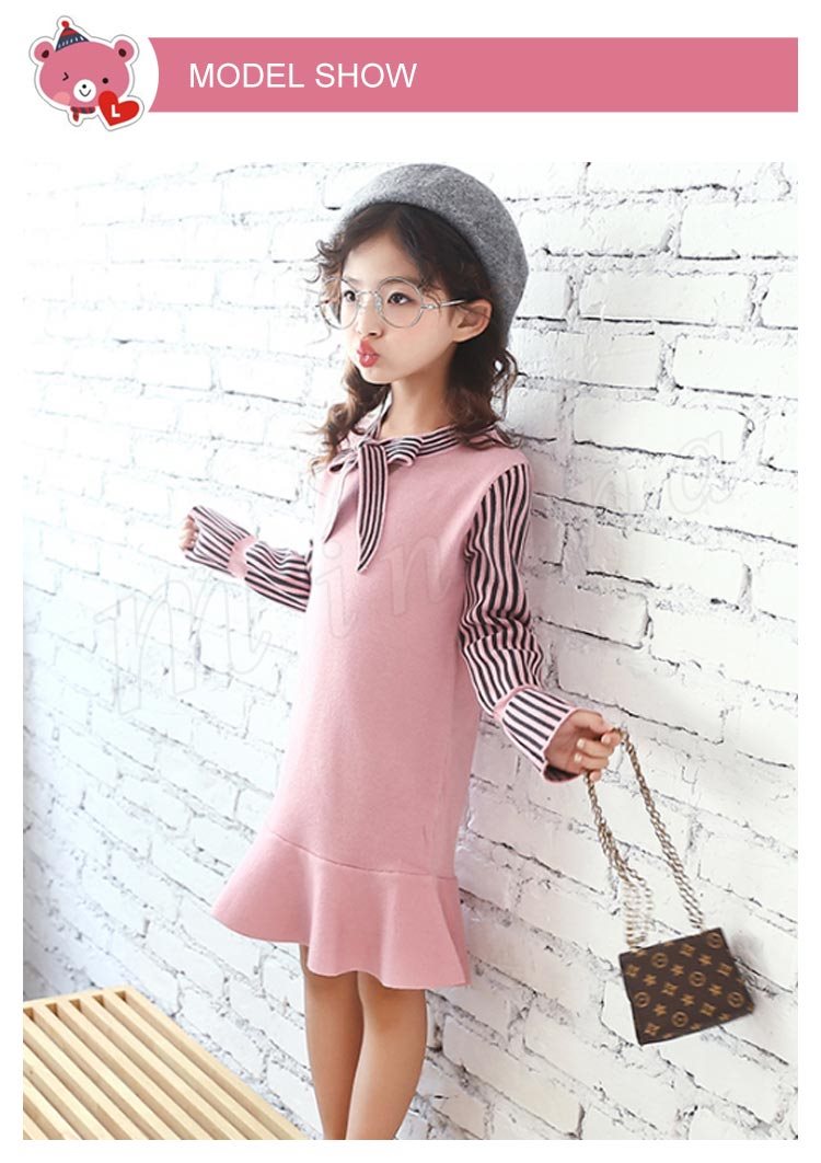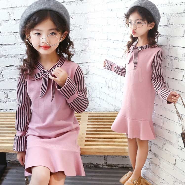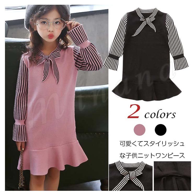 ニットワンピース/子供服/女の子/ショートワンピース/膝上丈ワンピース/ストライプ/長袖/Vネック/リボン付き/伸縮性/フレア裾/可愛い/カジ