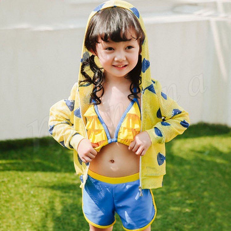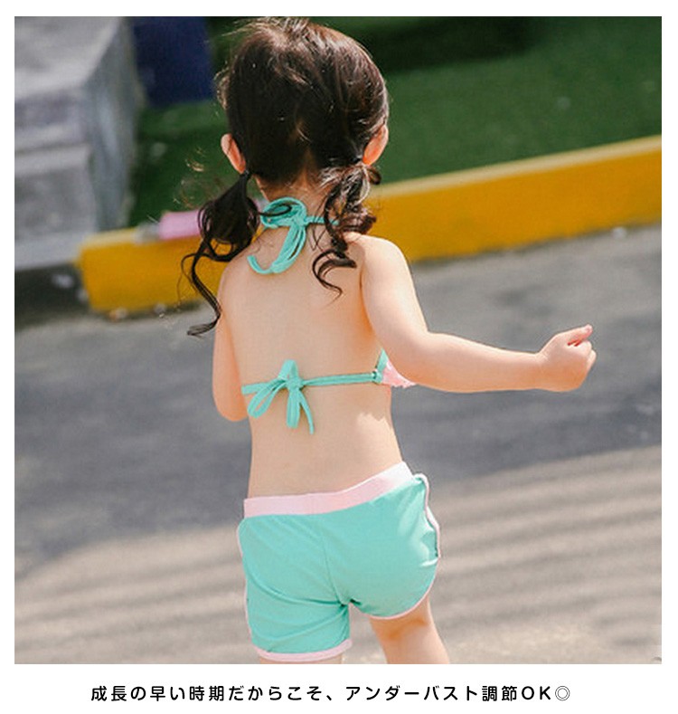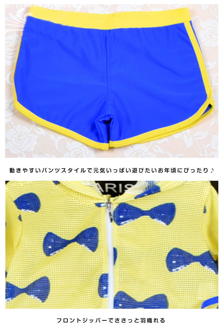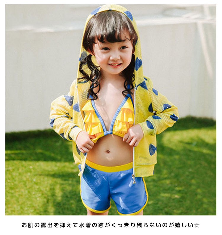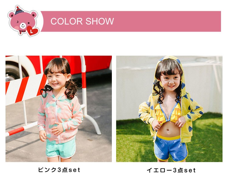 | 焼け対策に嬉しい可愛い水着登場♪ メッシュラッシュガードが付いた嬉しい3点セット。 お肌の露出を抑えて水着の跡がくっきり残らないのが嬉しい☆ 日焼け止めも少なく経済的◎ 成長の早い時期だからこそ、アンダーバスト調節OK◎ | |
