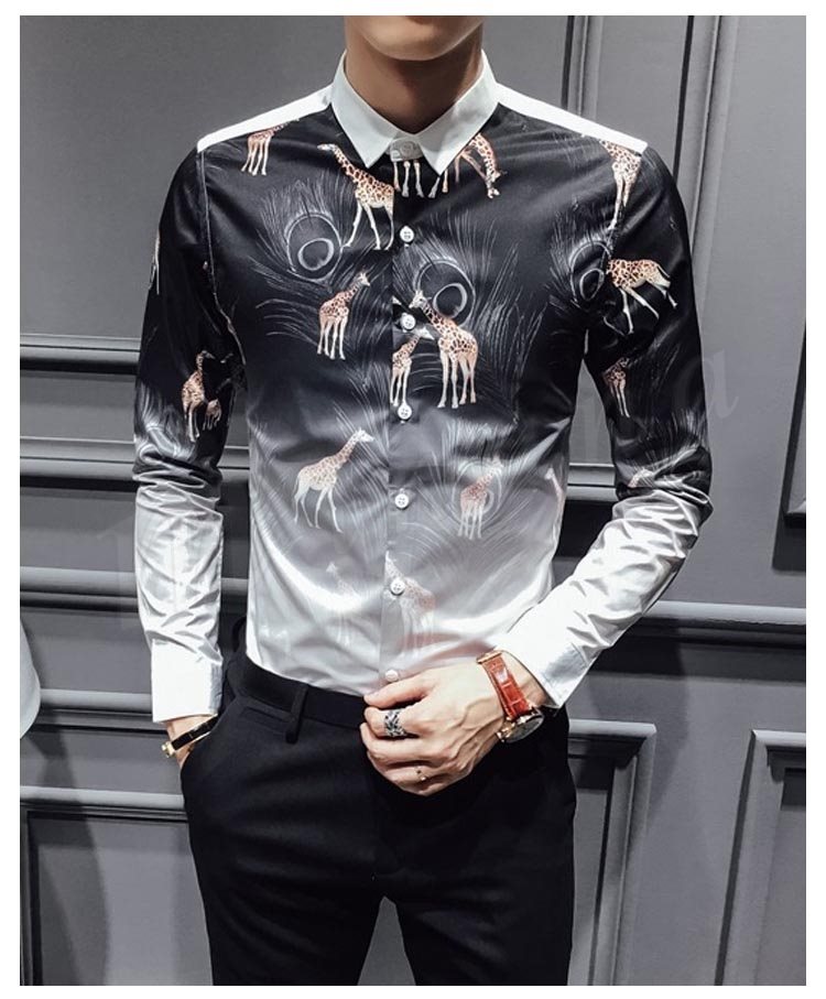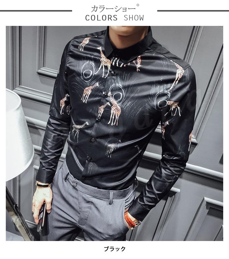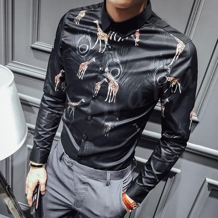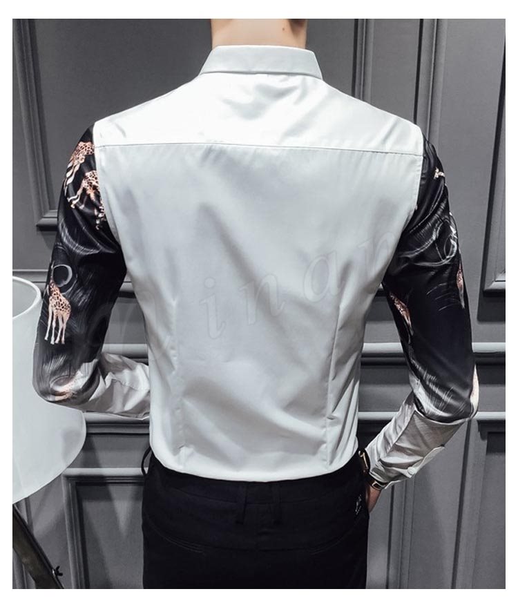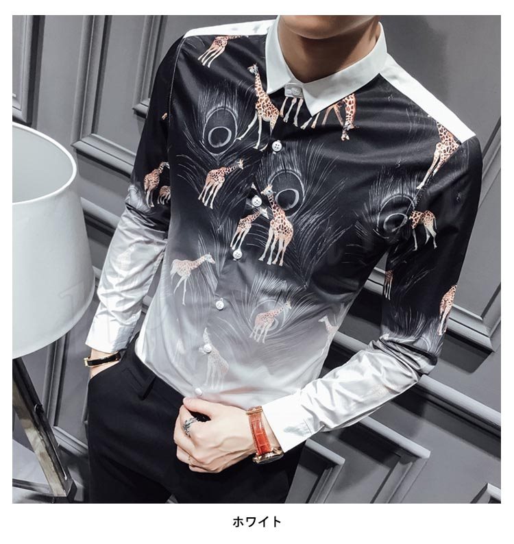 カジュアルシャツ メンズ トップス シャツ Yシャツ カラー切り替え プリント キリン 羽 カジュアル 長袖 メンズファッション